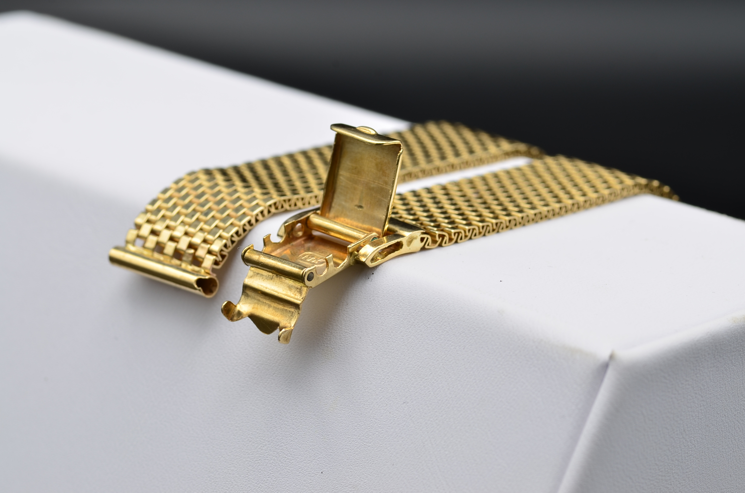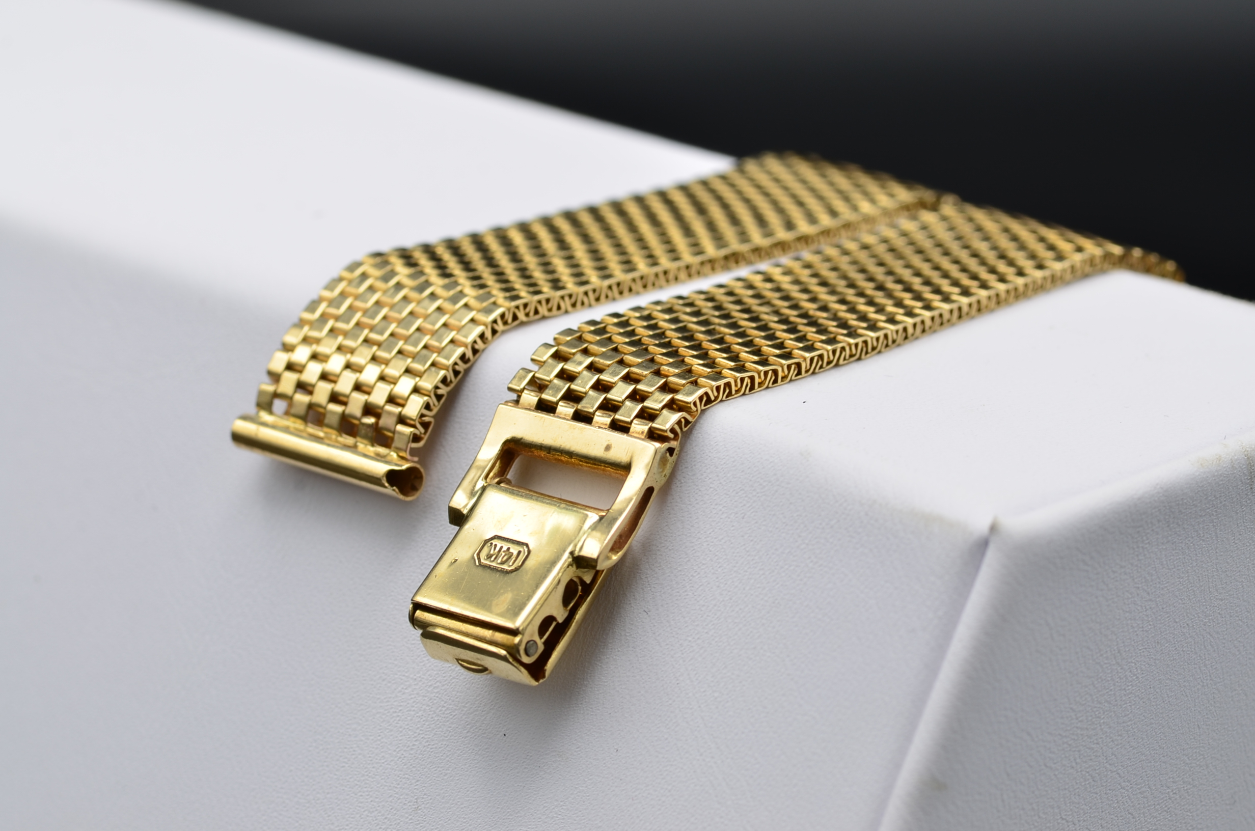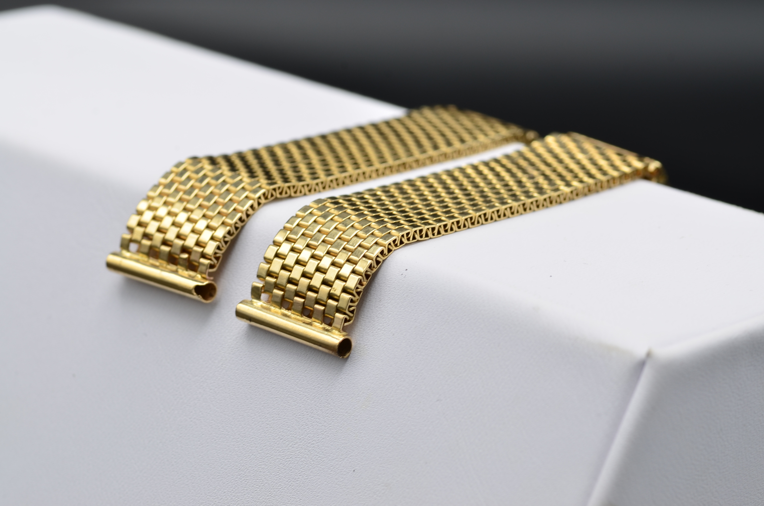14 Karat Yellow Gold Watch Straps. These silky smooth mesh style straps came off of a Patek Philippe watch, however we are not sure if they were original or not. The straps are marked 14 KT and feature a fold-over type clasp. Each strap measures 3 inches in length and 5/8″ in width.