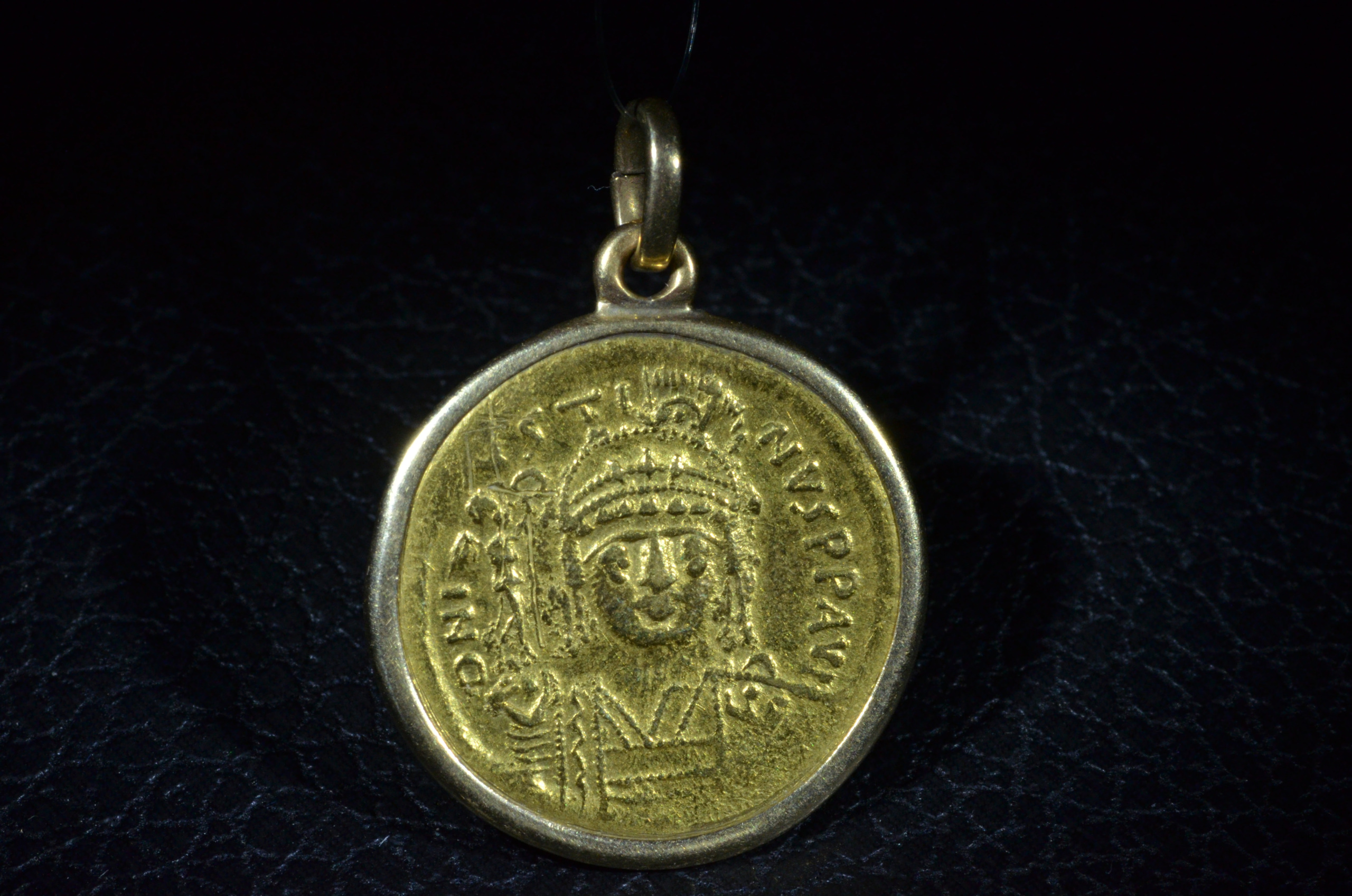 Ancient Byzantine Empire gold coin pendant depicting Justin II, 565 – 578 AD. Gold Solidus, Constantinople mint, 6th officina. Struck 567 – 578 AD.