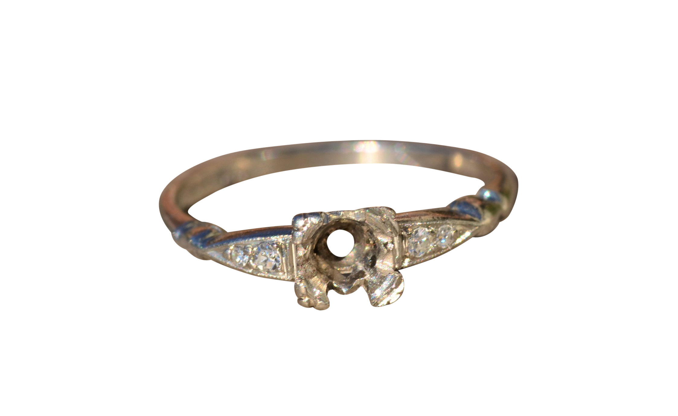 Antique Platinum and Diamond Semi-Mount. This mounting features 0.06 carats in diamonds and is a finger size 5.5.