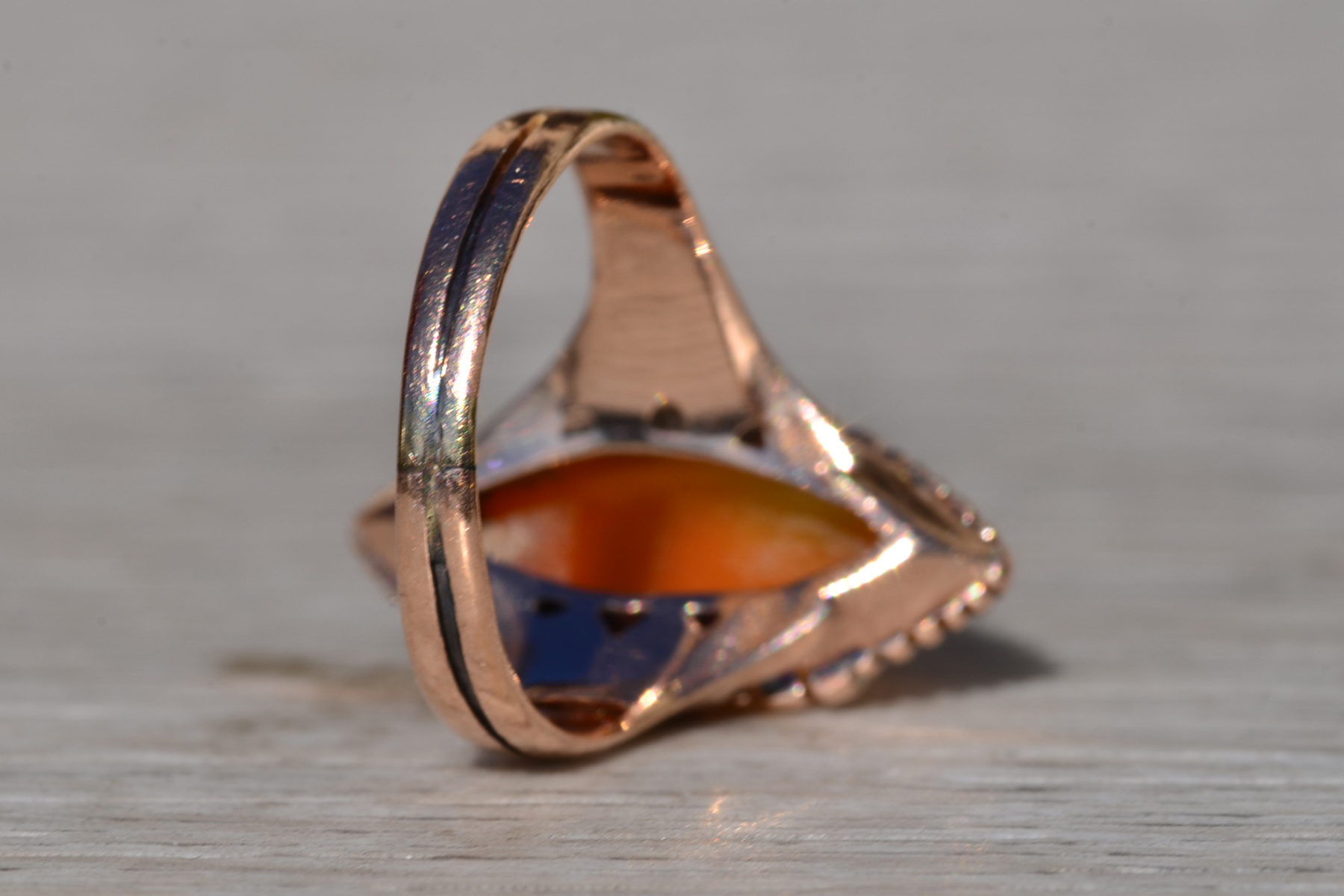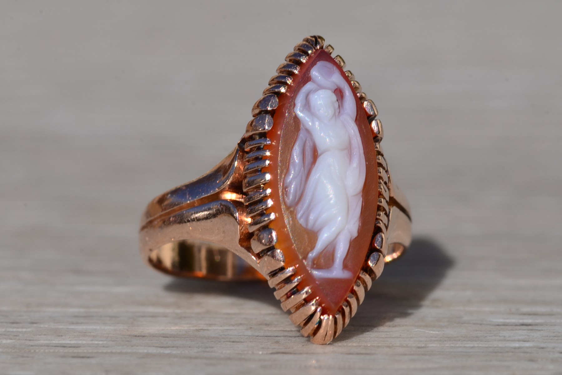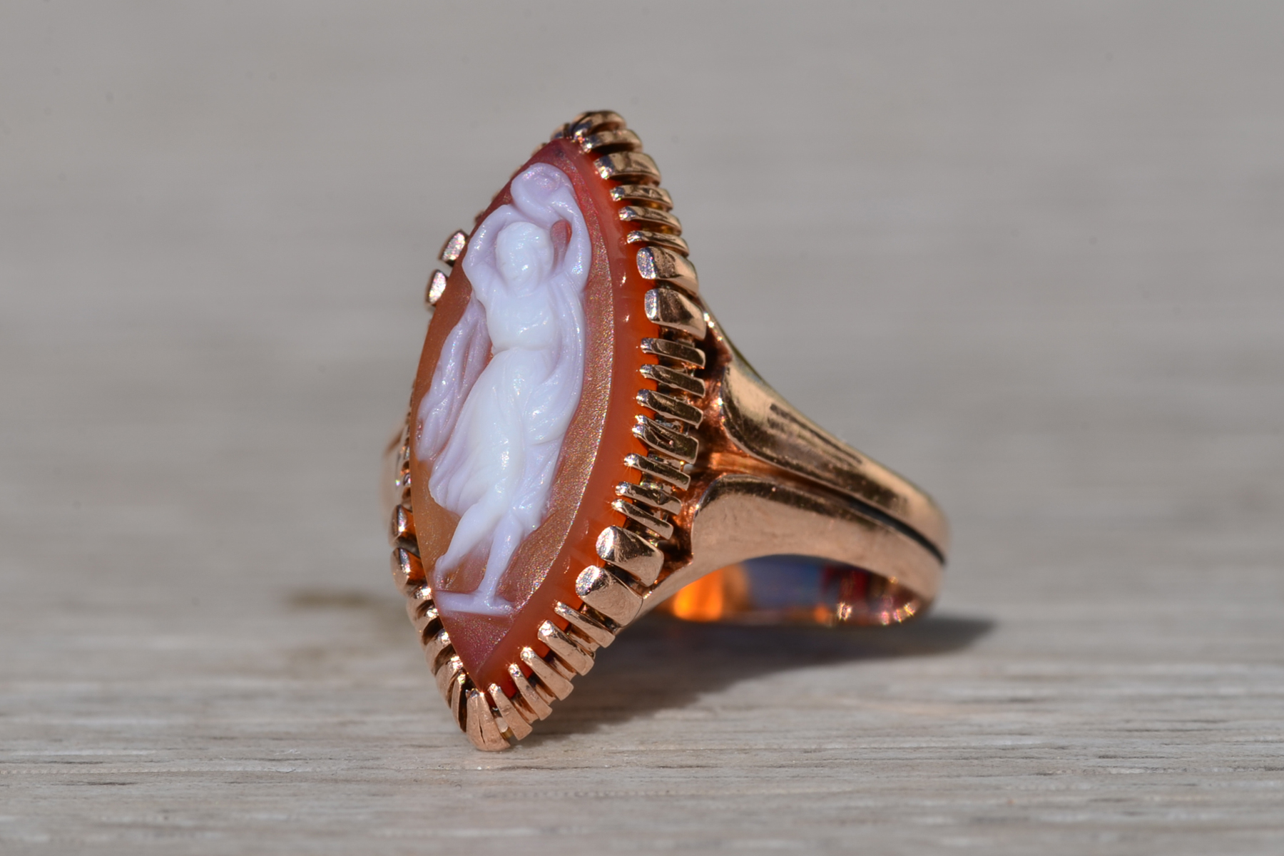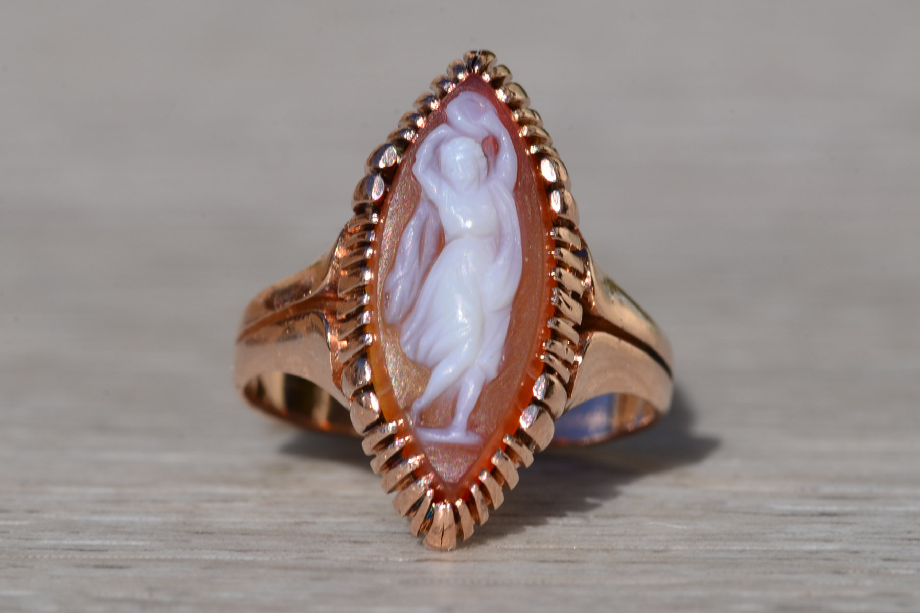The Thana: Antique Victorian 14K Rose Gold Navette Shaped Cameo Ring. Crafted in 14 karat rose gold, this ladies’ ring centers on a beautifully hand carved cameo. Navette in shape, this ring measures 20.3mm from North to South, making a bold statement without being over the top in size! The ring is currently a finger size 6.25, however we are able to resize it to fit your needs for an additional fee.