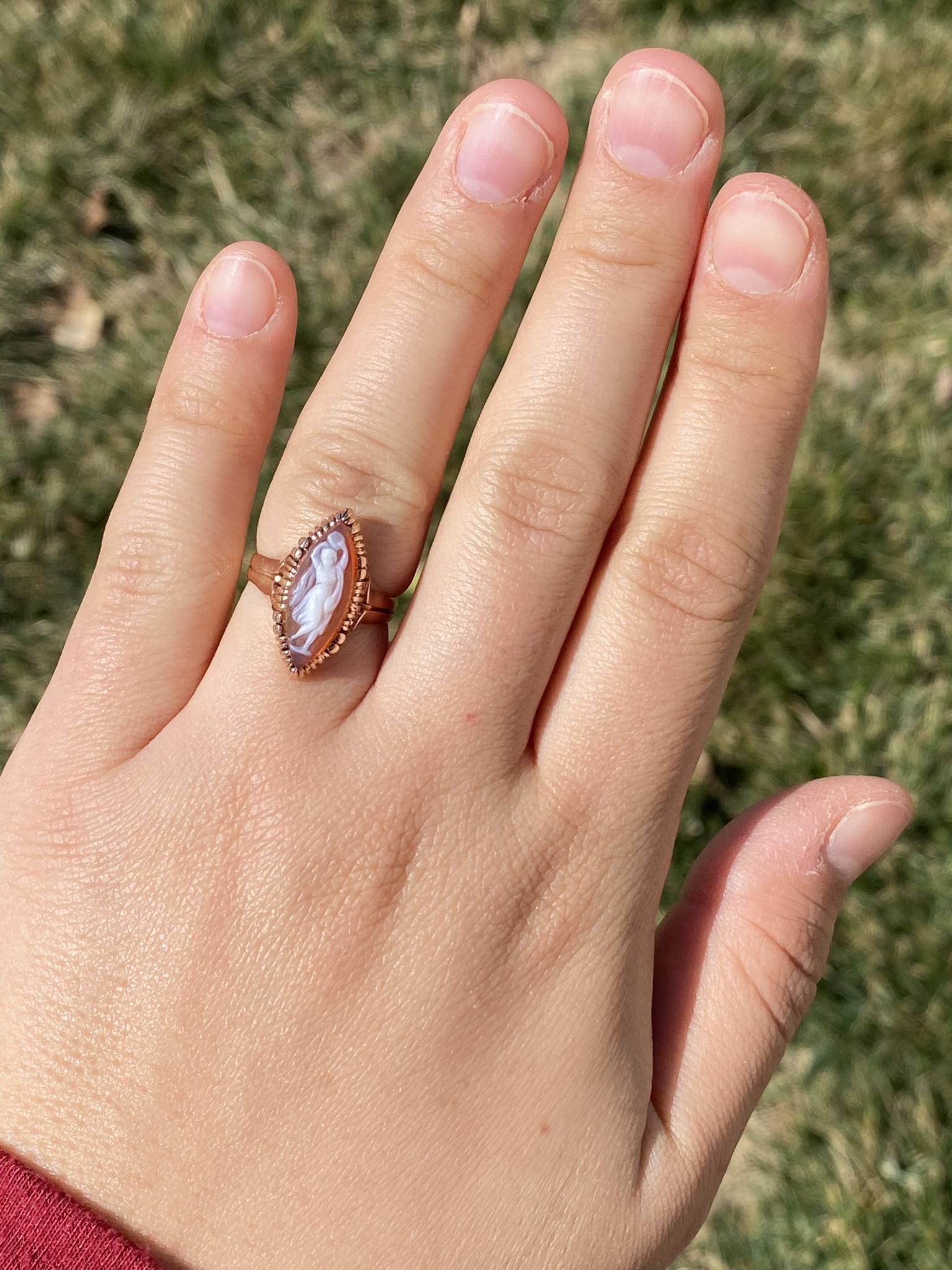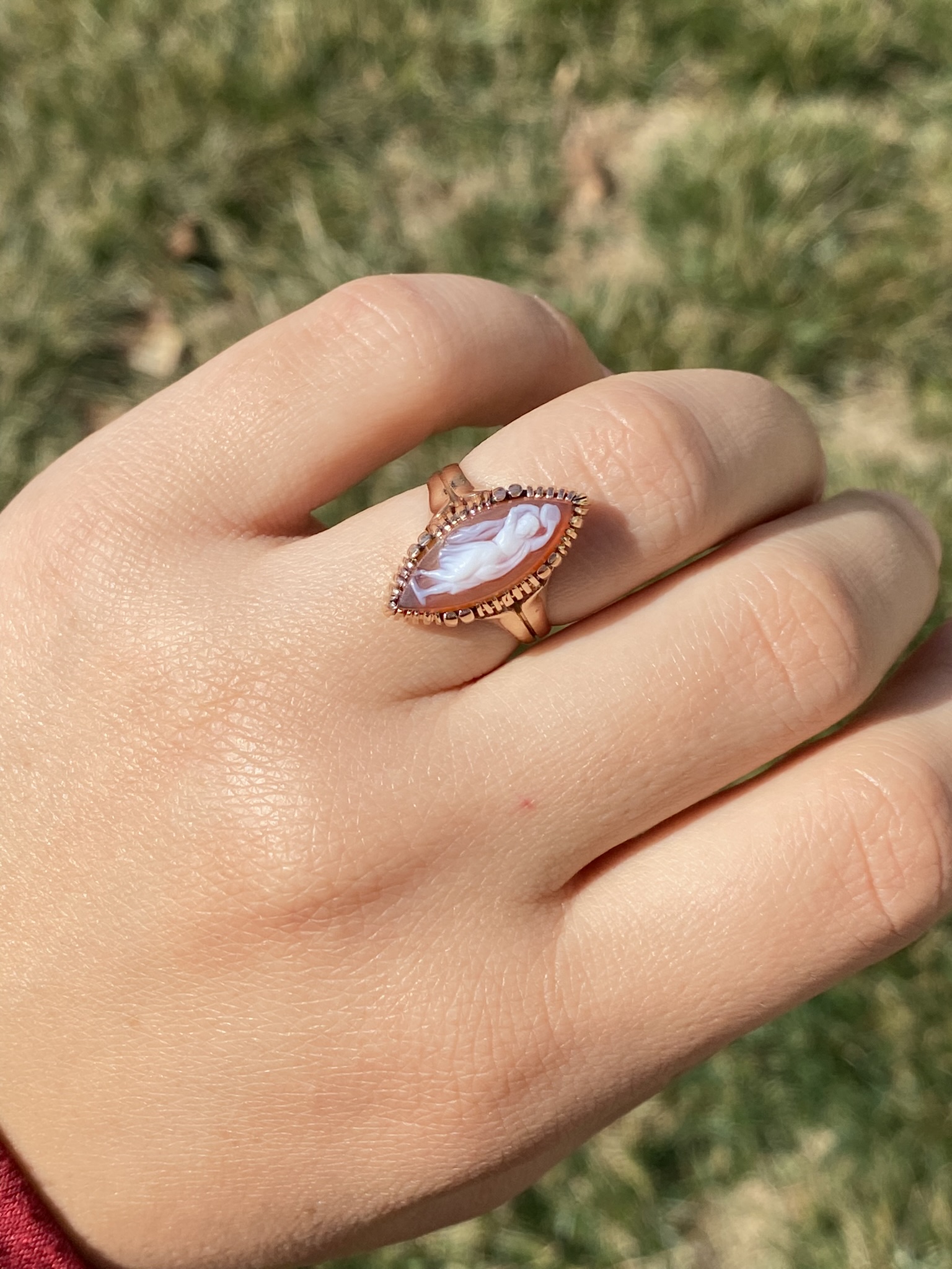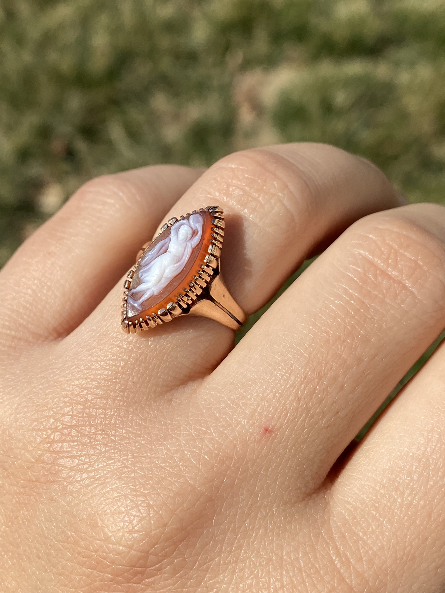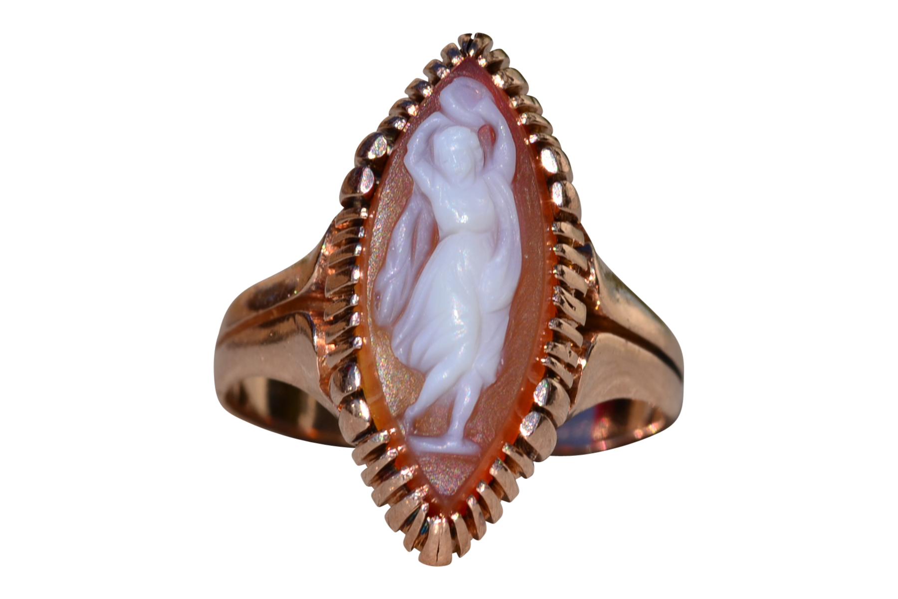 The Thana: Antique Victorian 14K Rose Gold Navette Shaped Cameo Ring. Crafted in 14 karat rose gold, this ladies’ ring centers on a beautifully hand carved cameo. Navette in shape, this ring measures 20.3mm from North to South, making a bold statement without being over the top in size! The ring is currently a finger size 6.25, however we are able to resize it to fit your needs for an additional fee.