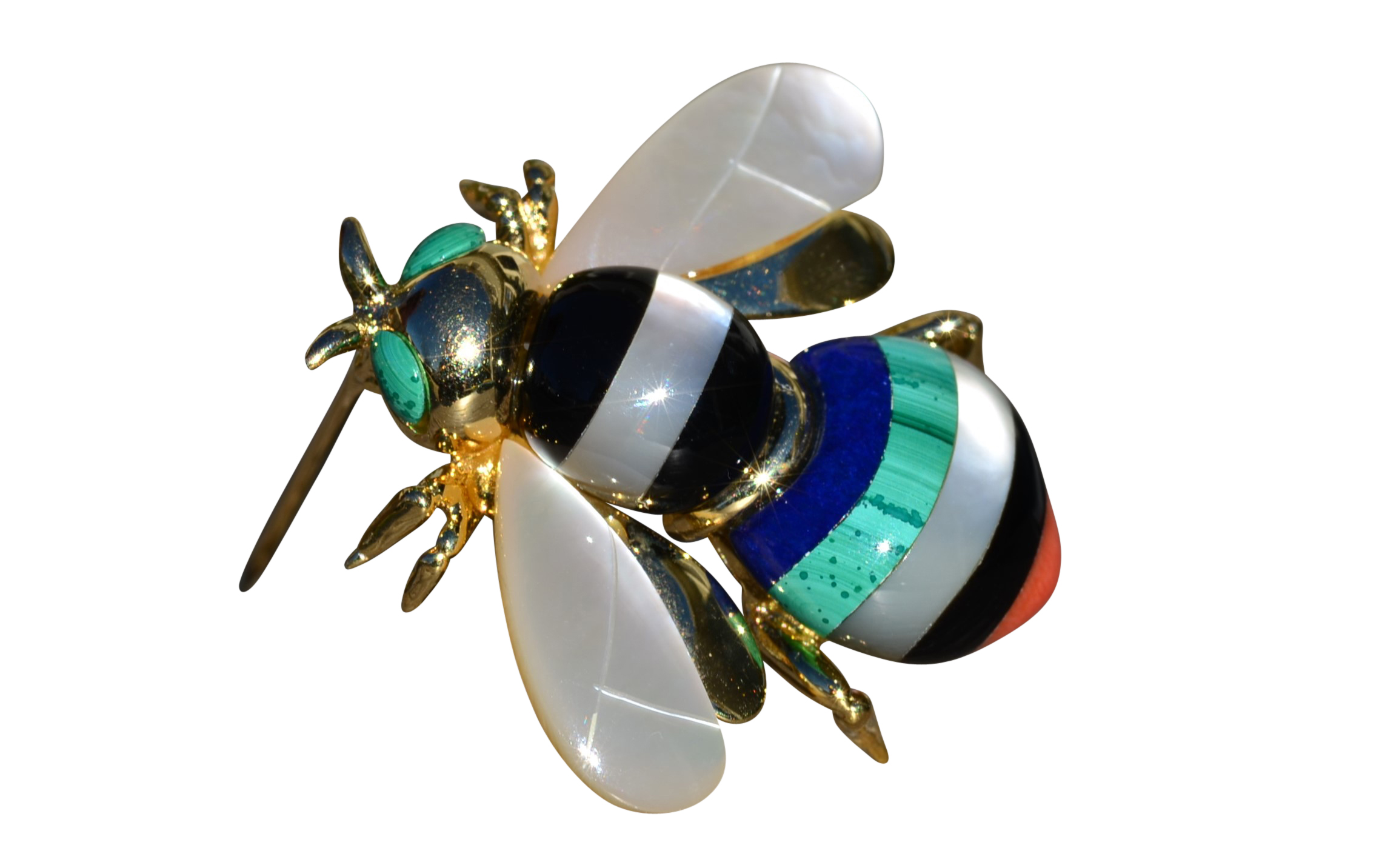 Asch Grossbardt Signed 14K Yellow Gold Bee Brooch set with Mother of Pearl, Onyx, Coral, Malachite. Measuring 1.25 inches in length, this multi stone brooch can be worn as a pin/brooch or a pendant. The piece is signed by the maker, Asch Grossbardt.
