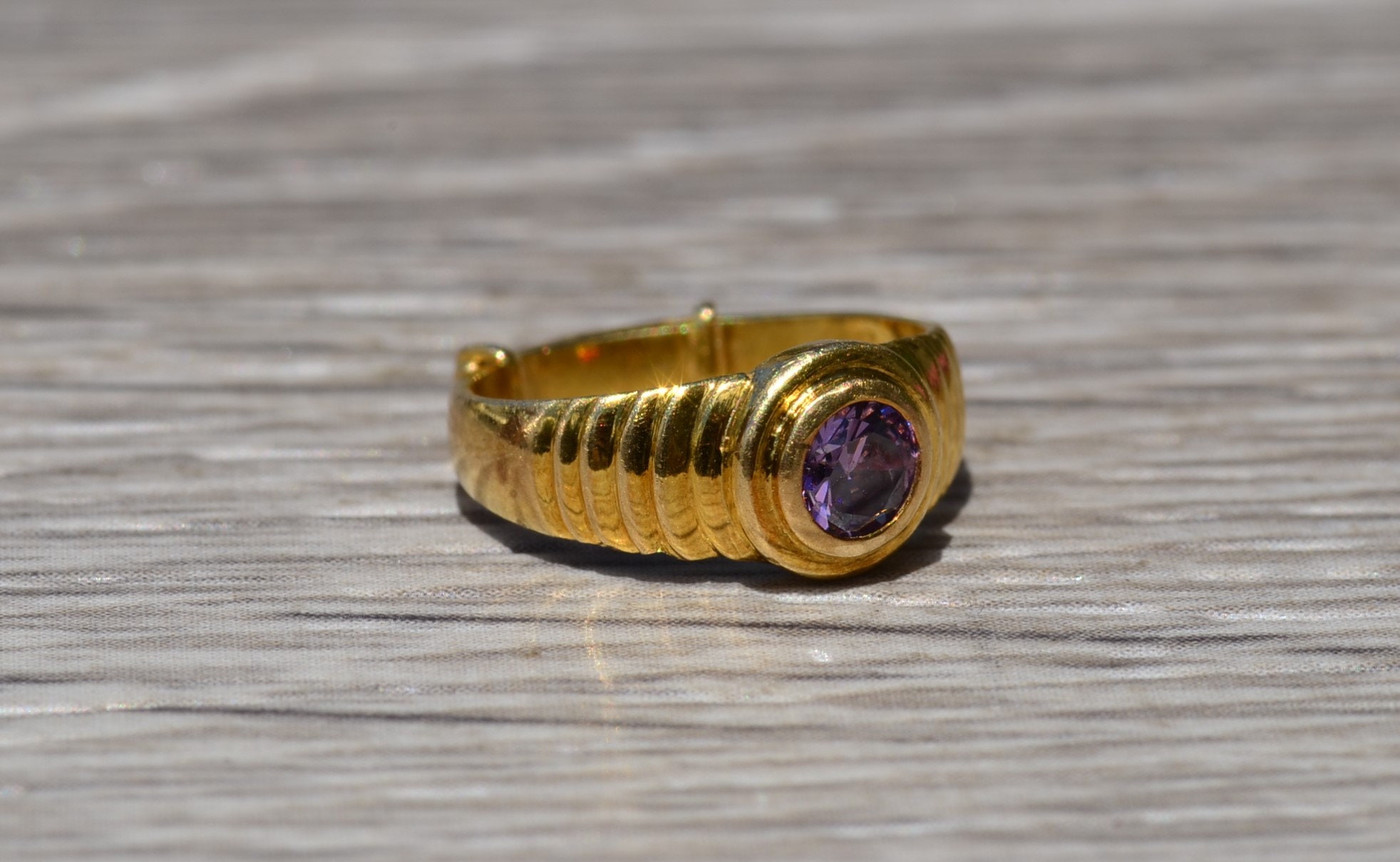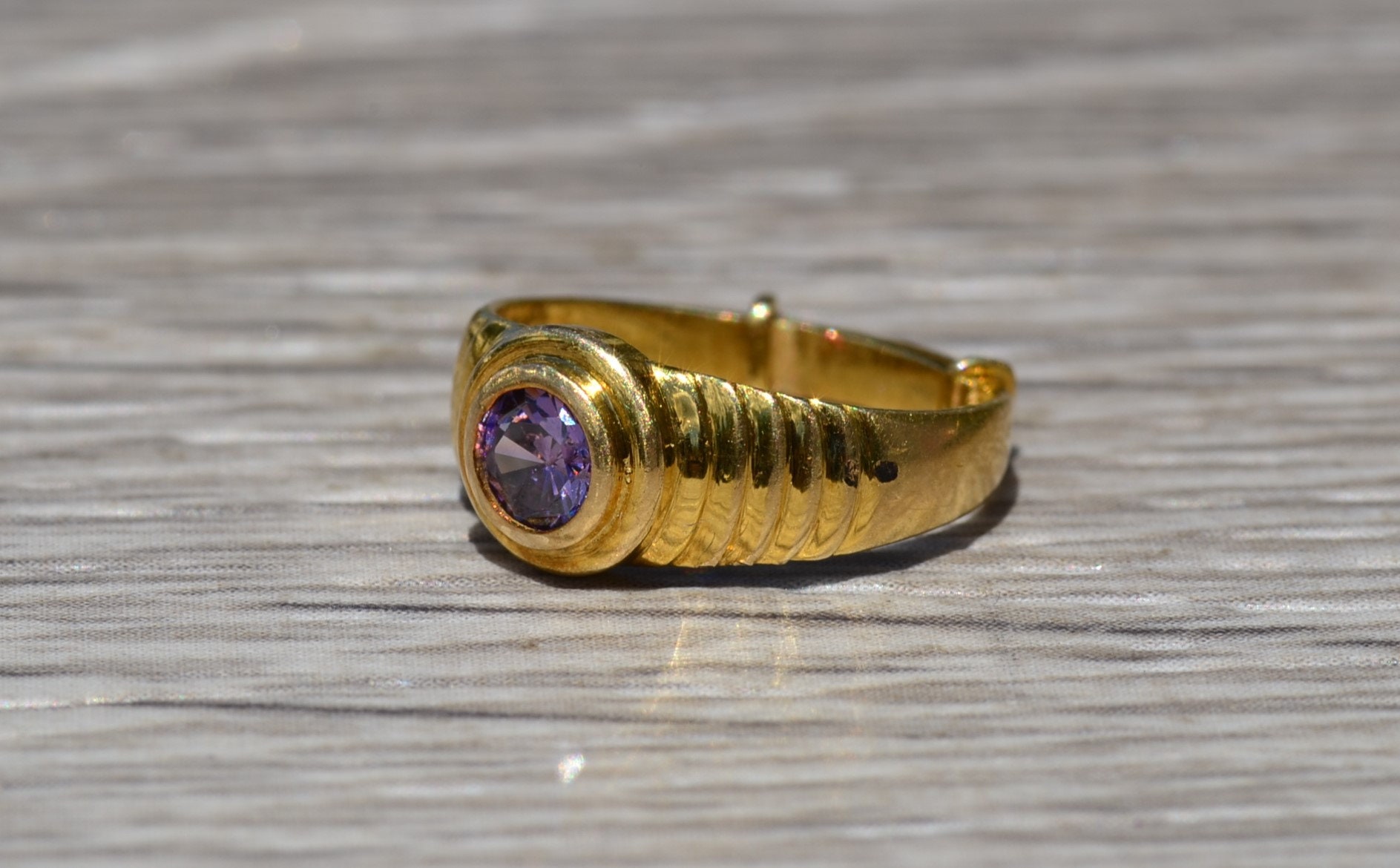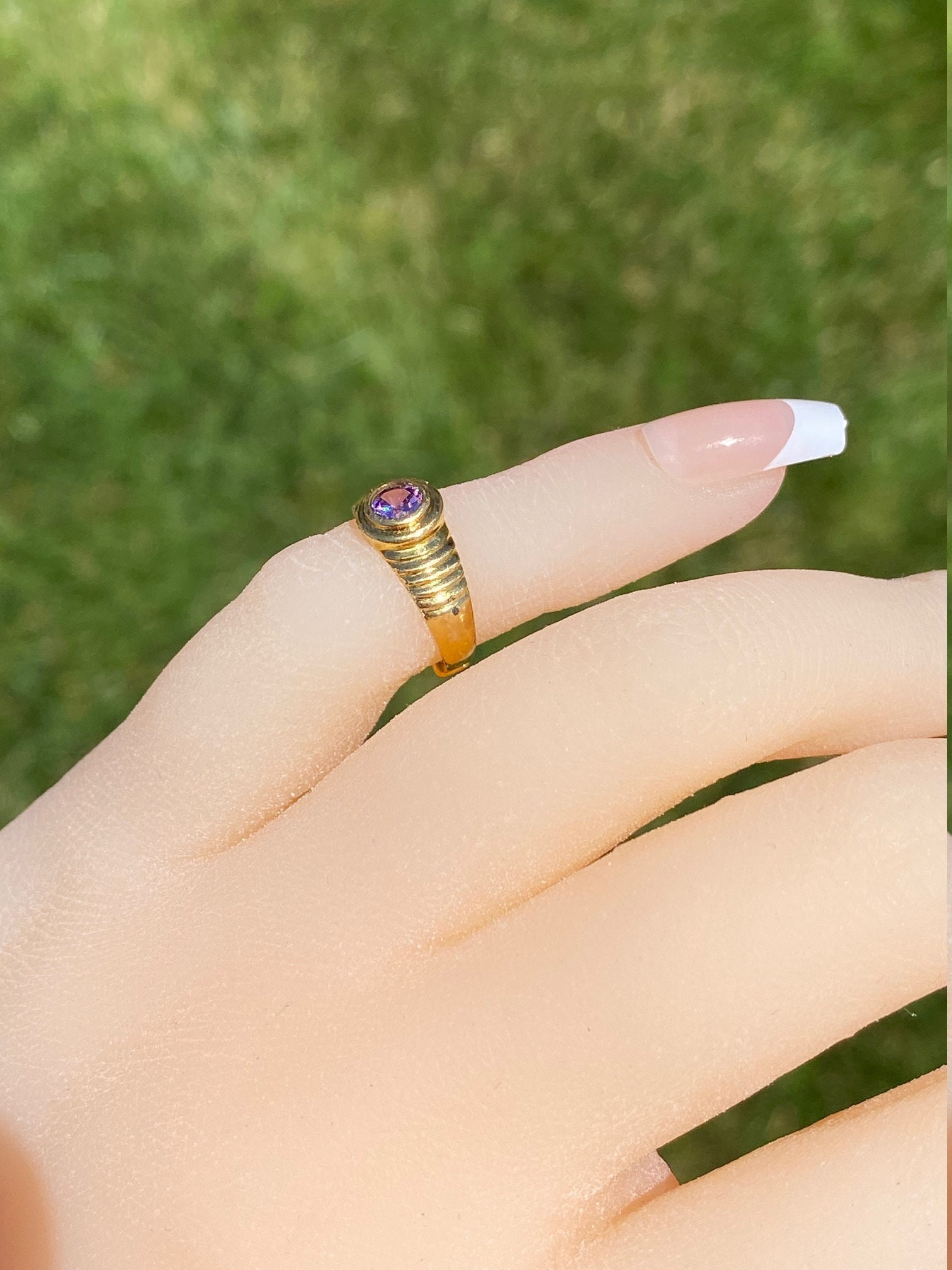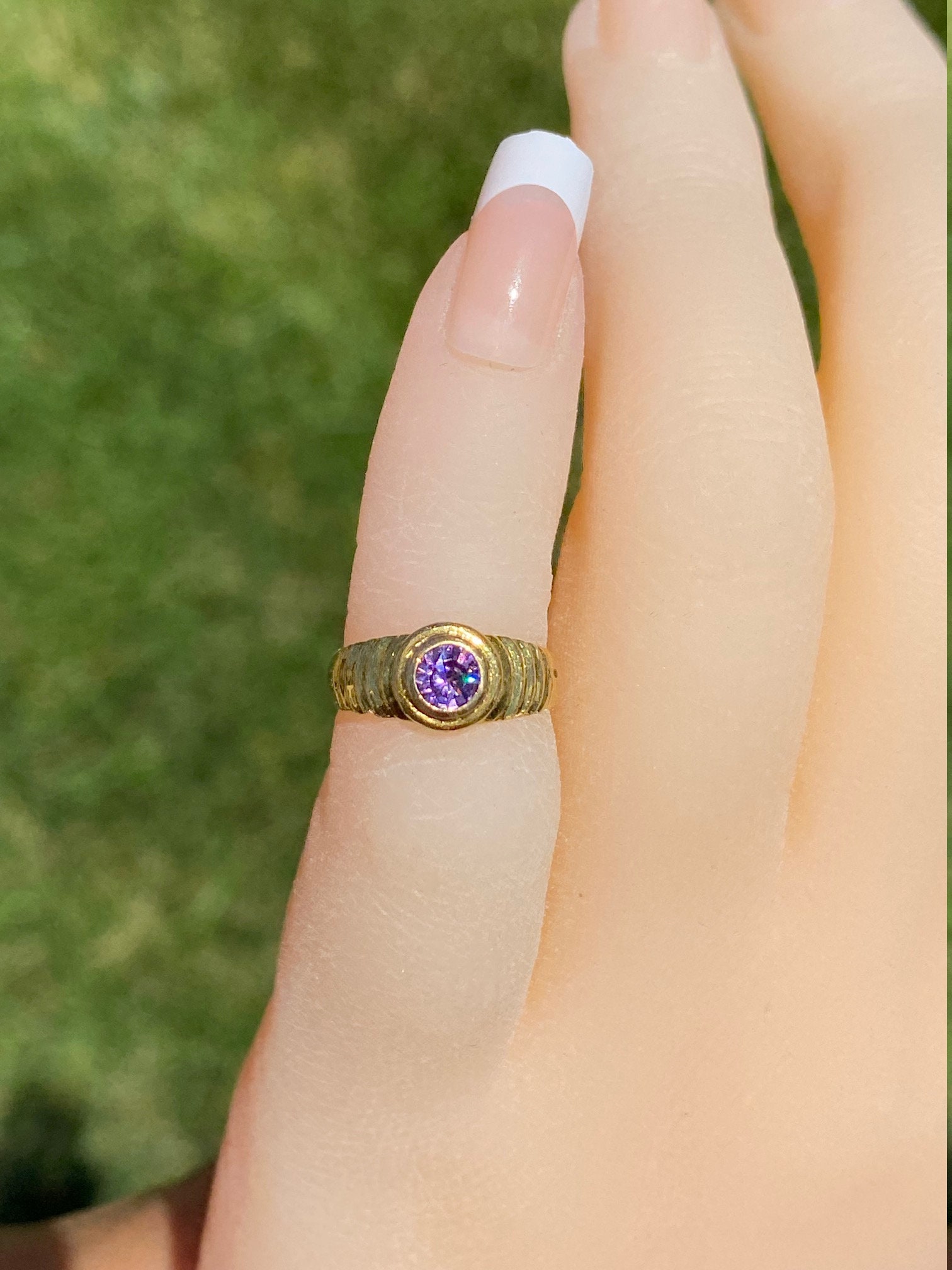 Children’s 18K Yellow Gold Ring set with Purple Cubic Zirconia. This petite child’s ring is crafted in 18 karat yellow gold and features a bezel set purple cubic zirconia. This ring is currently a very small size.
