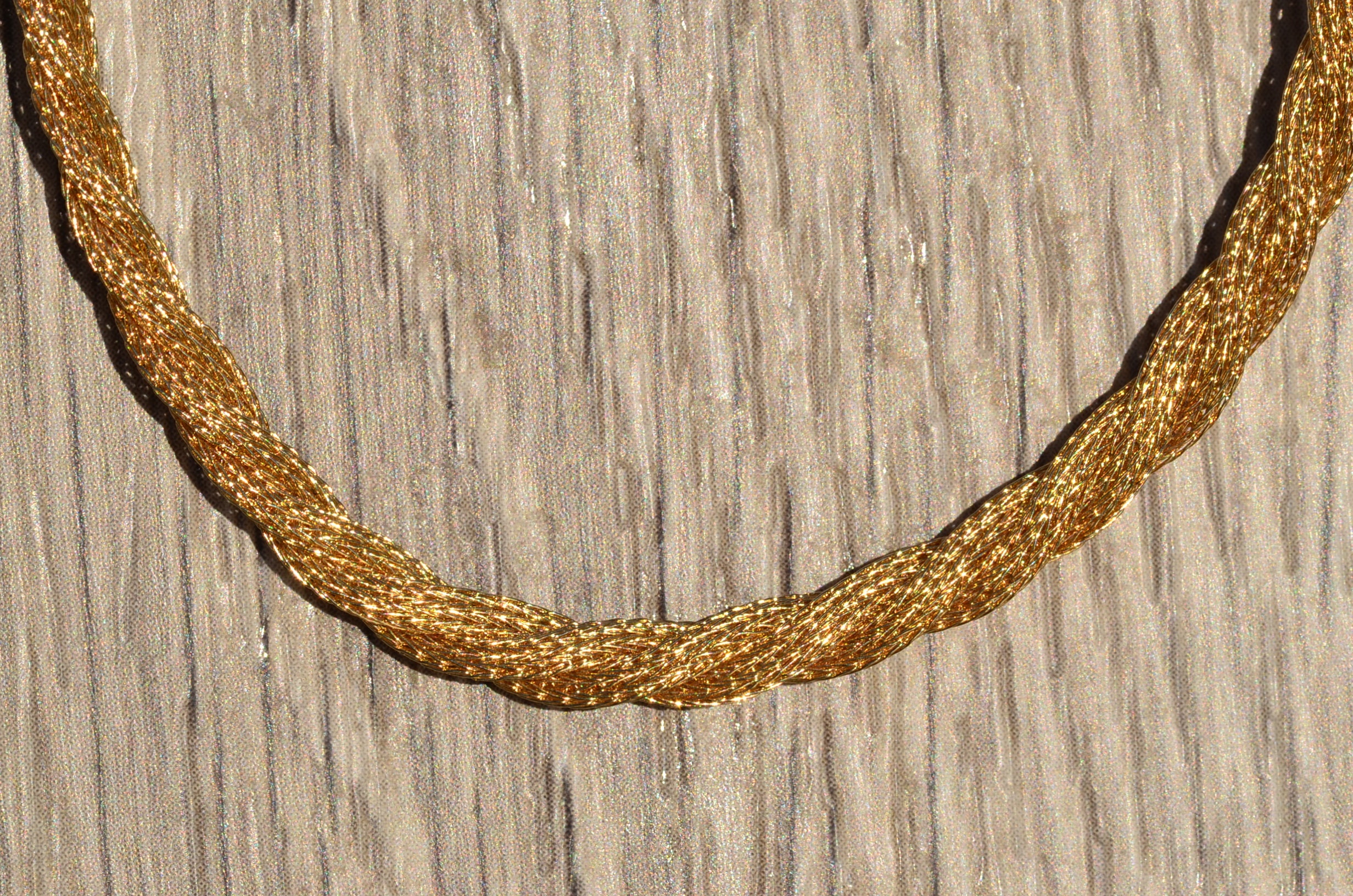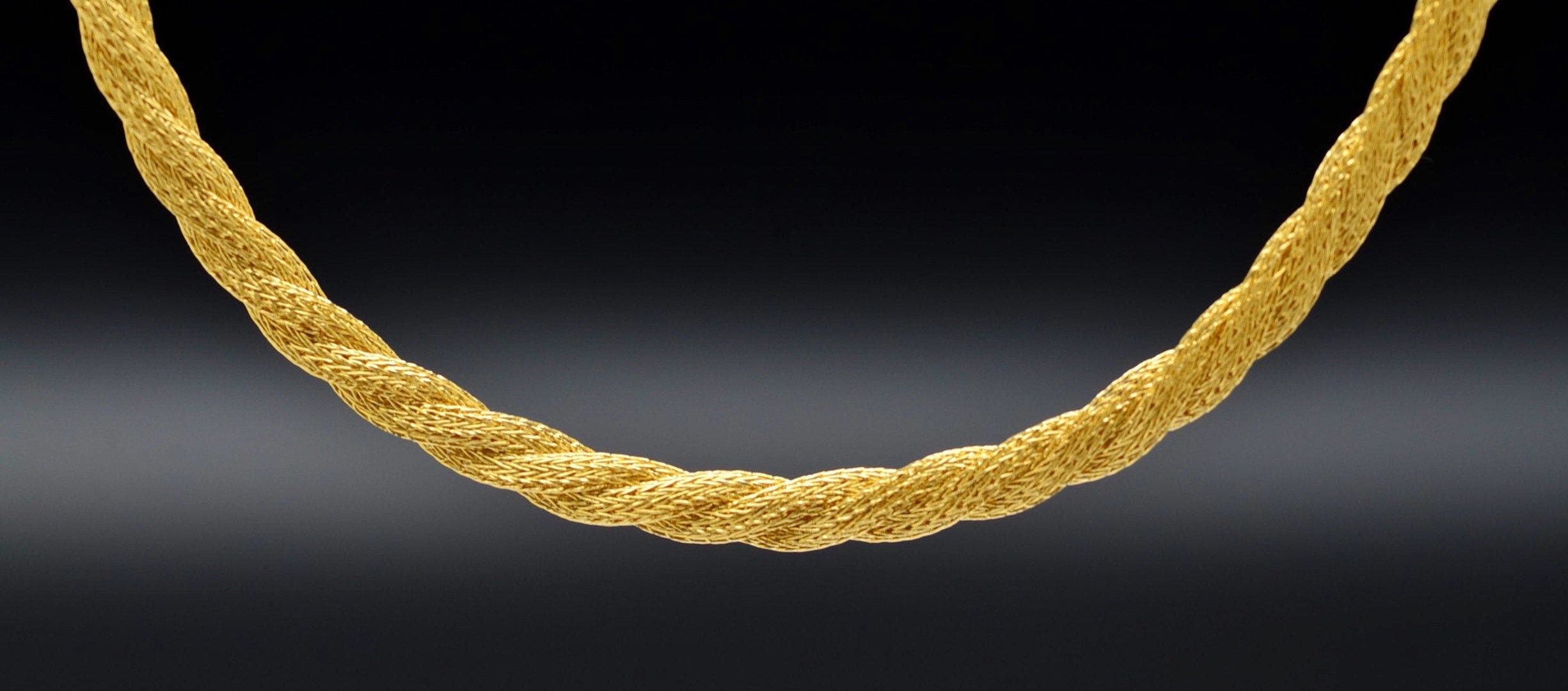 Ladies 14 Karat Yellow Gold Twisted Mesh Style Necklace. Measuring 18 inches in length, this silky smooth necklace is delicately crafted in 14 karat yellow gold. Browse on our shop for the matching bracelet to complete the look!