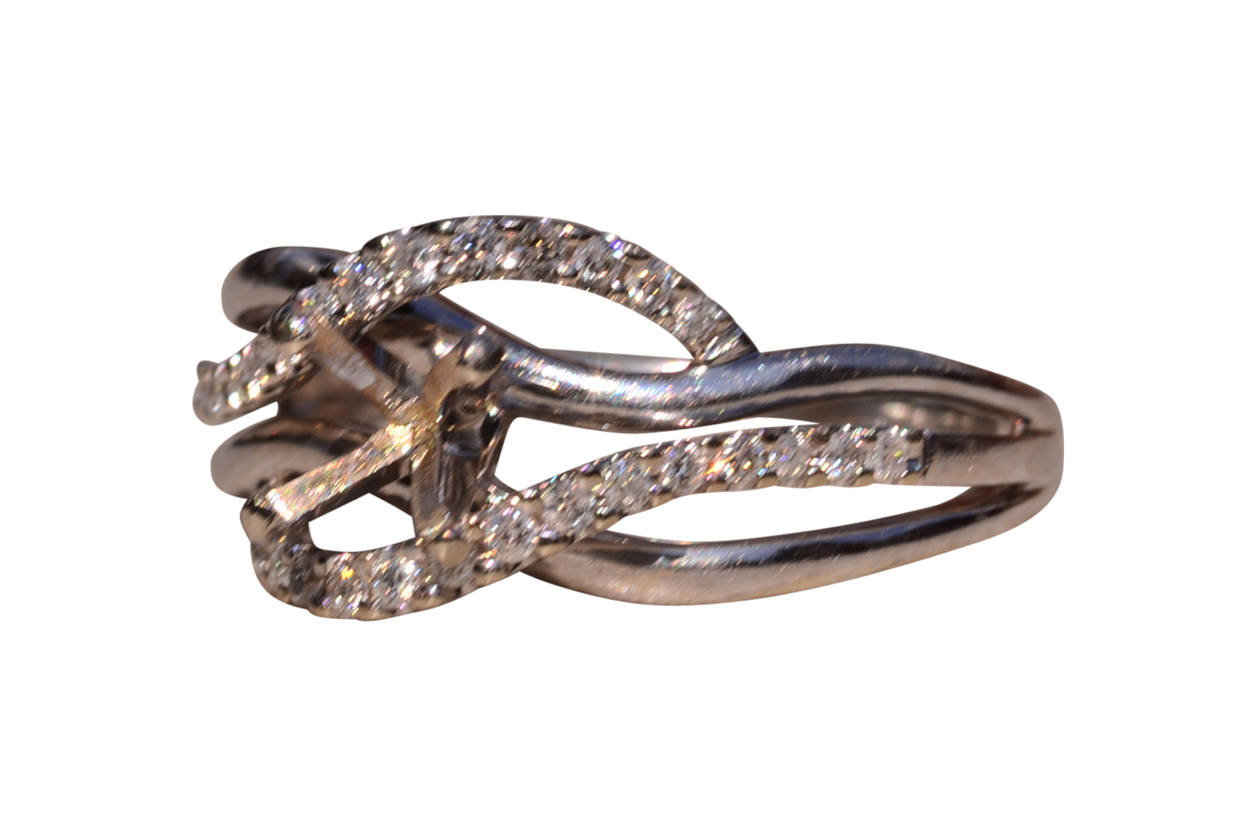 Ladies 14K White Gold Double Bypass Semi-Mount. This semi-mount is crafted in 14 karat white gold and features a double bypass style design. A total of 0.30 carats of round brilliant cut diamonds accent this mounting. Currently a finger size 7.25.