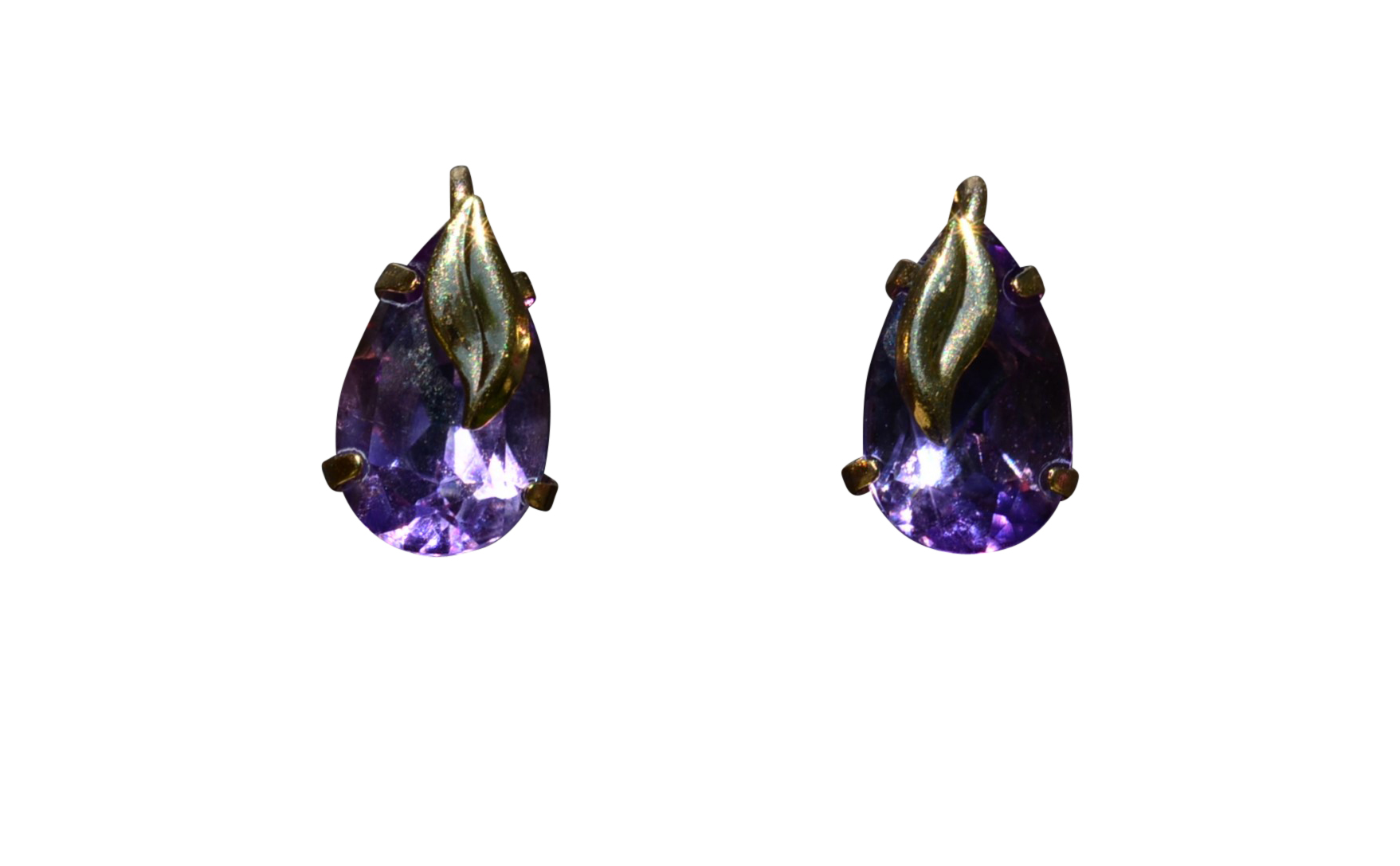 Ladies 14K Yellow Gold Amethyst Tear Drop Stud Earrings. Crafted in 14 karat yellow gold, these simple earrings feature pear shaped amethyst accented by a yellow gold leaf draped over top. These earrings are complete with standard posts and push style backings.