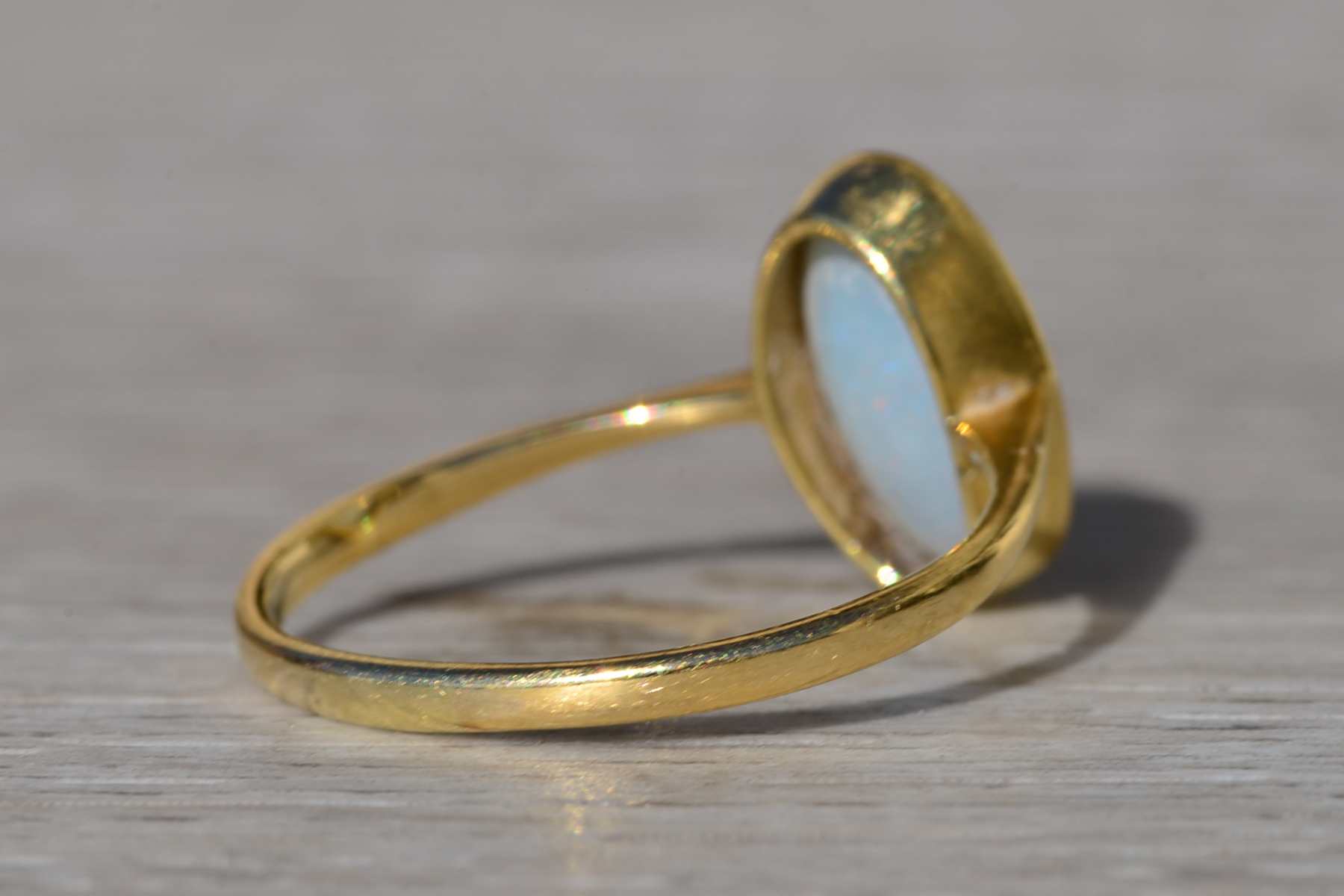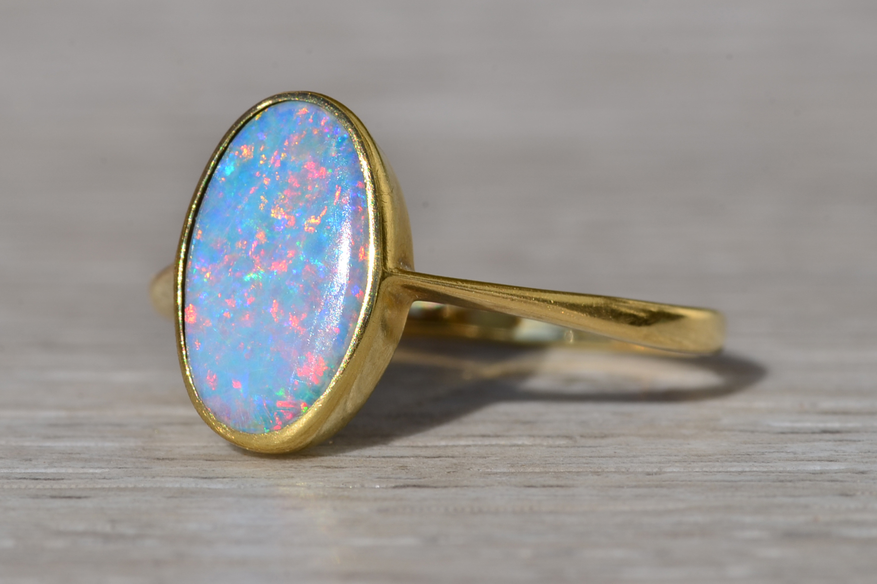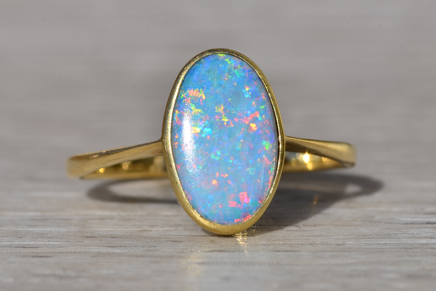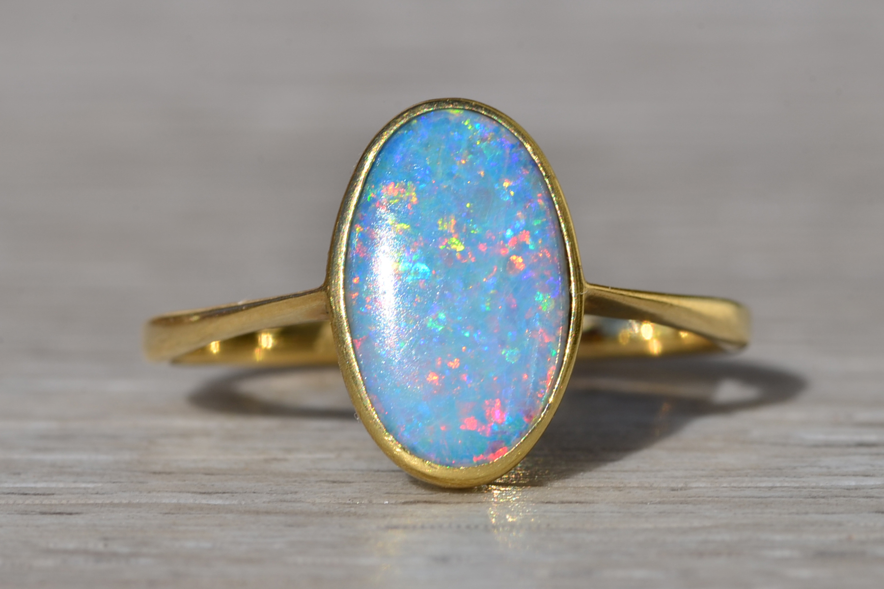 The Renton: Ladies 18K Gold Ring set with 2.25 CT Australian Opal. Crafted in durable 18 karat yellow gold, this statement ring centers on a 2.25 carat Australian opal. The opal exhibits stunning play of color and measures 13.5mm x 8.6mm in size. The ring’s bezel setting and simple tapered shank gives all the focus on the center stone. Currently the ring is a finger size 9.25 and is able to be resized for an additional fee upon request.