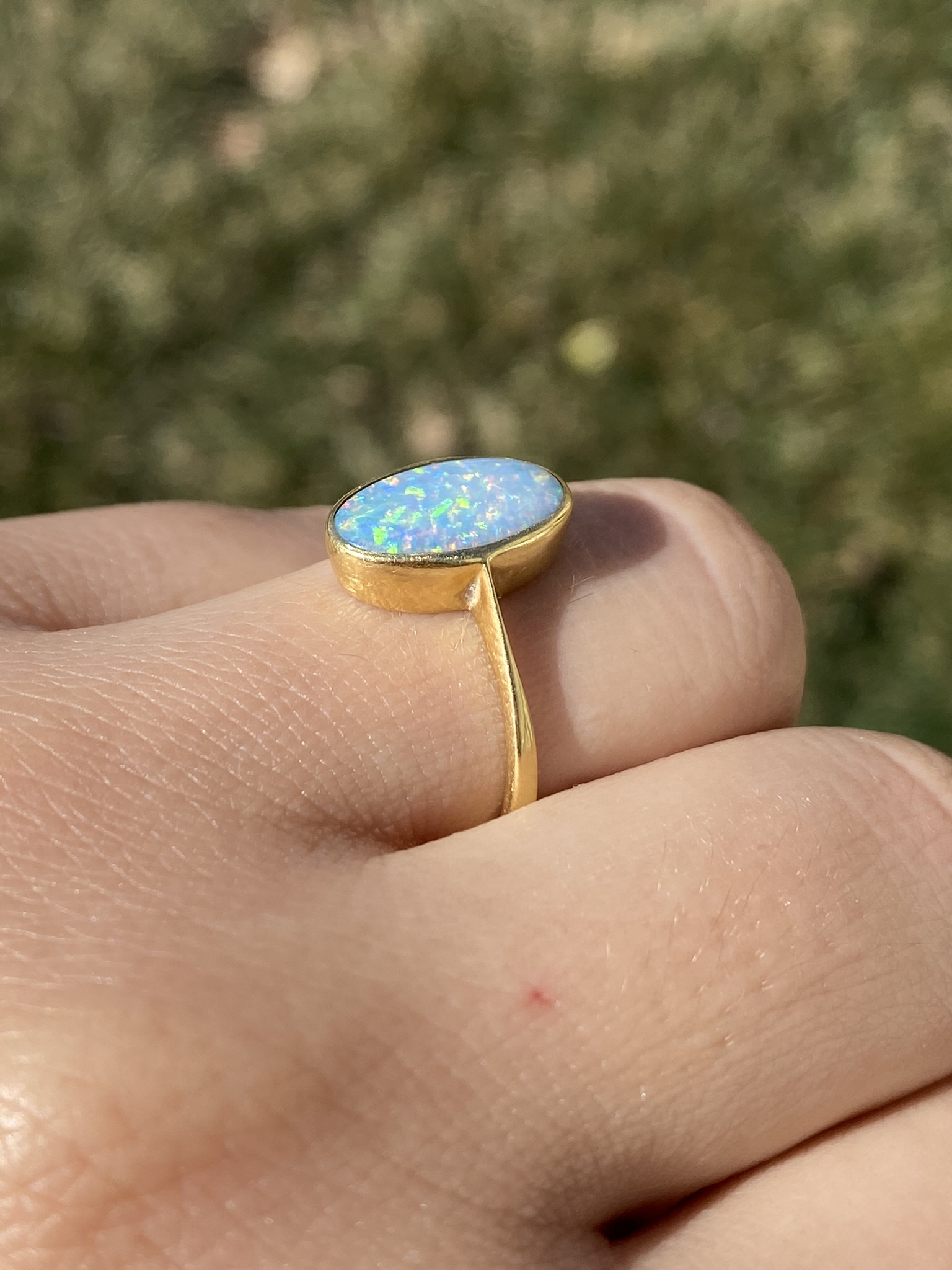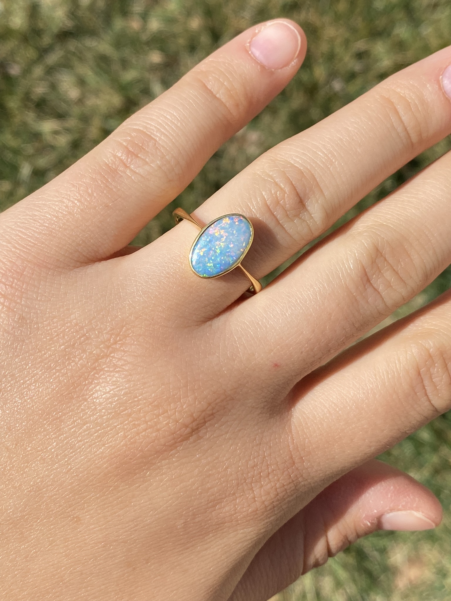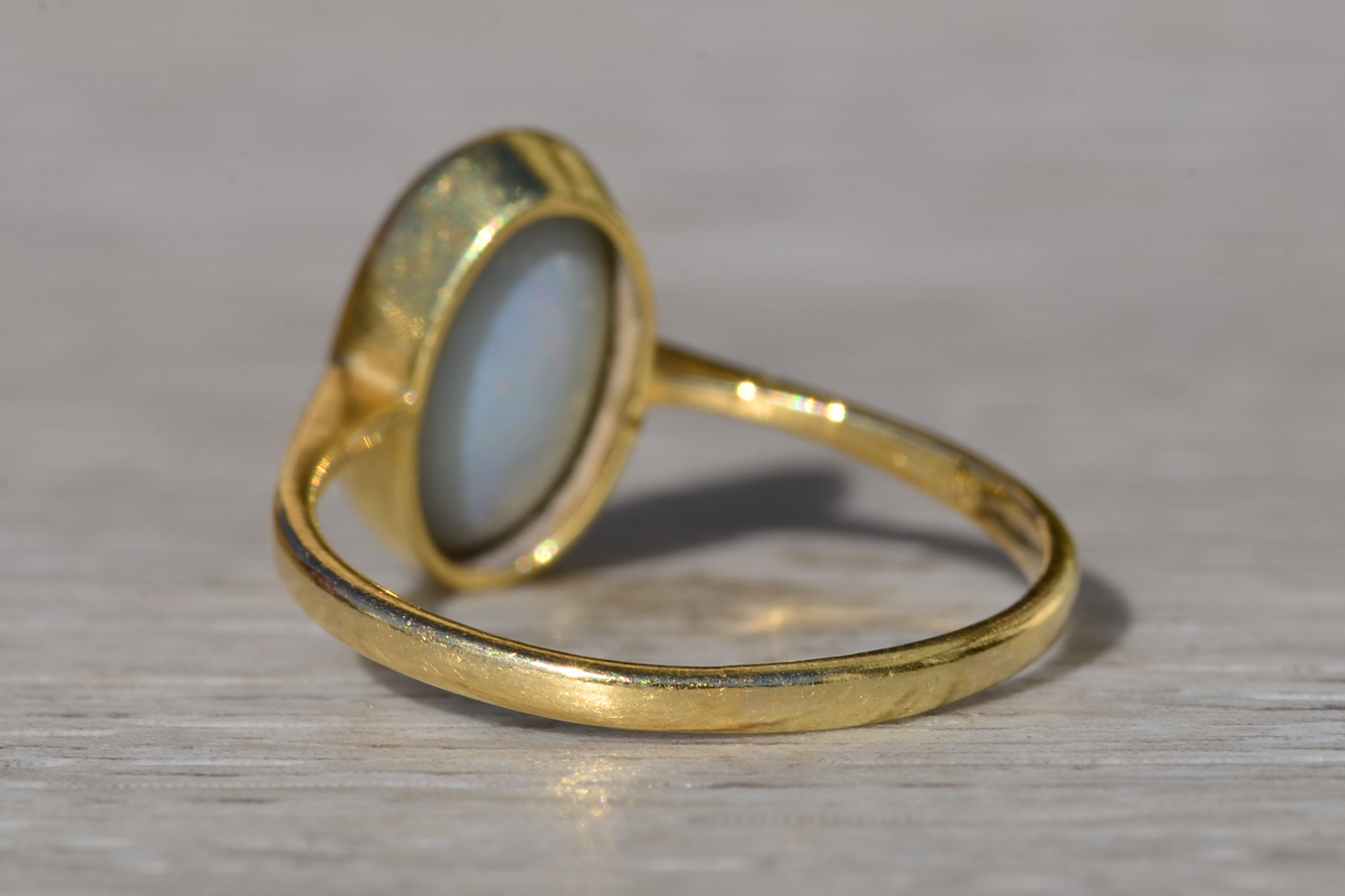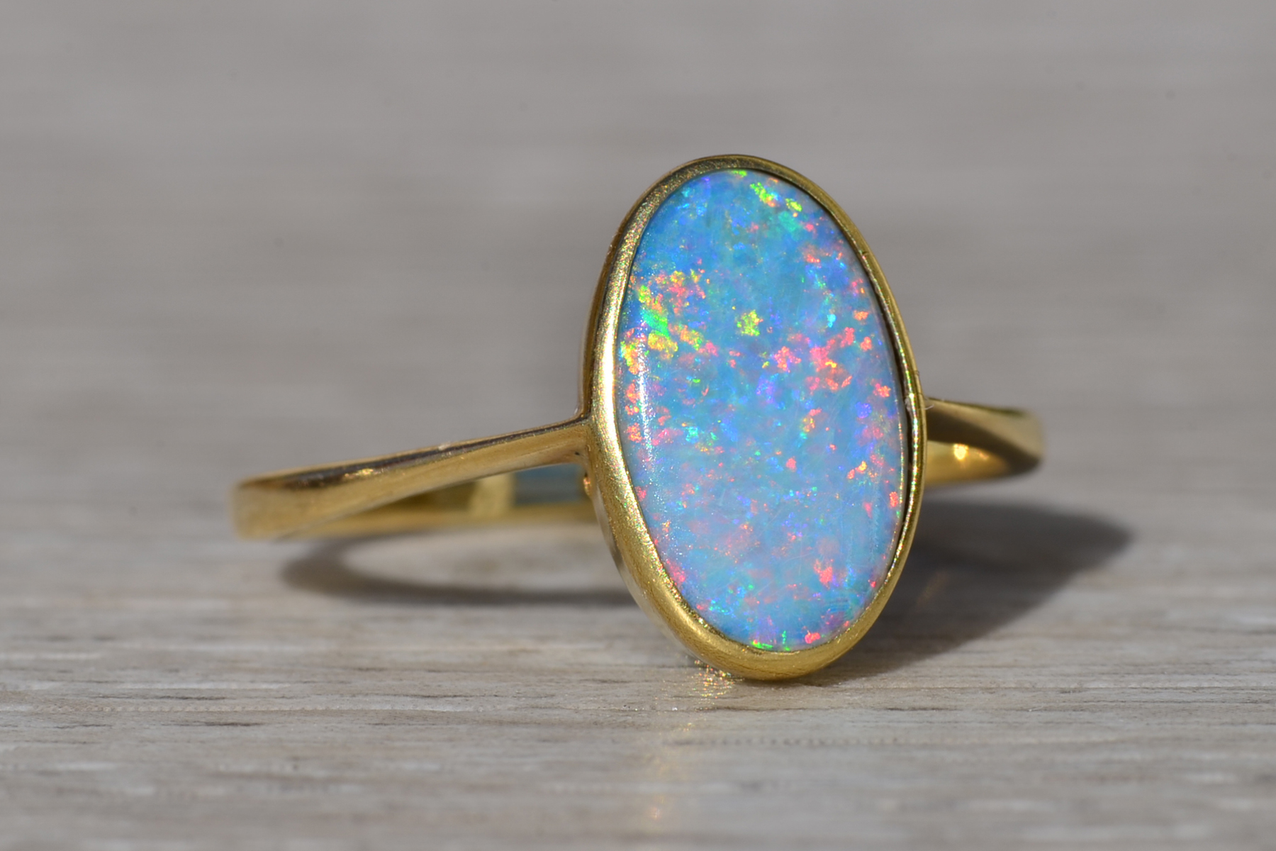 The Renton: Ladies 18K Gold Ring set with 2.25 CT Australian Opal. Crafted in durable 18 karat yellow gold, this statement ring centers on a 2.25 carat Australian opal. The opal exhibits stunning play of color and measures 13.5mm x 8.6mm in size. The ring’s bezel setting and simple tapered shank gives all the focus on the center stone. Currently the ring is a finger size 9.25 and is able to be resized for an additional fee upon request.