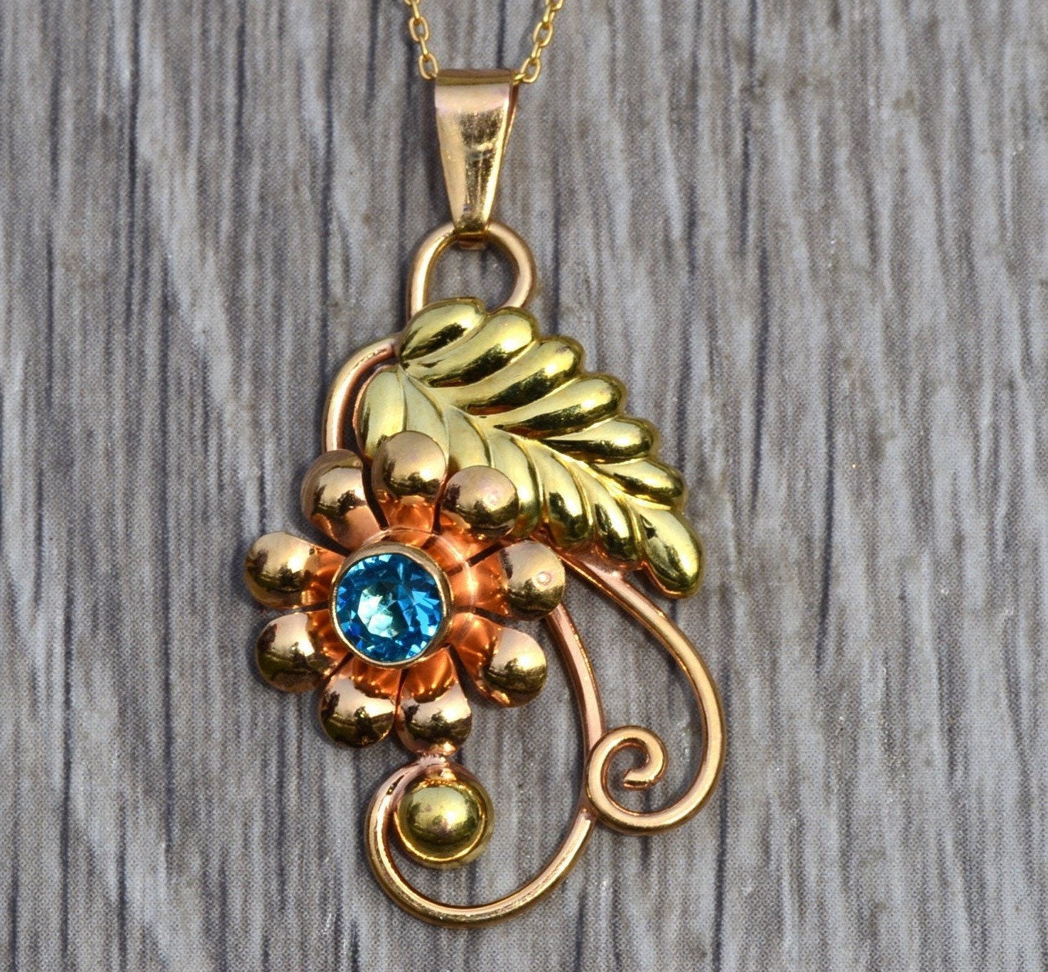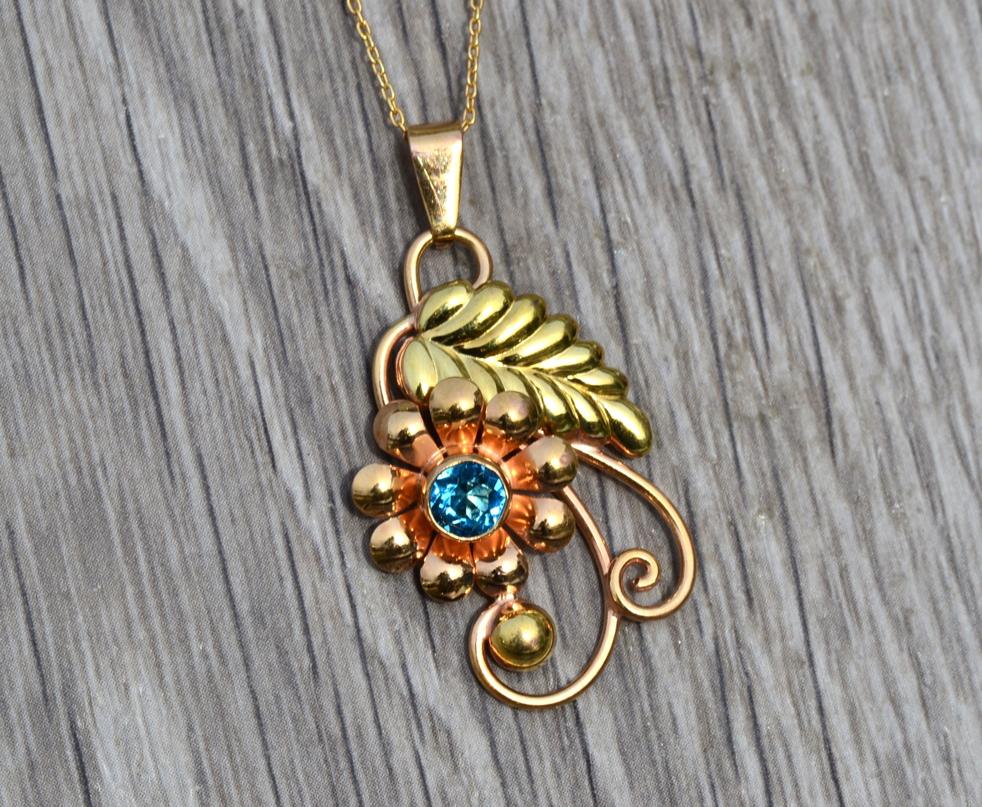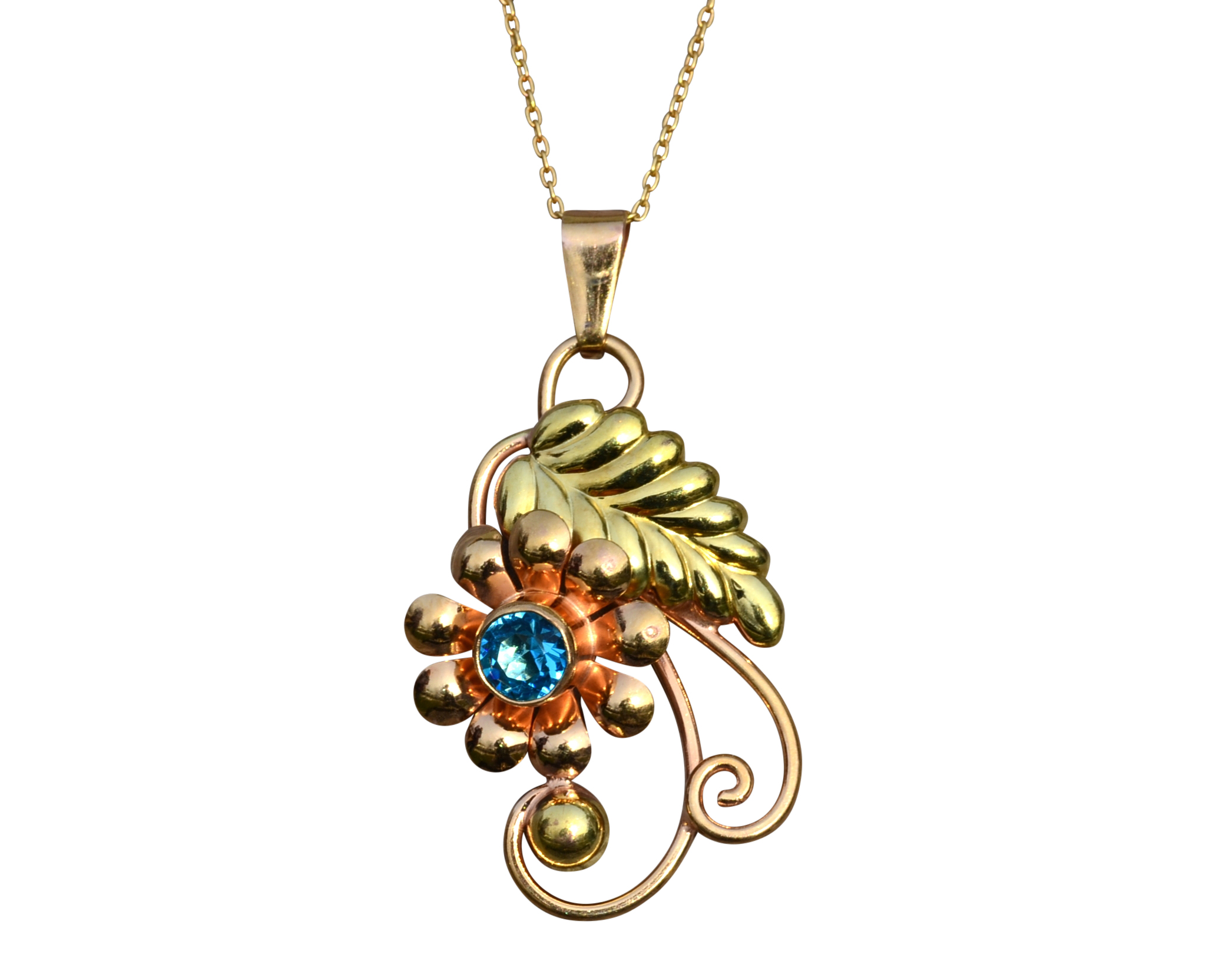 Ladies Two Tone Floral Pendant set with Zircon. Hand fabricated in both yellow and rose gold, this pendant measures 1.25 inches (without the bail) and features a bezel set blue zircon.