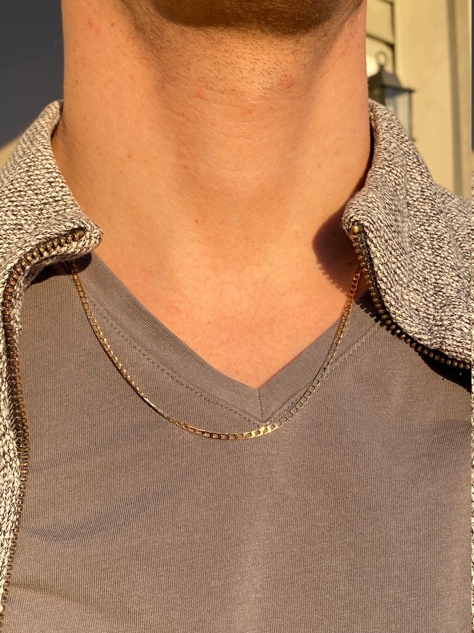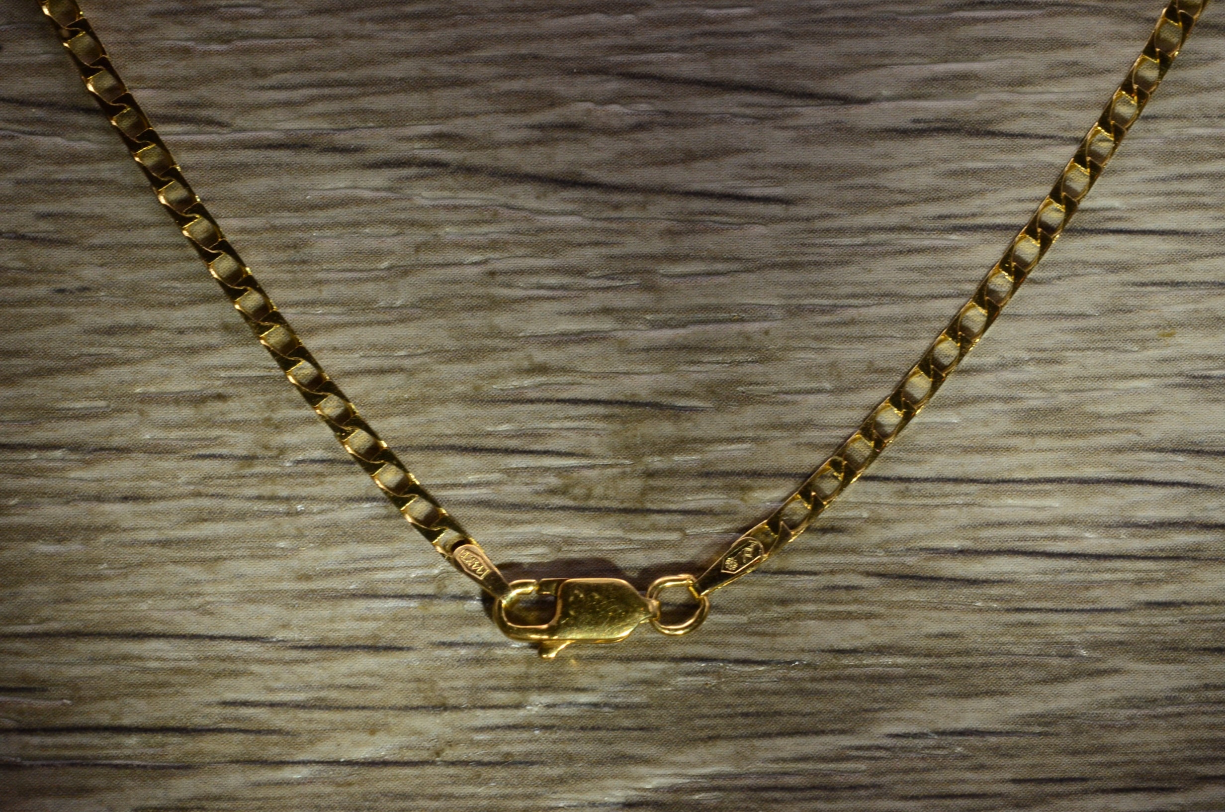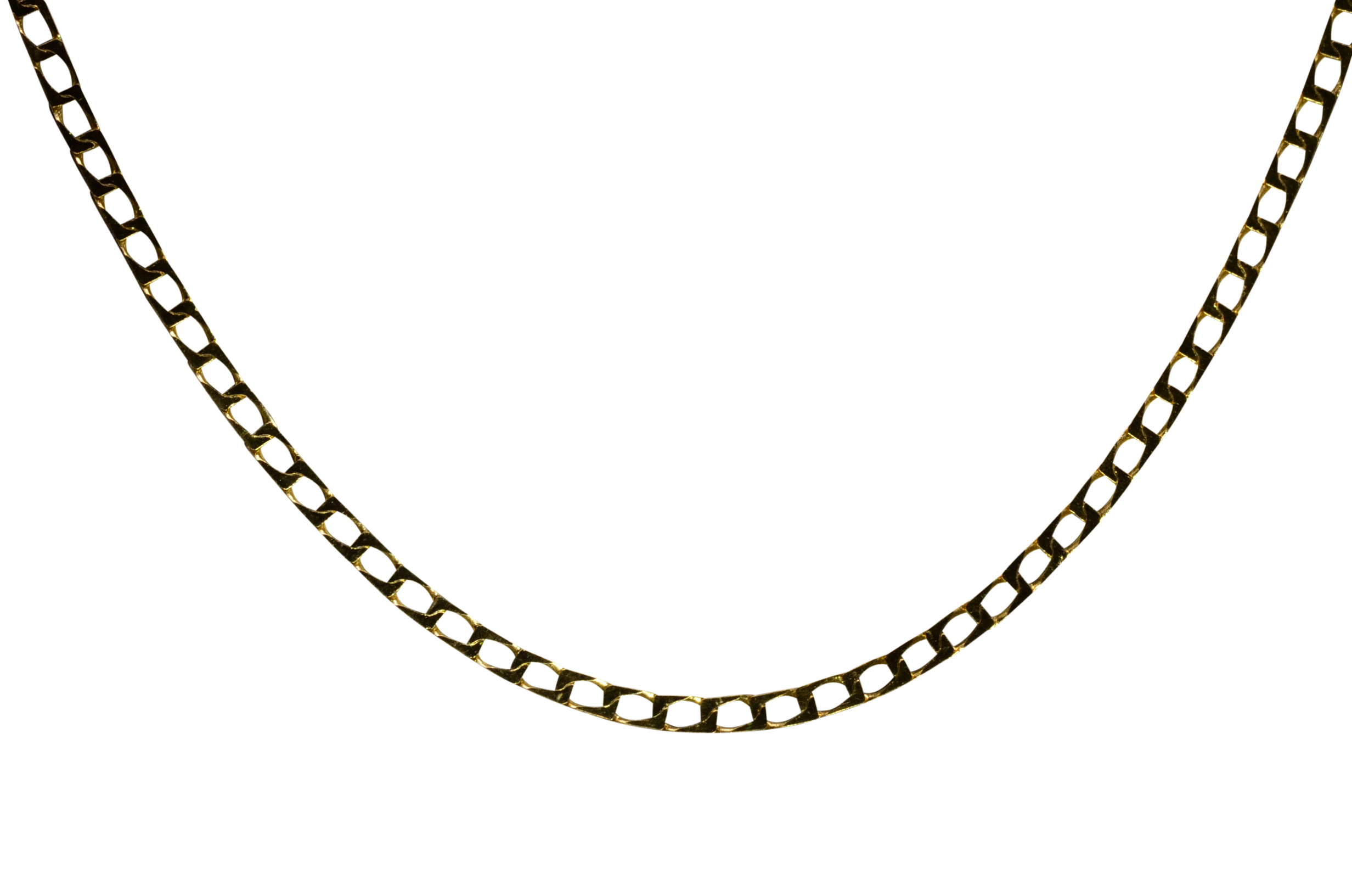 Men’s 20 Inch 14K Yellow Gold Flat Curb Link Chain. Crafted in 14 karat yellow gold, this men’s chain measures 20 inches in length and 2mm in width. A great light weight chain to wear daily, complete with a lobster claw style clasp.