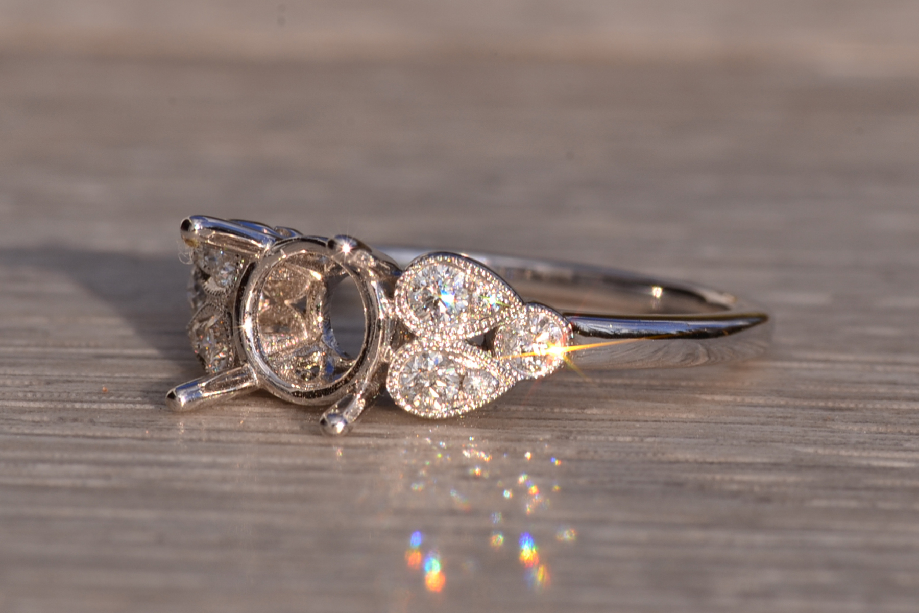 Natural Diamond Semi-Mounting in White Gold. The mounting features two round brilliant cut natural diamonds side by side with the same in pear-shaped box with milgrain edge. Below is a single bezel set round brilliant cut natural diamond with milgrain edge. The mount is crafted in 14 karat white gold.
