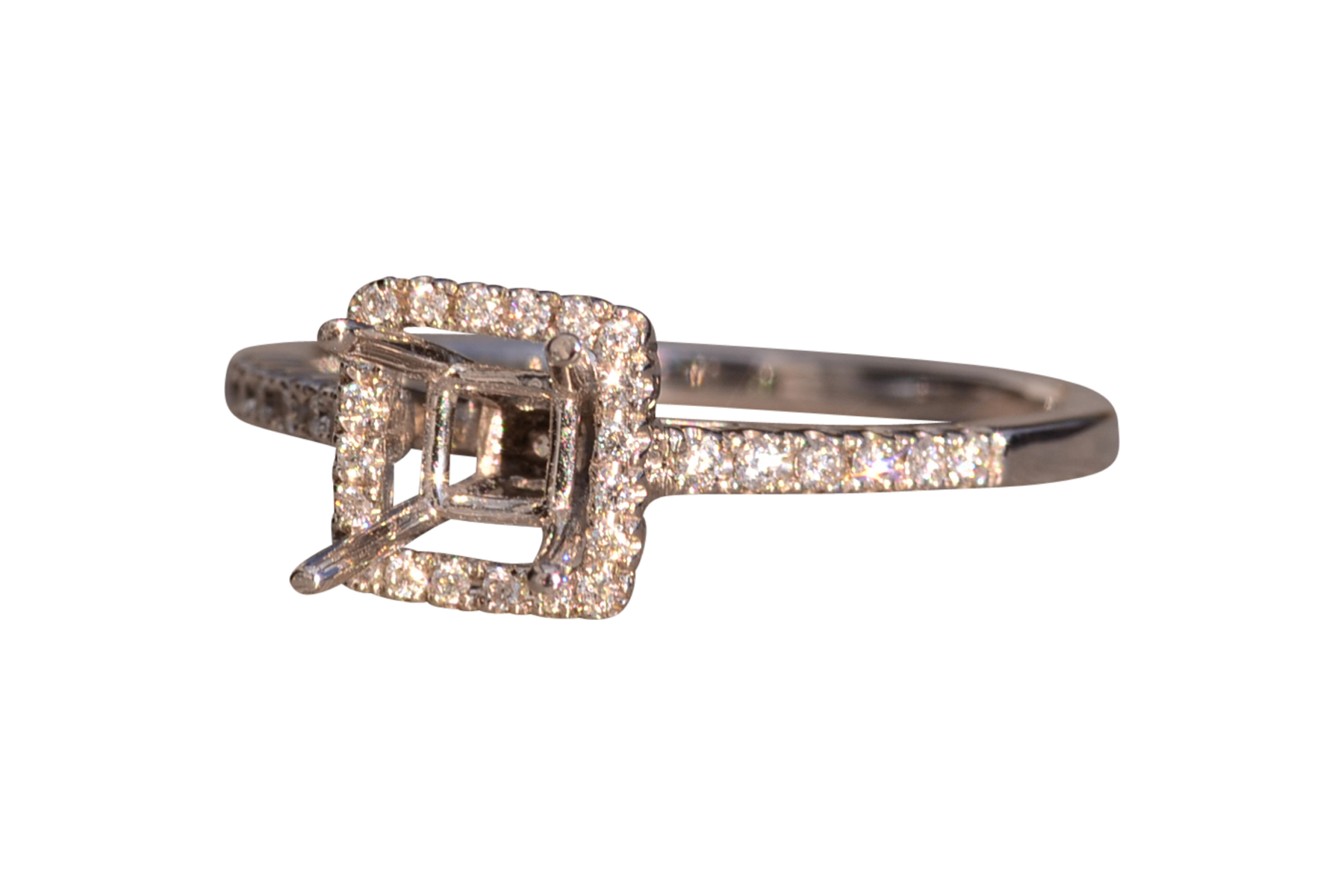 Square Halo Natural Diamond Mounting in White Gold. The diamonds have a total weight of 0.25 carats and the mounting is craft in 14 karat white gold.
