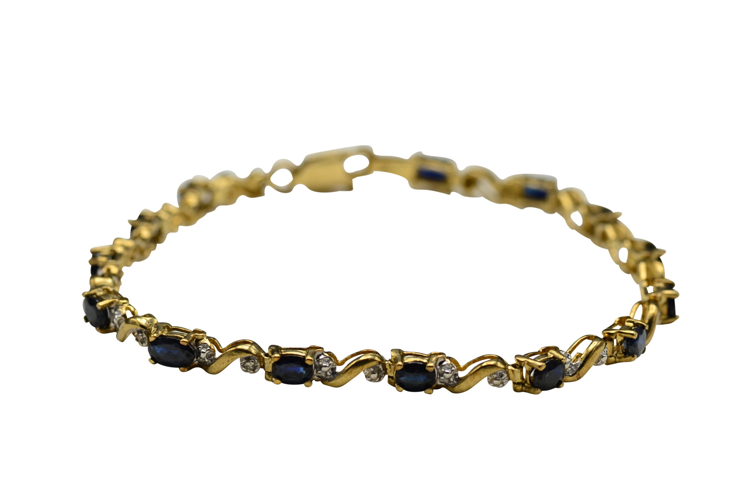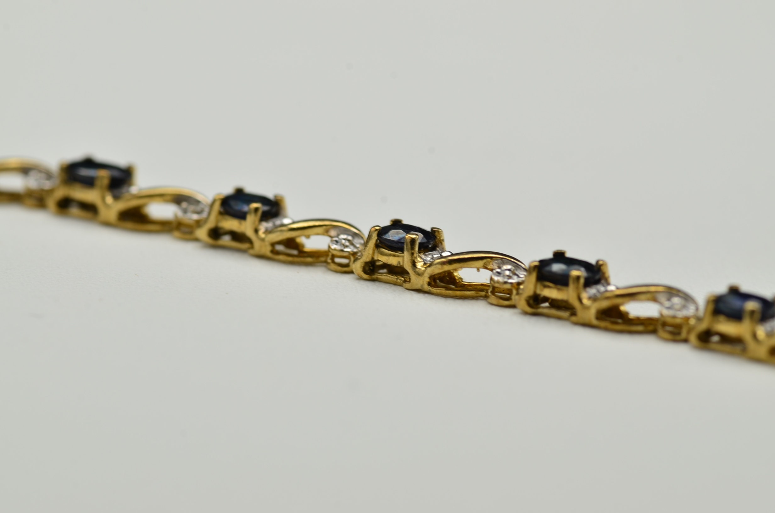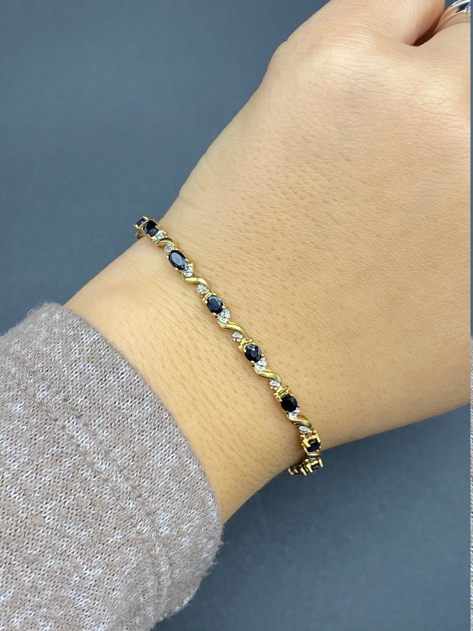 Ladies Midnight Blue Sapphire and Diamond Bracelet. This gem set bracelet is crafted in 14 karat yellow gold and measures a standard 7 inches in length. The bracelet is complete with a lobster style clasp that is easy to open and close.