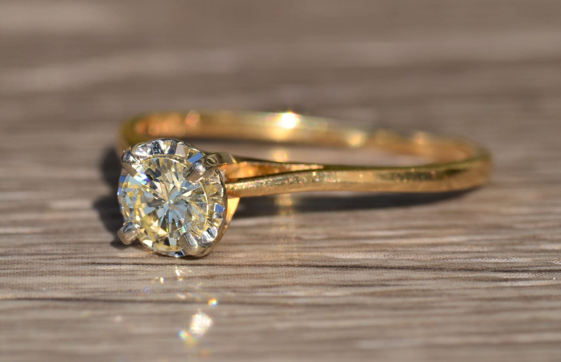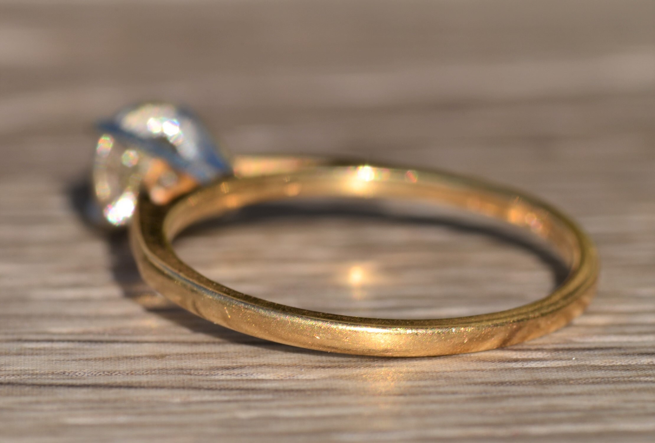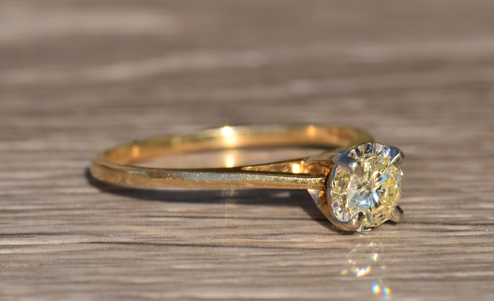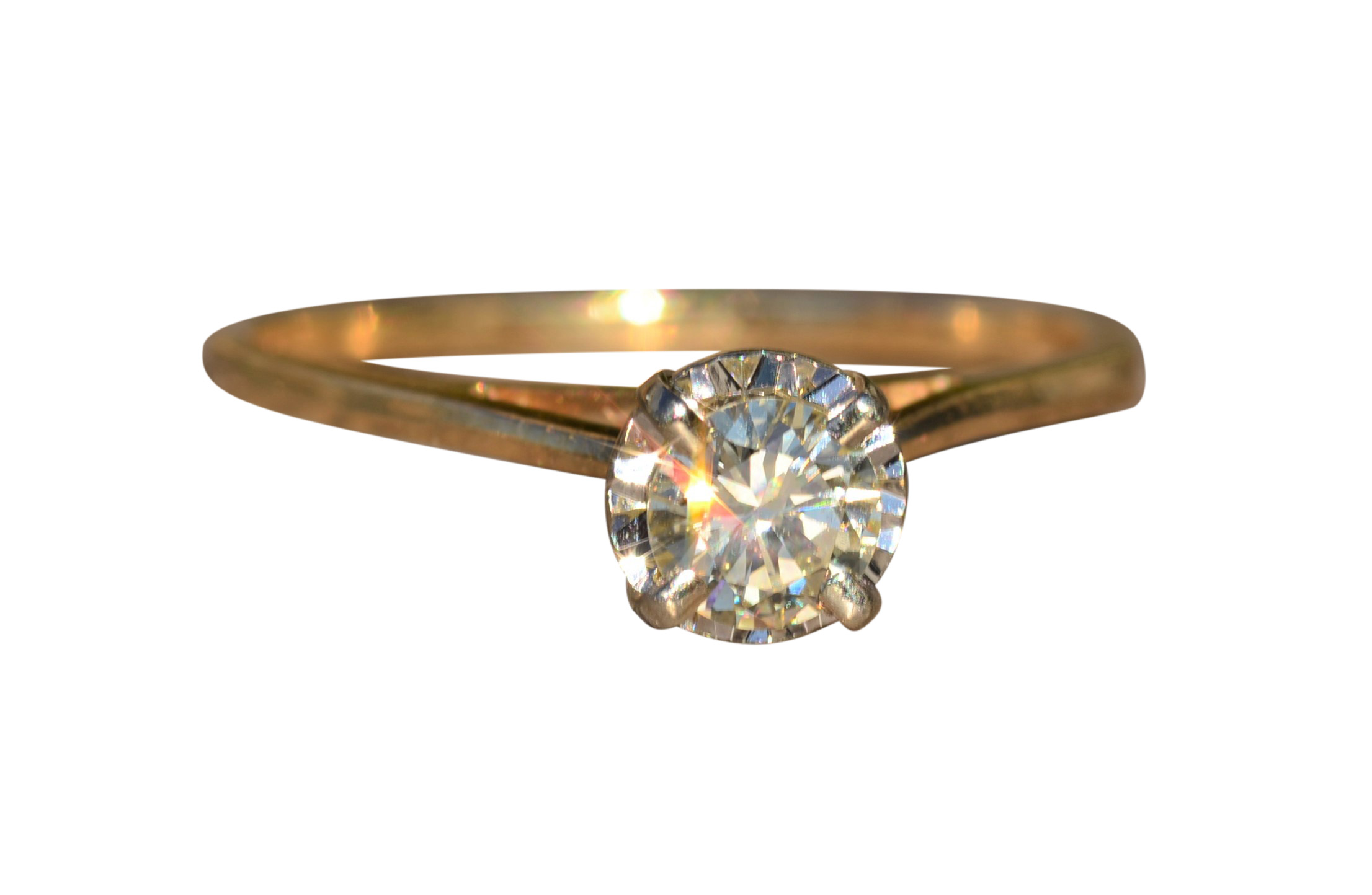 Classic Solitaire Diamond Engagement Ring in 14K Yellow Gold. Beautifully crafted in 14 karat yellow gold is this classic solitaire diamond engagement ring centering on a 0.45 carat transitional brilliant cut diamond in mystery style box to help make it appear over twice its size! The diamond has an approximate Gemological Institute of America clarity grade of SI1 and a color grade of M. This time-honored style sits just right on the finger accentuating that center stone. This ring is a finger size 8, yet can be adjusted in size.