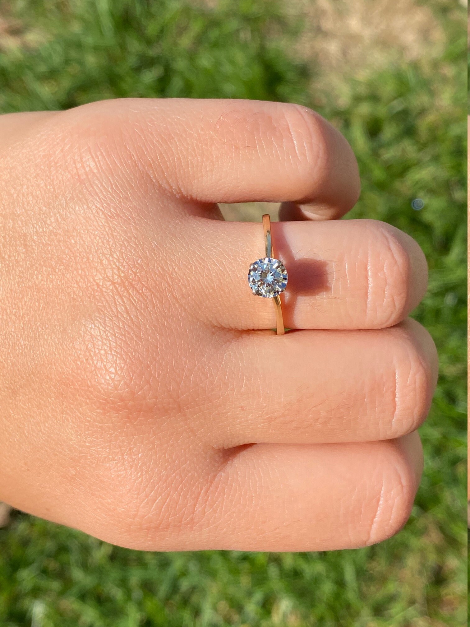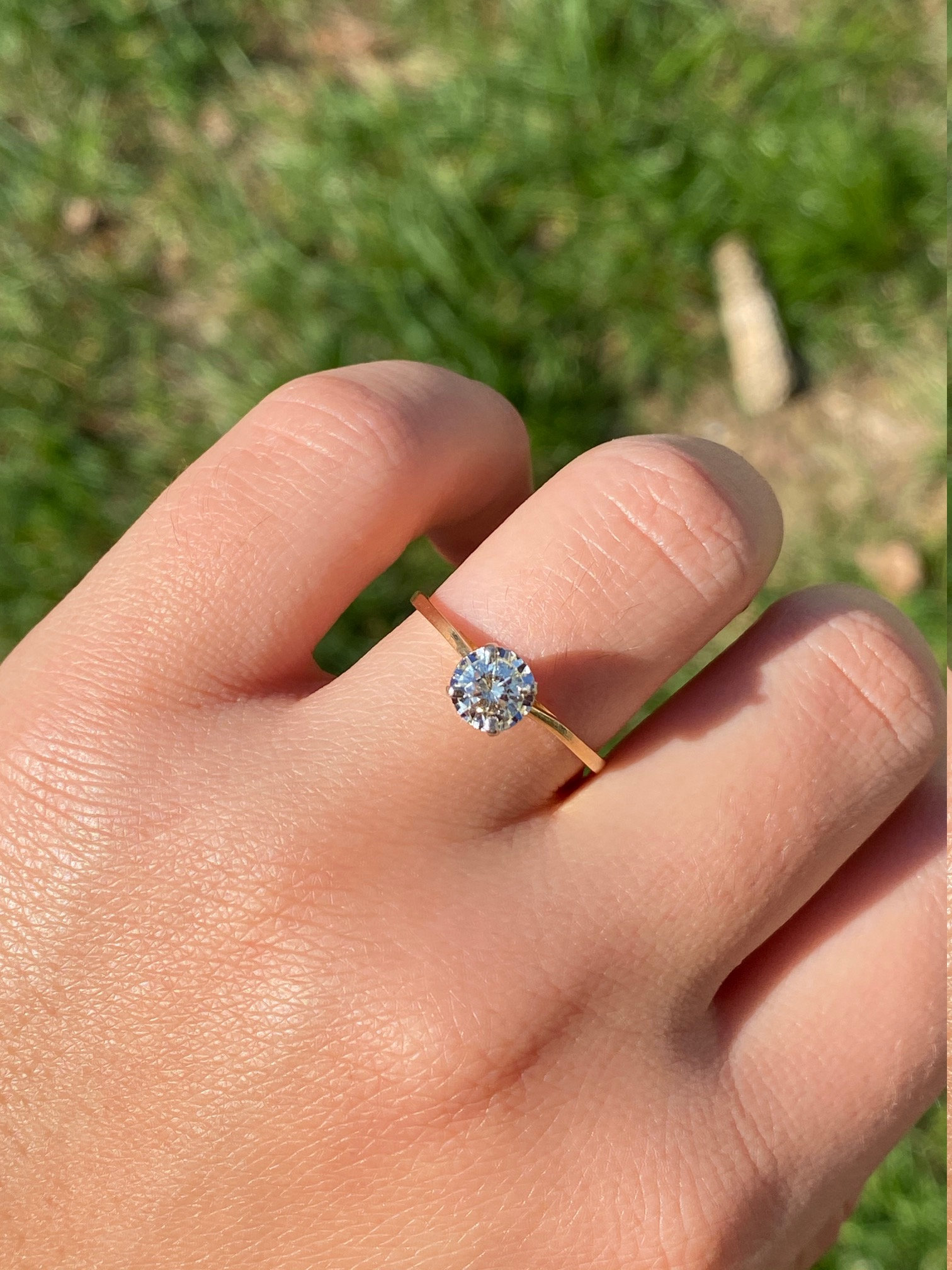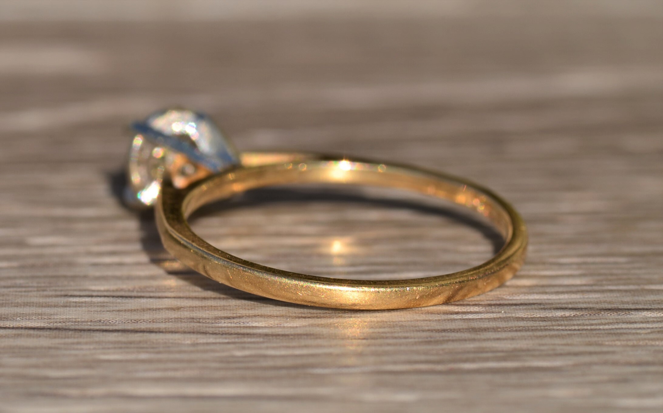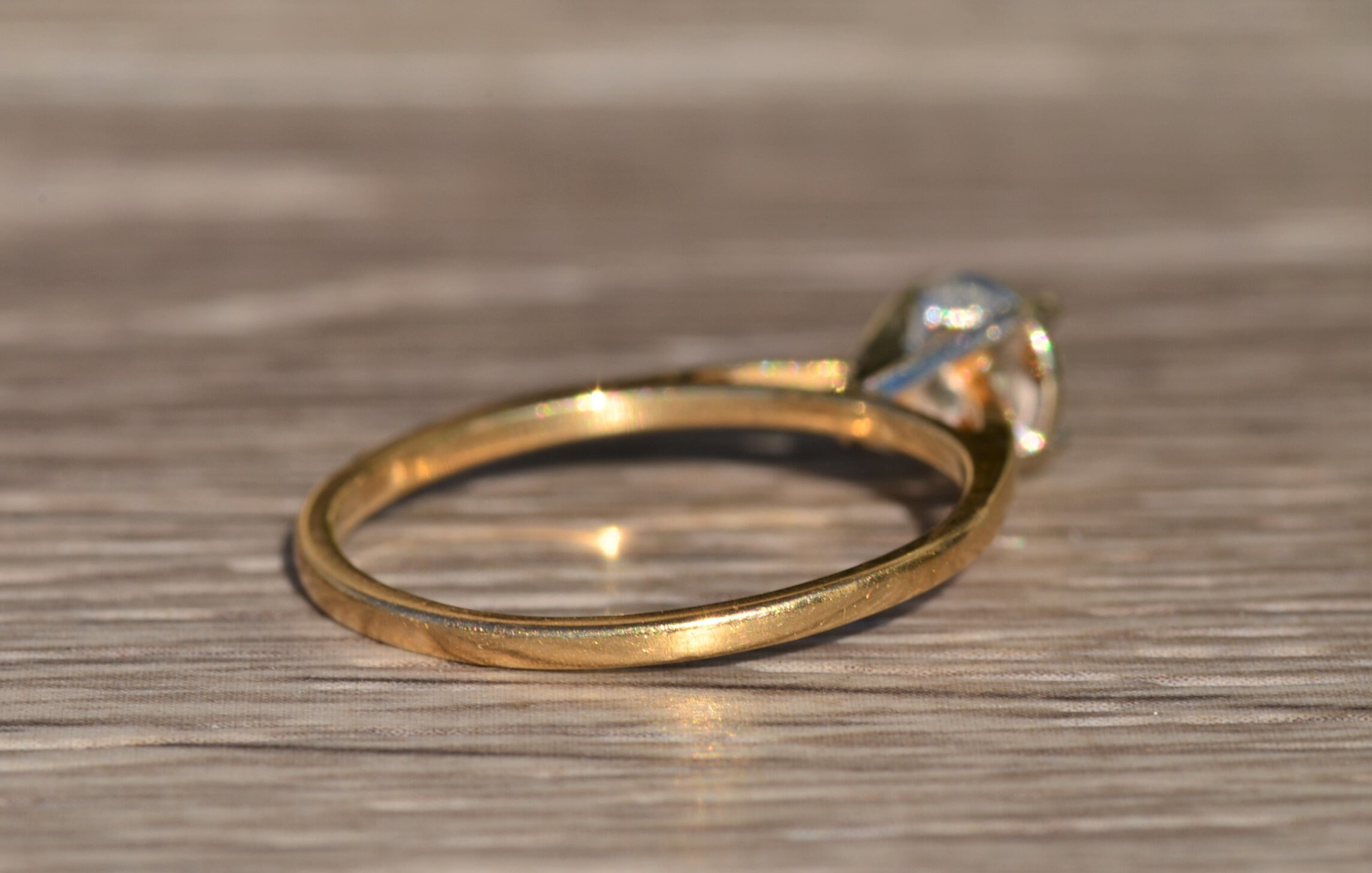 Classic Solitaire Diamond Engagement Ring in 14K Yellow Gold. Beautifully crafted in 14 karat yellow gold is this classic solitaire diamond engagement ring centering on a 0.45 carat transitional brilliant cut diamond in mystery style box to help make it appear over twice its size! The diamond has an approximate Gemological Institute of America clarity grade of SI1 and a color grade of M. This time-honored style sits just right on the finger accentuating that center stone. This ring is a finger size 8, yet can be adjusted in size.
