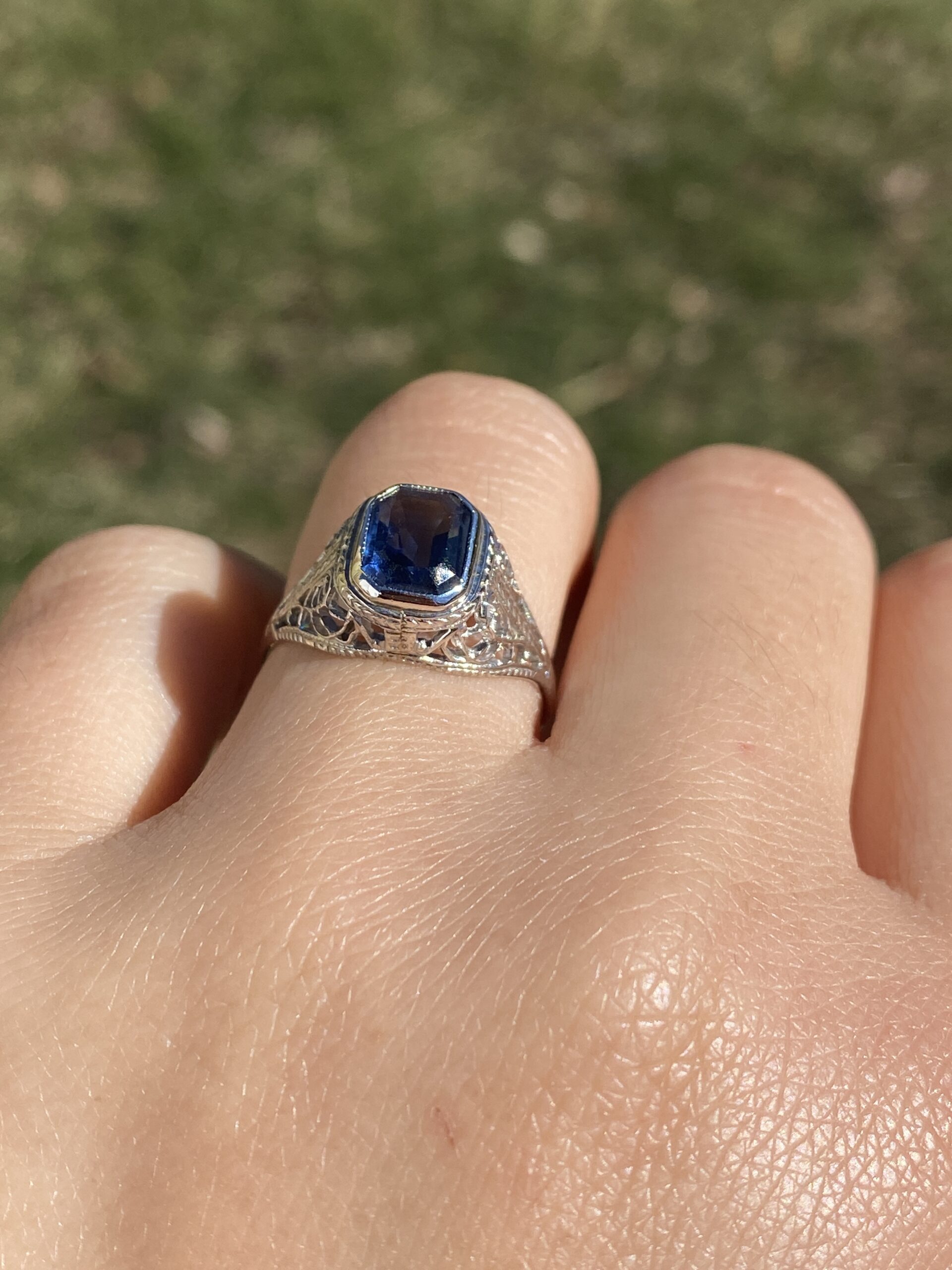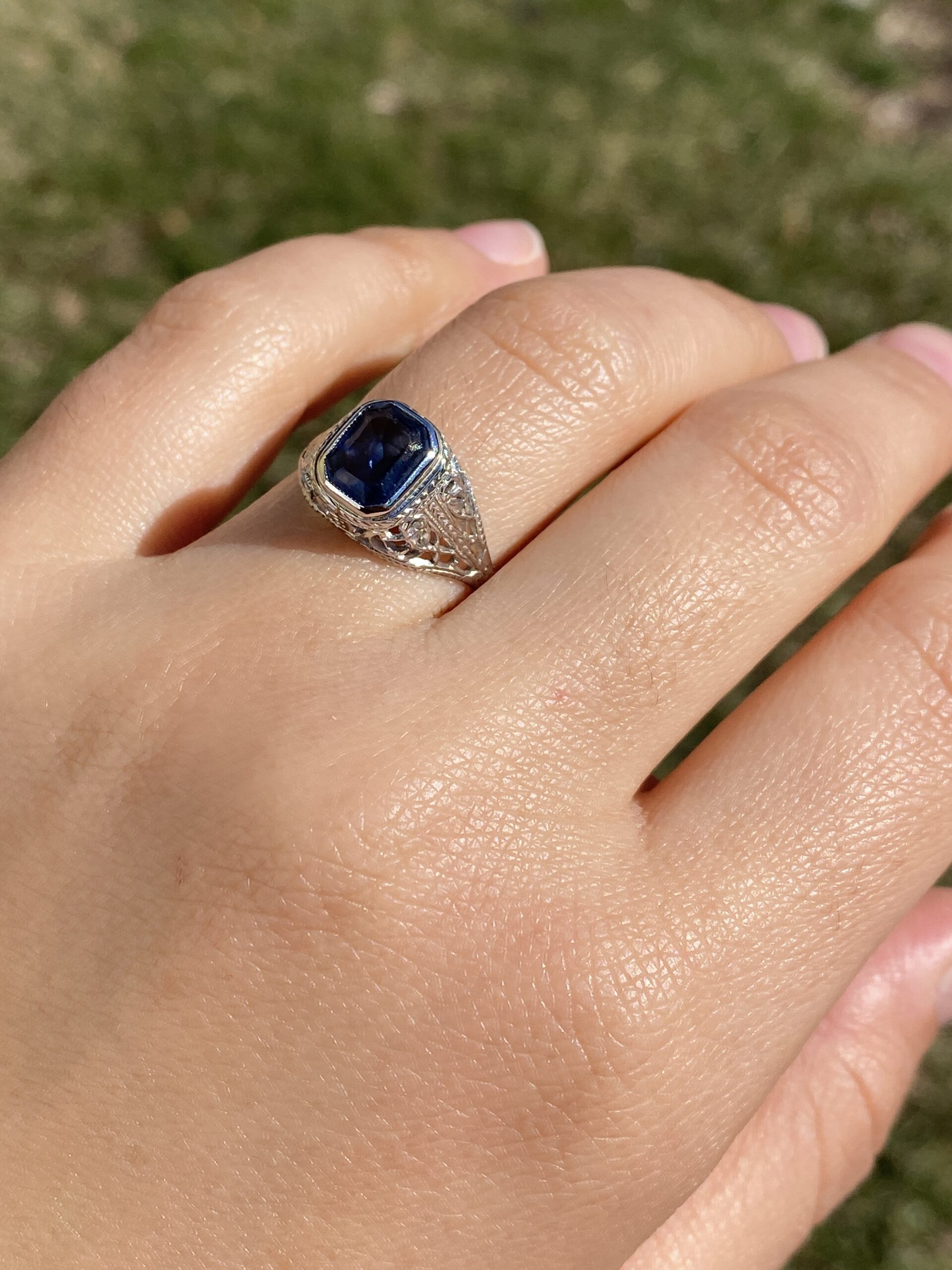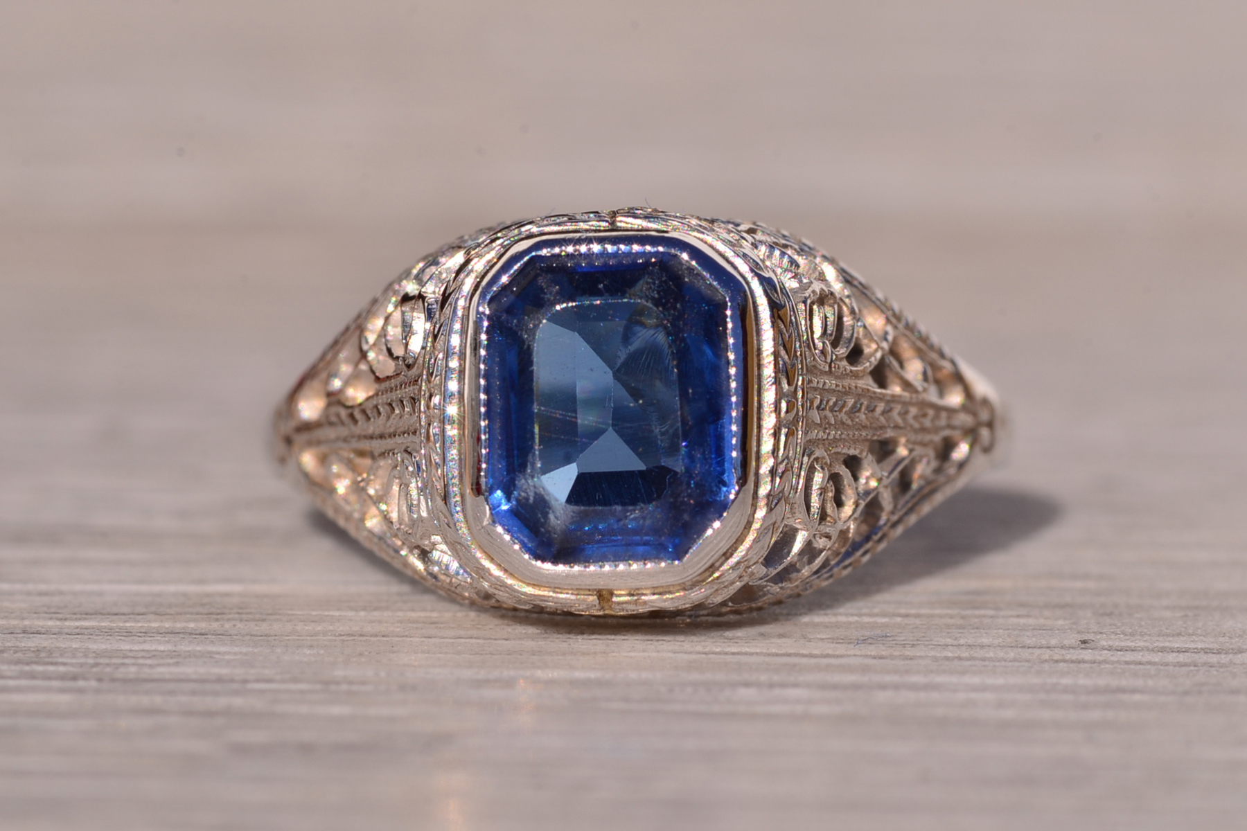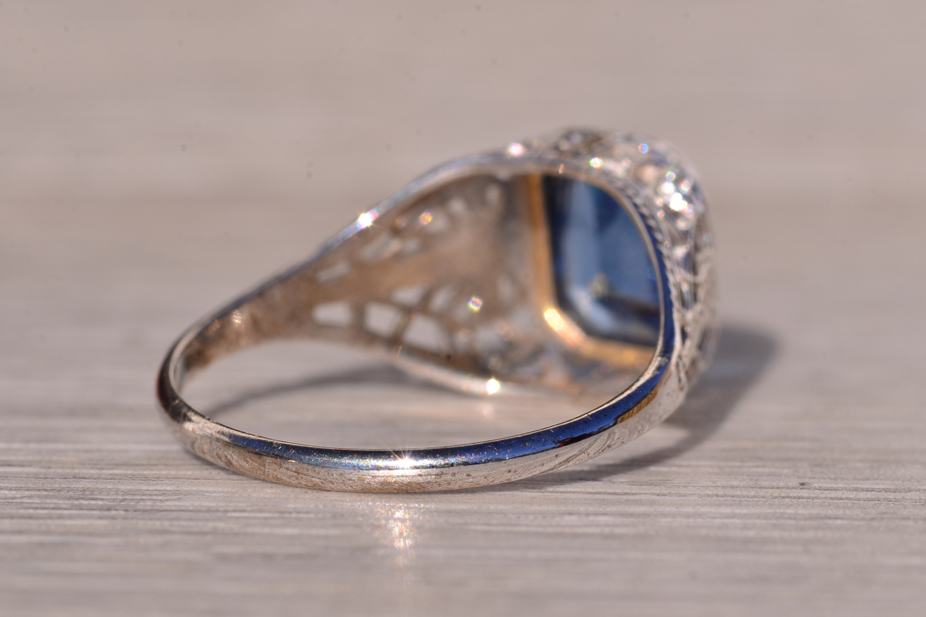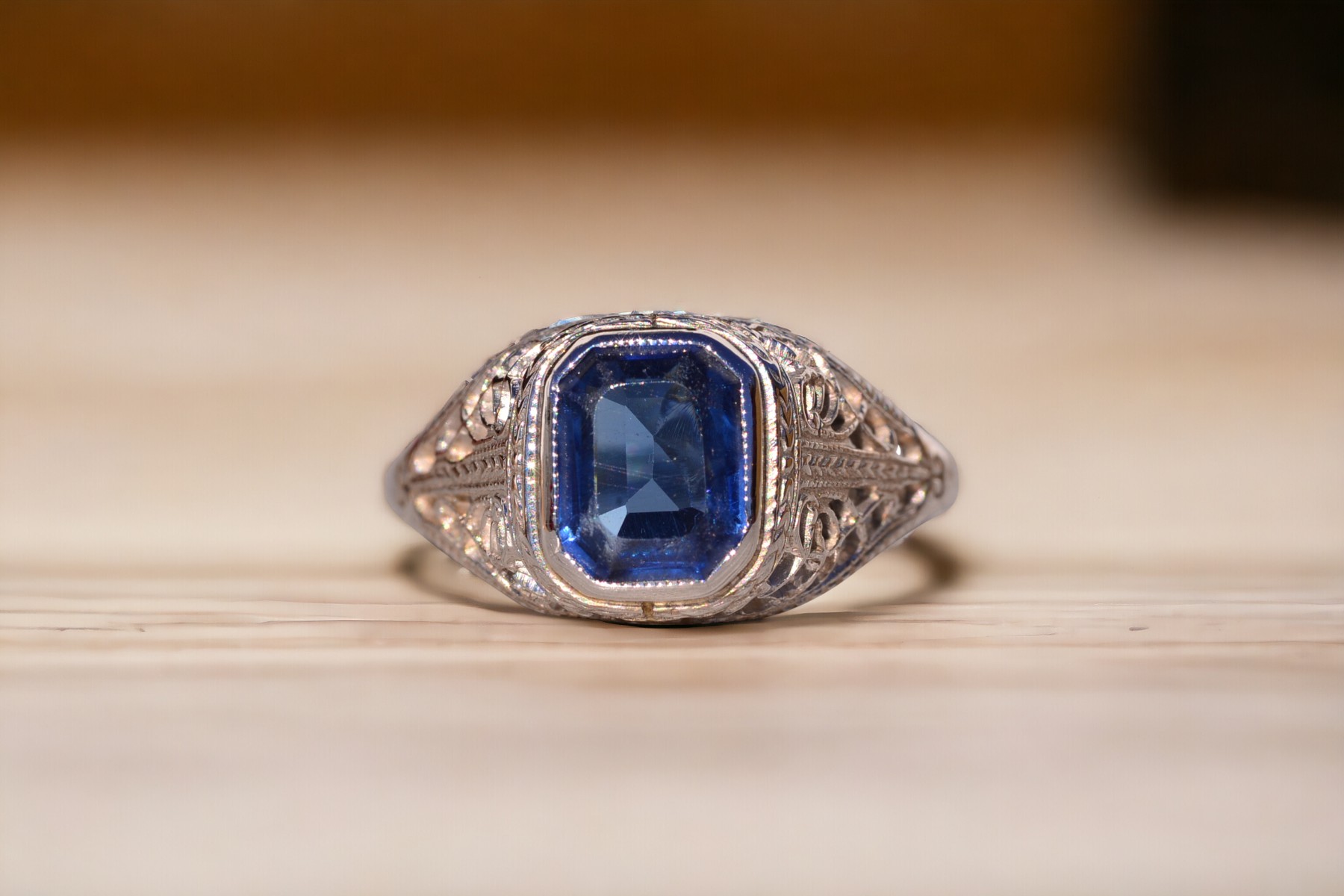 The Albatrue: Antique Filigree Sapphire Ring in White Gold. This distinguished ring features a striking elongated modified step-cut diffused medium blue sapphire, cradled within a meticulously handcrafted polished bezel. Delicate filigree work adorns the ring, adding an air of intricate sophistication that extends throughout the band. Crafted with precision in luminous white gold, this piece exudes timeless elegance. Currently sized at 7.75, with the option for personalized adjustments available upon request for an additional charge, ensuring a perfect fit that harmonizes with your unique style.