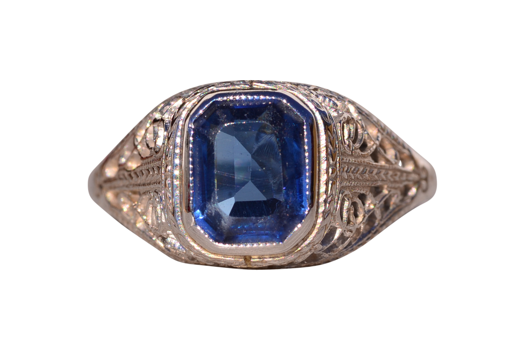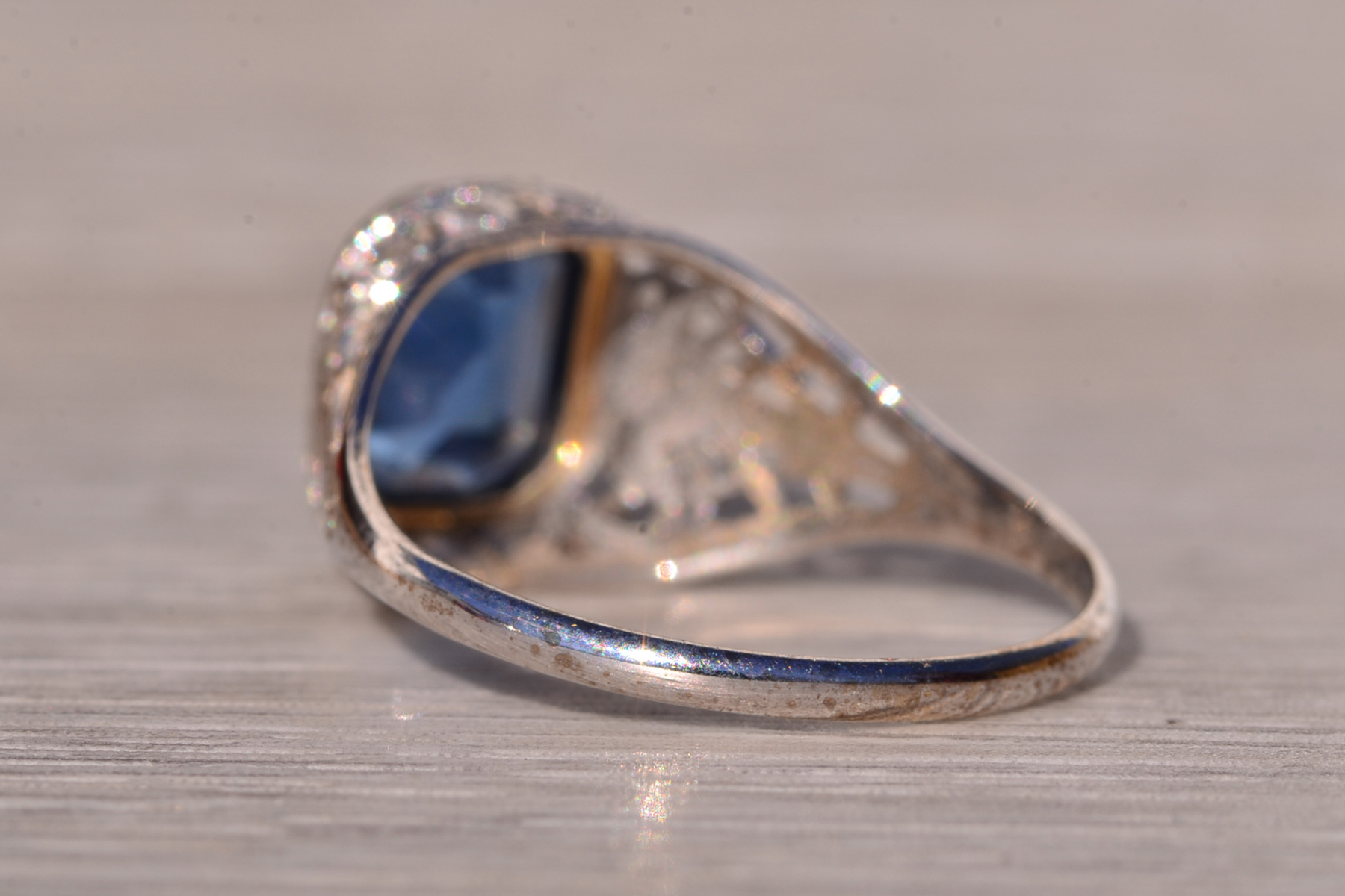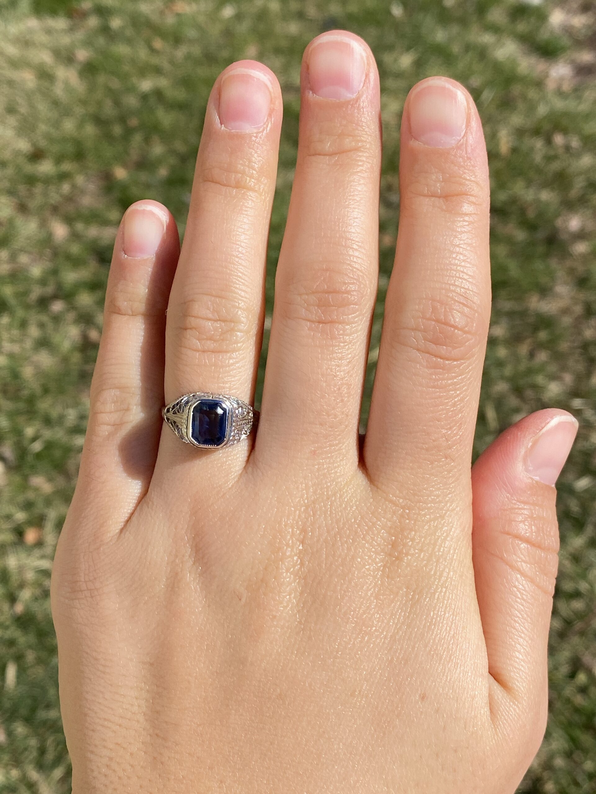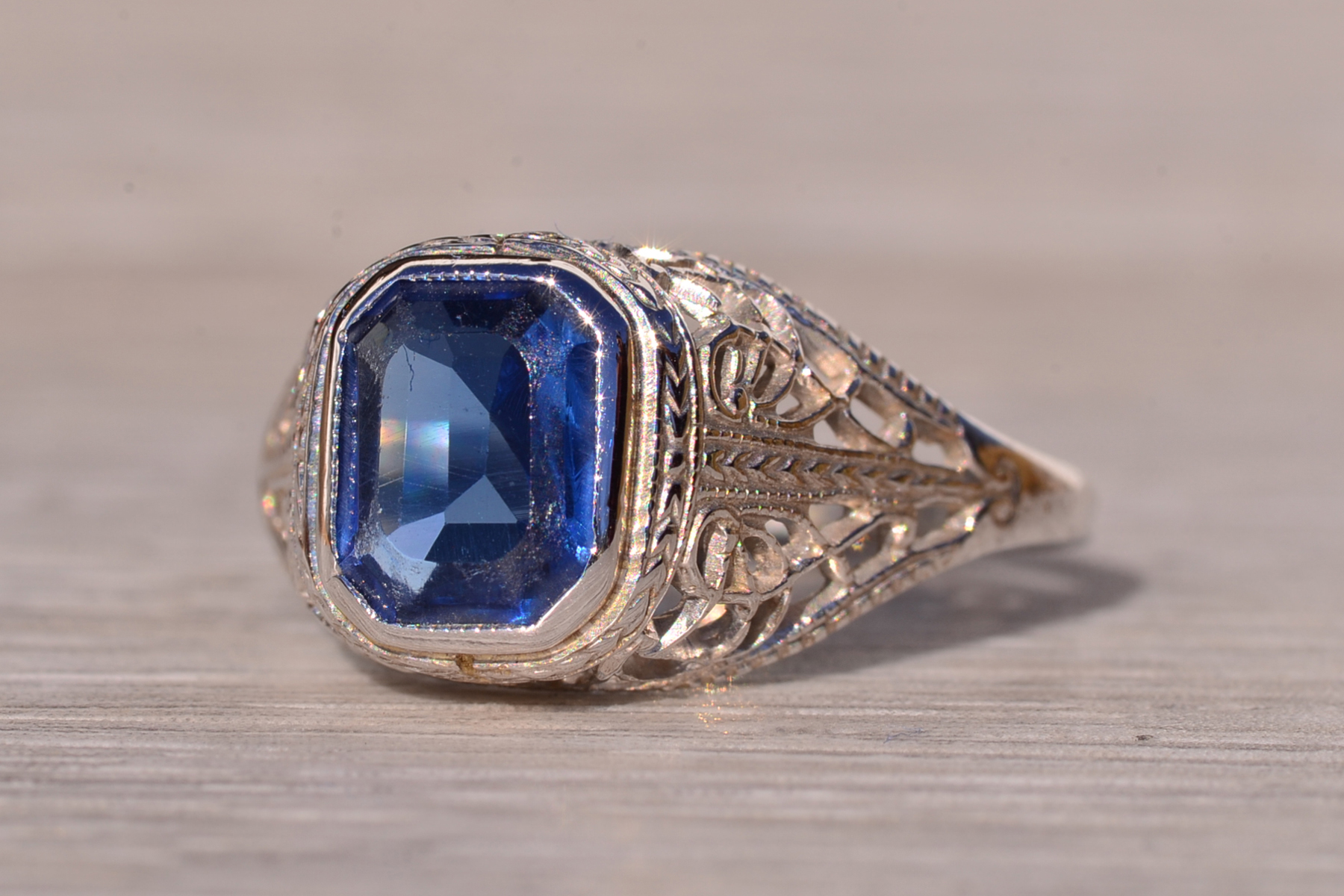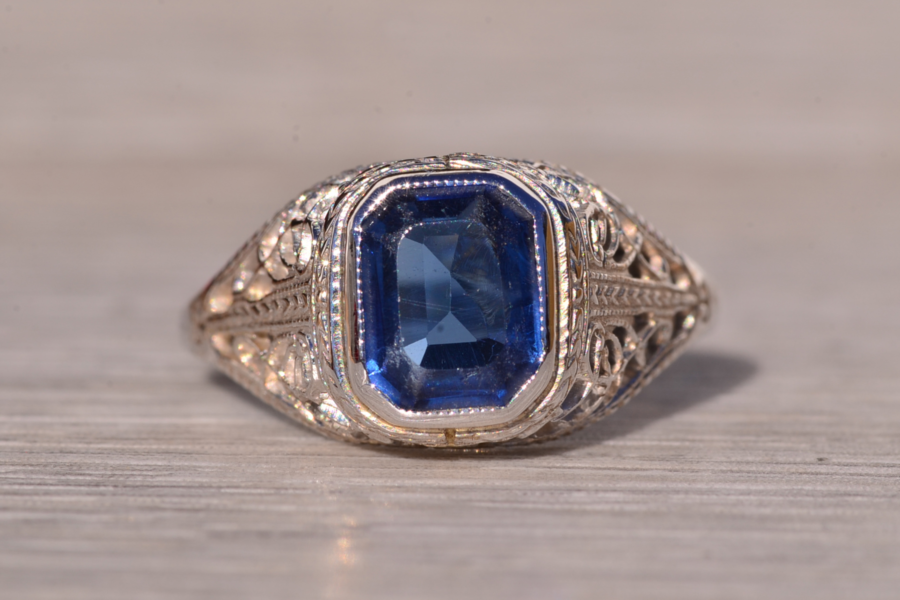 The Albatrue: Antique Filigree Sapphire Ring in White Gold. This distinguished ring features a striking elongated modified step-cut diffused medium blue sapphire, cradled within a meticulously handcrafted polished bezel. Delicate filigree work adorns the ring, adding an air of intricate sophistication that extends throughout the band. Crafted with precision in luminous white gold, this piece exudes timeless elegance. Currently sized at 7.75, with the option for personalized adjustments available upon request for an additional charge, ensuring a perfect fit that harmonizes with your unique style.