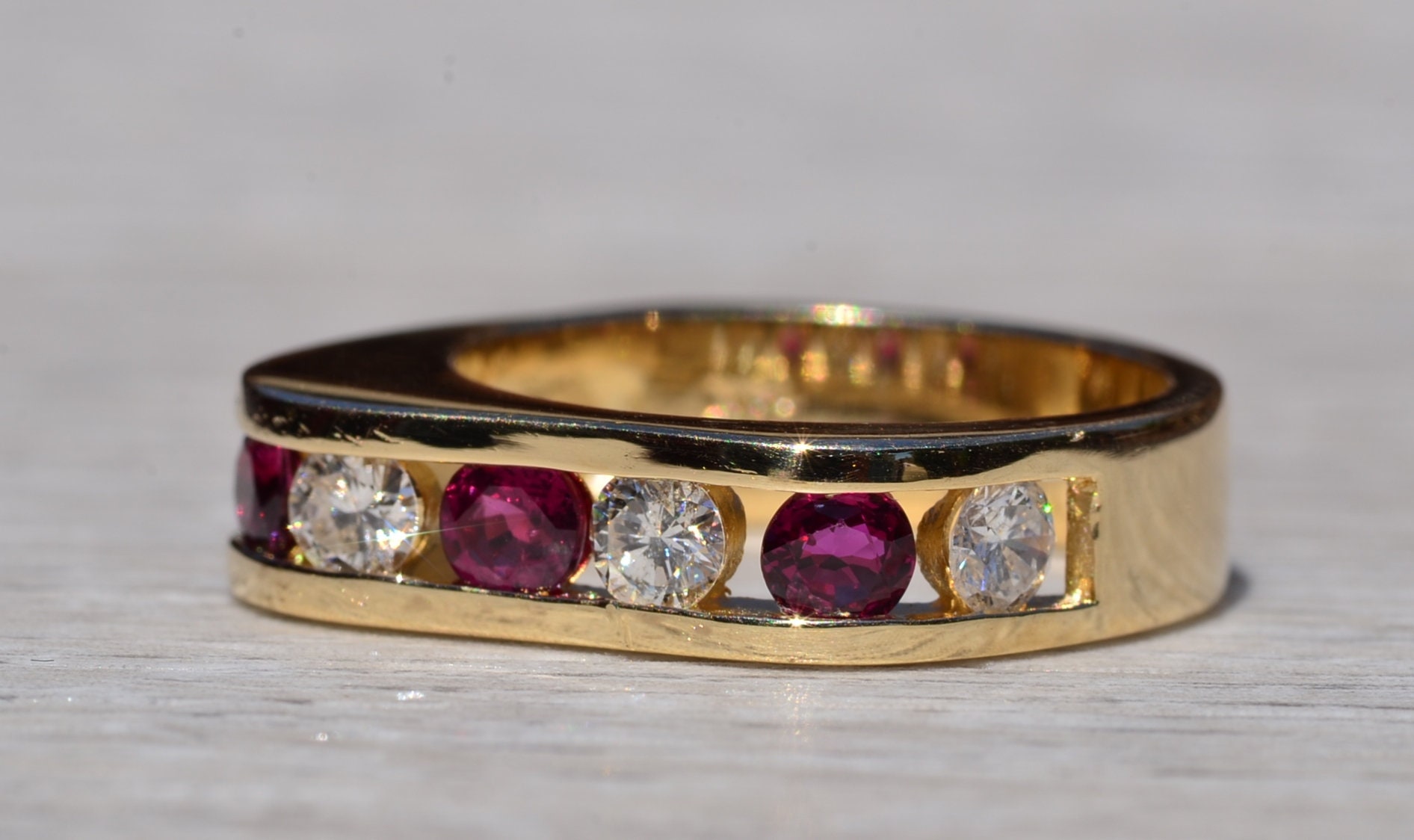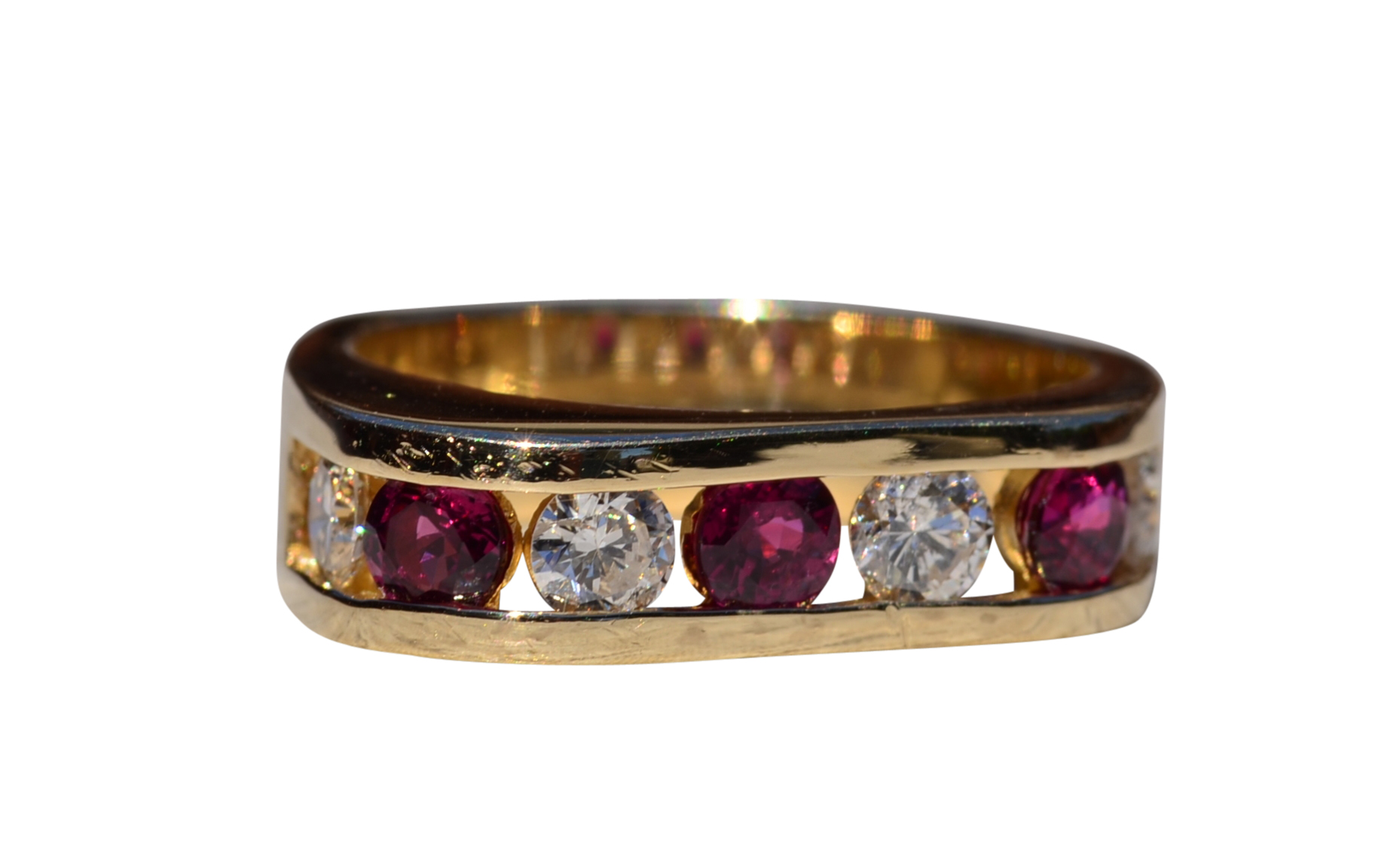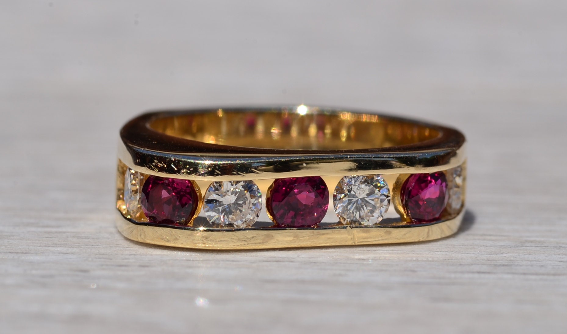 The Altadena: Modern Ruby and Diamond Band. The ring features alternating round brilliant cut natural rubies that are vivid in color separated by a round brilliant cut natural diamond. The rubies have an approximate total weight by measurement of 0.60 carats and the diamonds have an approximate total weight by measurement of 0.80 carats. The ring has a nice presence on the hand based on weight and features a contemporary style shape. The ring is crafted in 14 karat yellow gold and is currently a finger size 6 1/4 yet can be adjusted to any finger size for an additional charge on request.