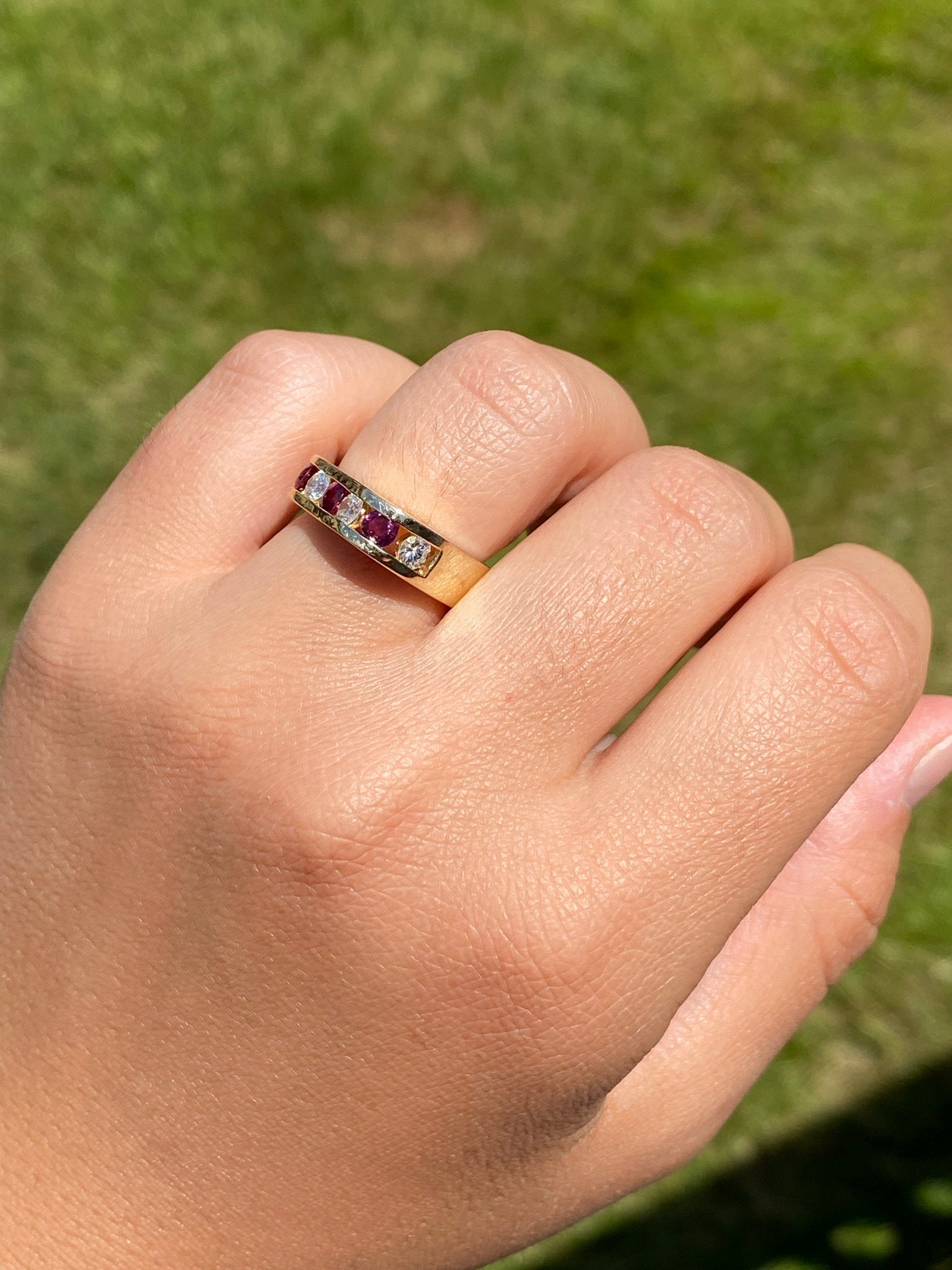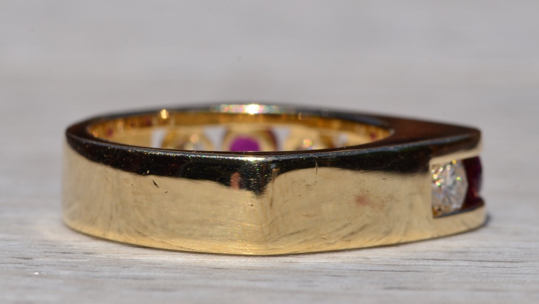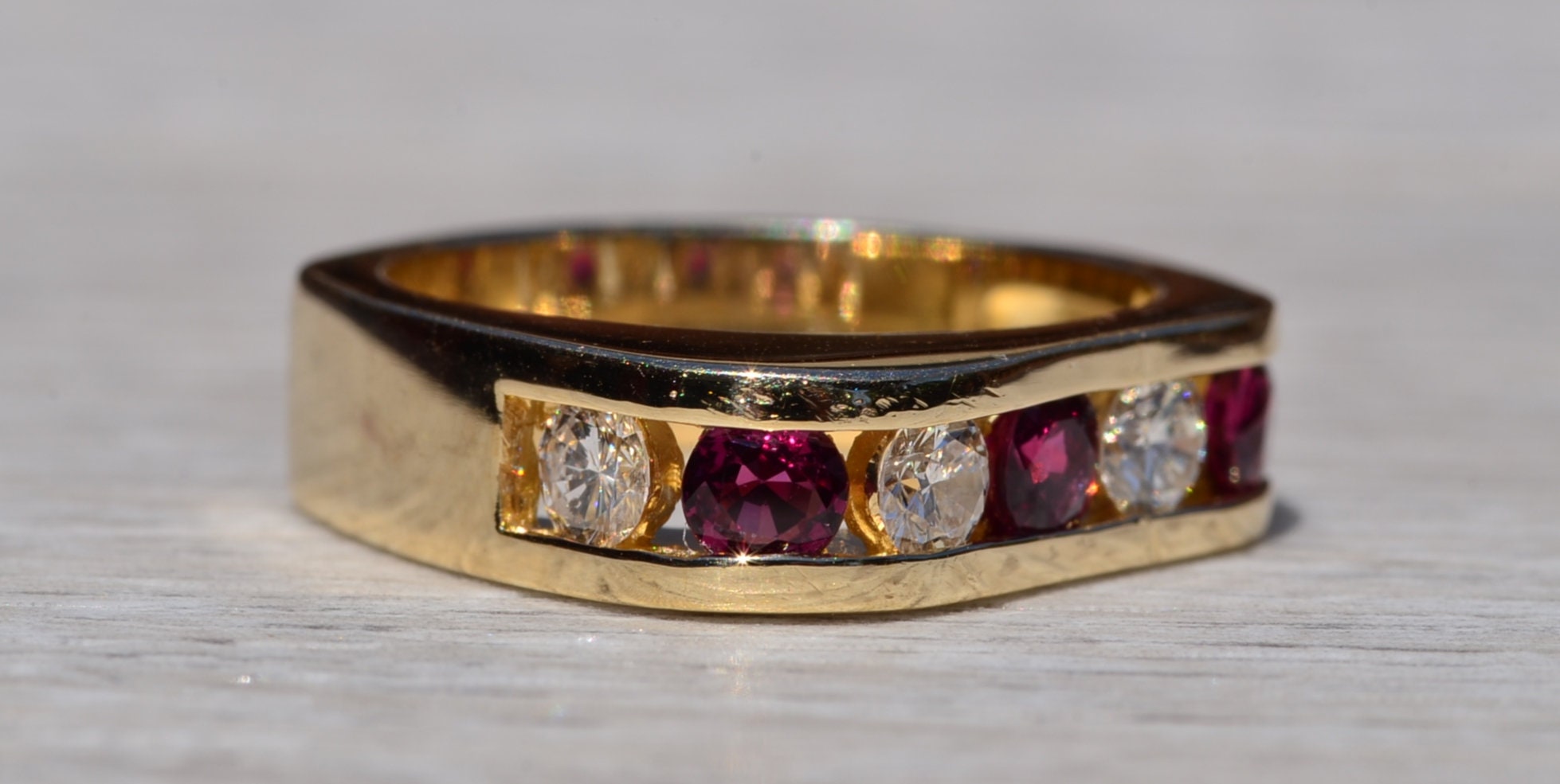 The Altadena: Modern Ruby and Diamond Band. The ring features alternating round brilliant cut natural rubies that are vivid in color separated by a round brilliant cut natural diamond. The rubies have an approximate total weight by measurement of 0.60 carats and the diamonds have an approximate total weight by measurement of 0.80 carats. The ring has a nice presence on the hand based on weight and features a contemporary style shape. The ring is crafted in 14 karat yellow gold and is currently a finger size 6 1/4 yet can be adjusted to any finger size for an additional charge on request.