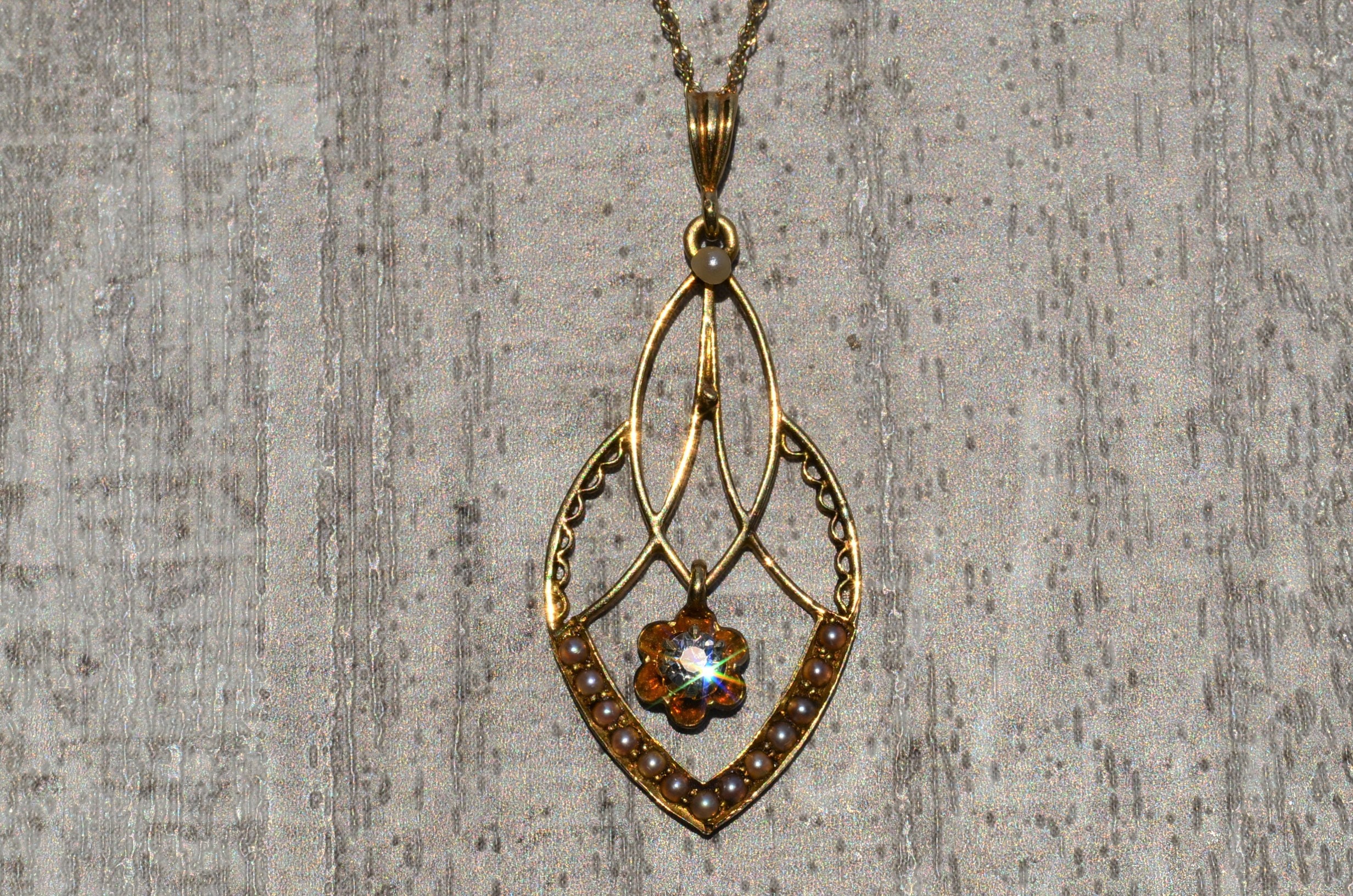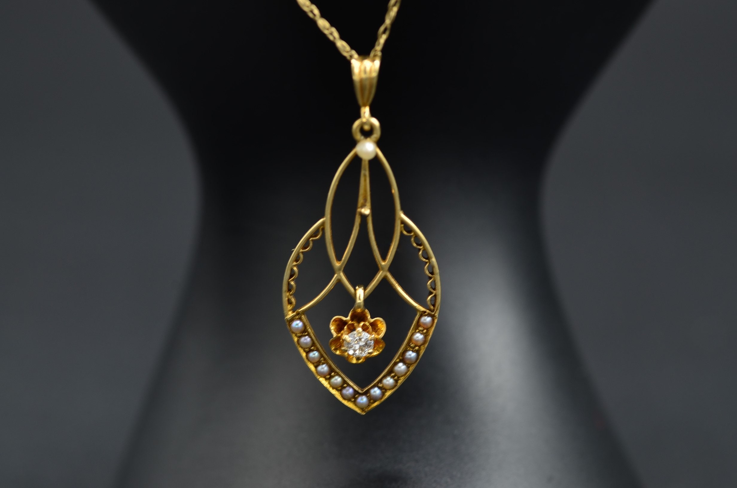 Vintage 14KYellow Gold Pendant Set with Seed Pearls and Diamond. This delicate pendant measures approximately 1.25 inches in length and features small seed pearls. Dangling freely in the middle of the pendant is a diamond in a buttercup style setting. A yellow gold chain can be purchased separately.