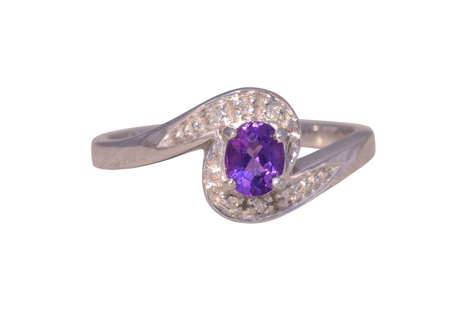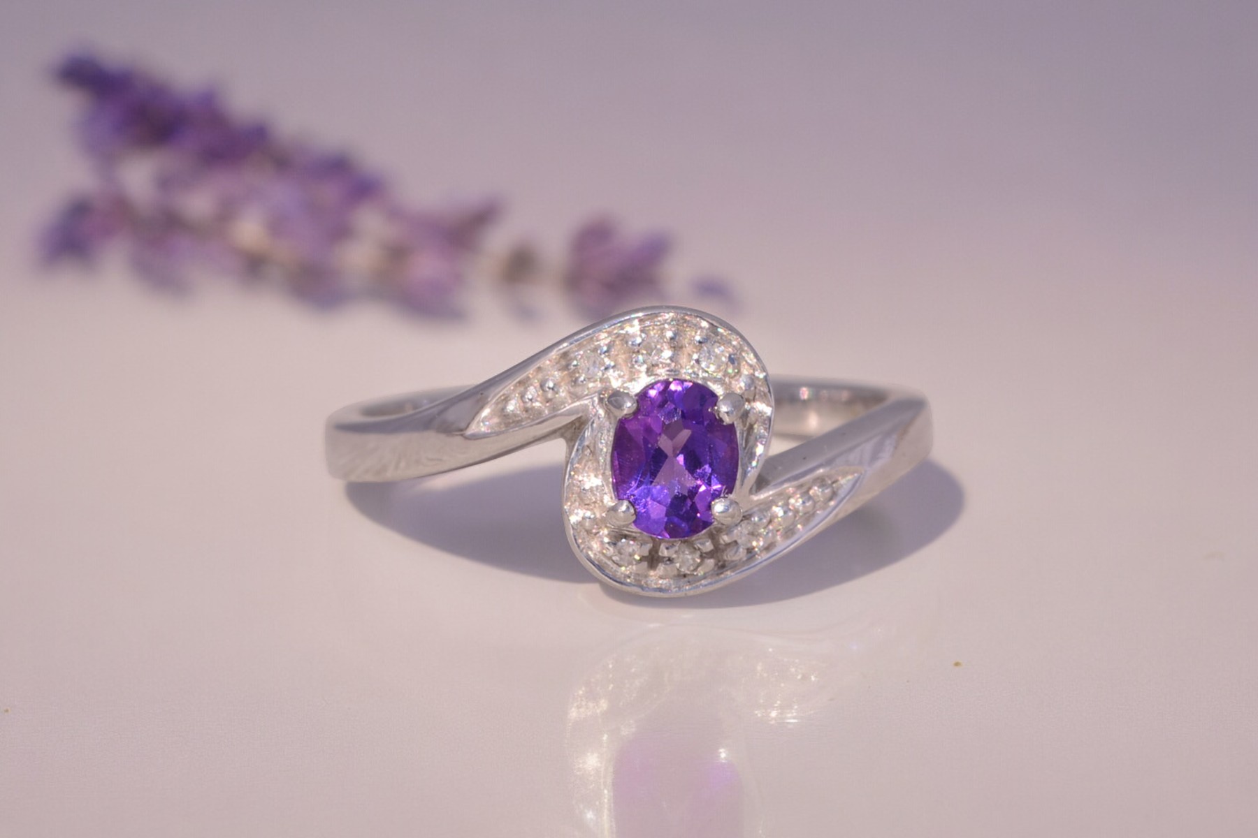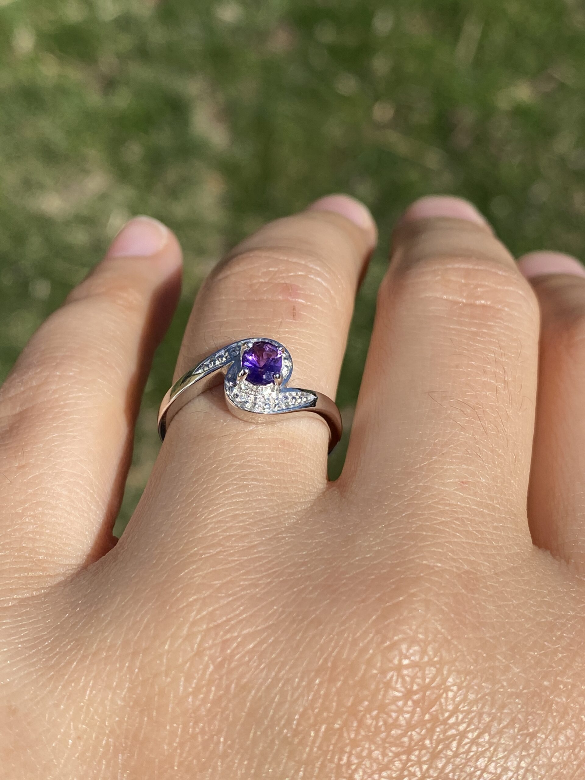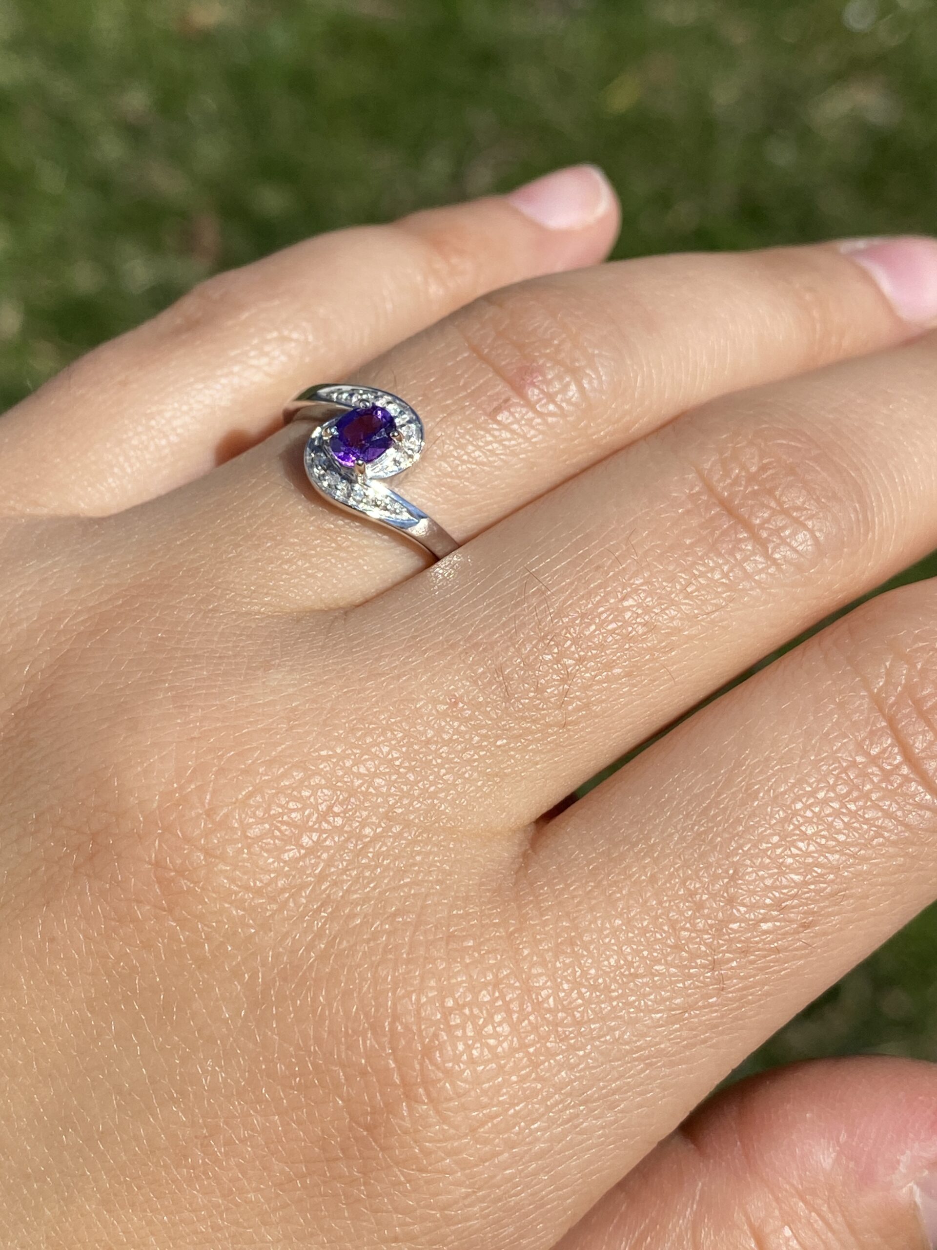 This stunning piece, known as The Amethyst Curve, features a vibrant oval-cut amethyst at its center. The deep purple gemstone is elegantly surrounded by a swirl of natural diamonds, adding brilliance and sparkle to the sleek, modern design. The graceful curves of the setting perfectly complement the amethyst, creating a harmonious and stylish look. The ring is crafted in 14 karat white gold and is currently a finger size 7 yet can be adjusted to any finger size for an additional charge upon request, ensuring a perfect fit.