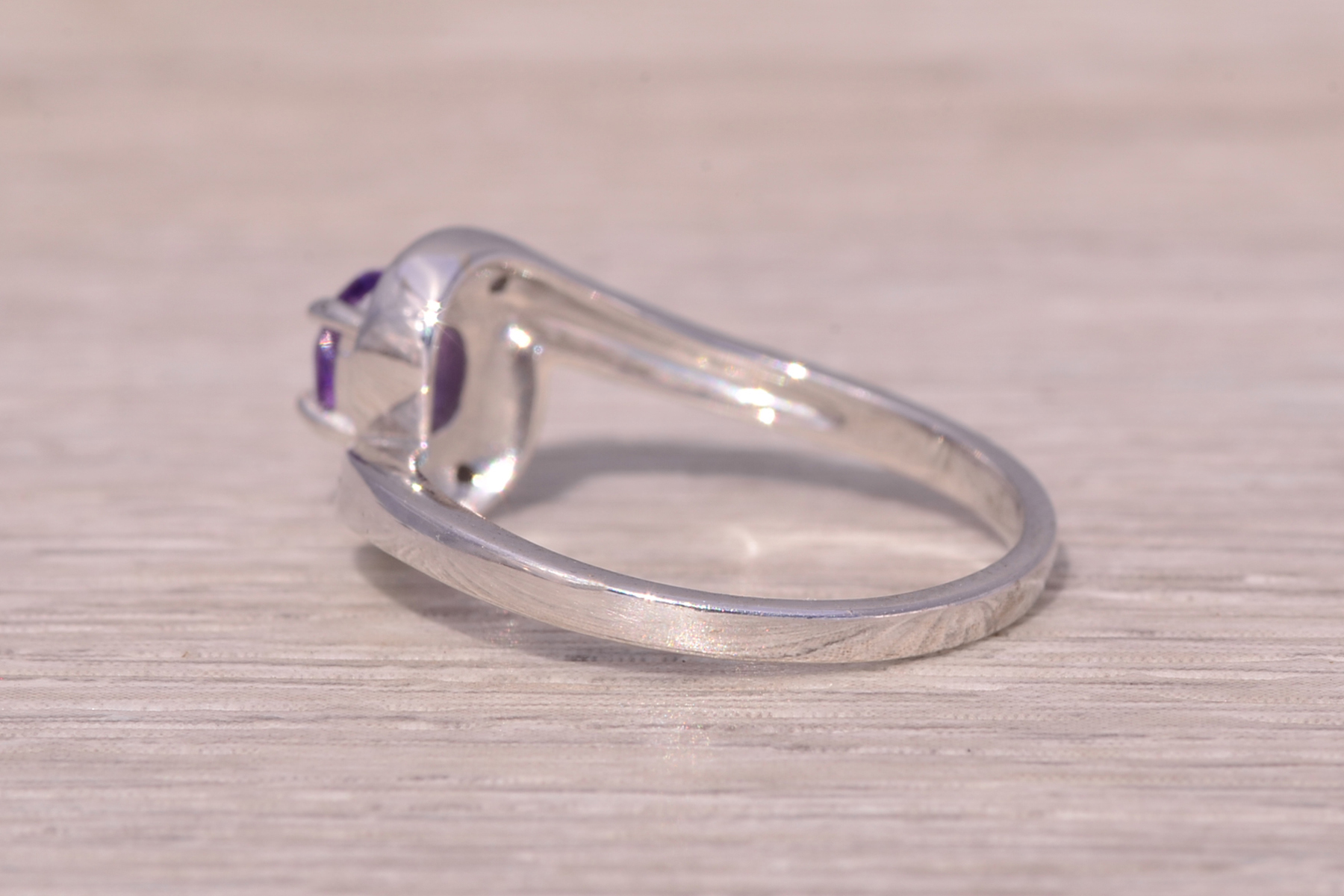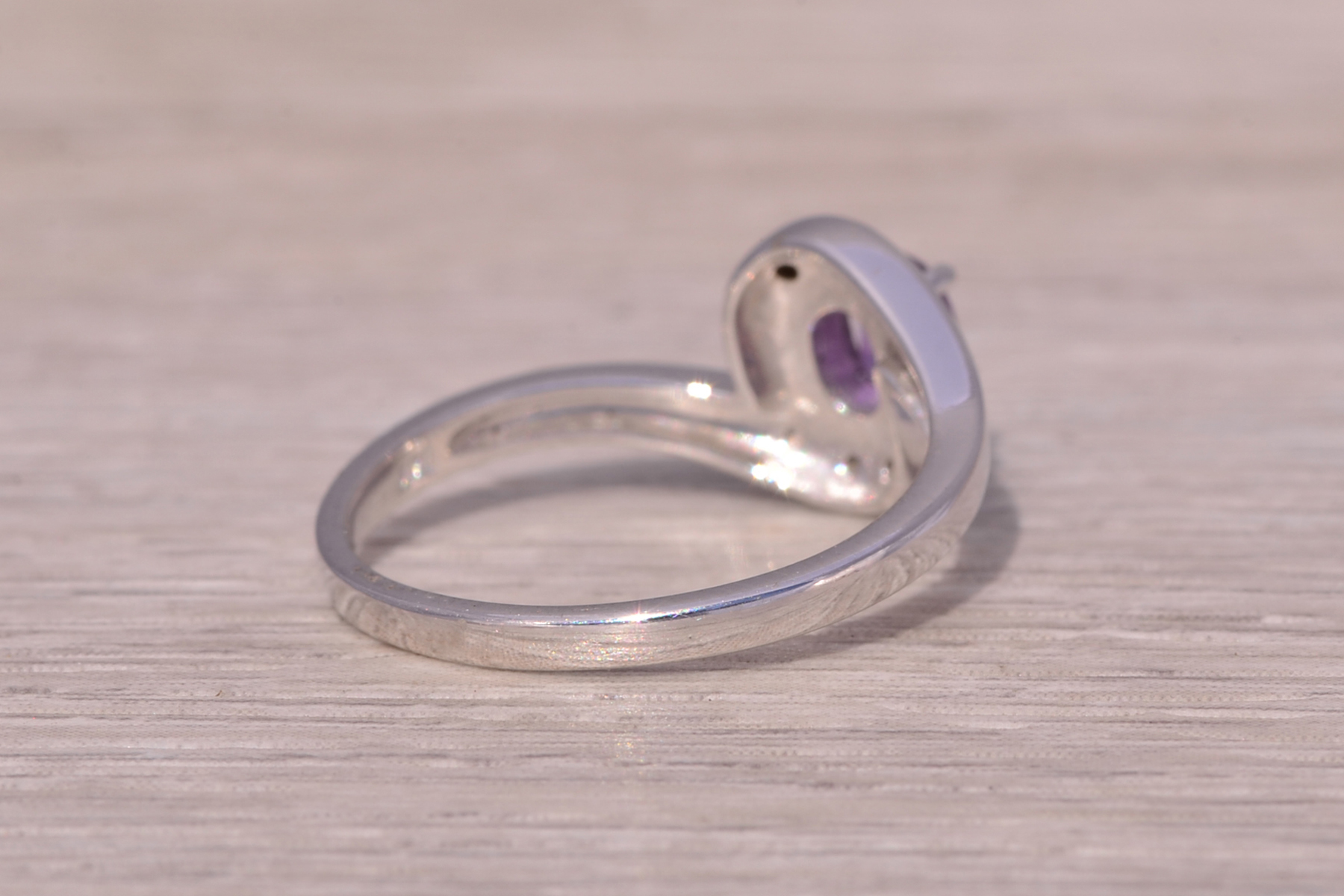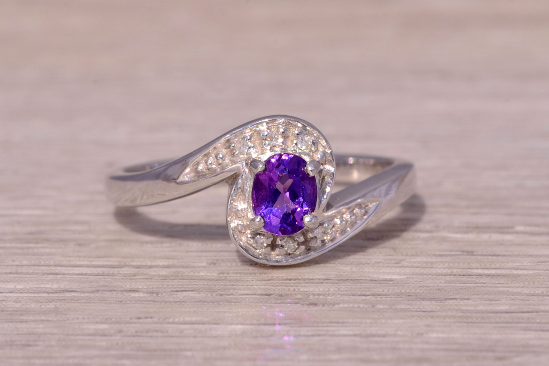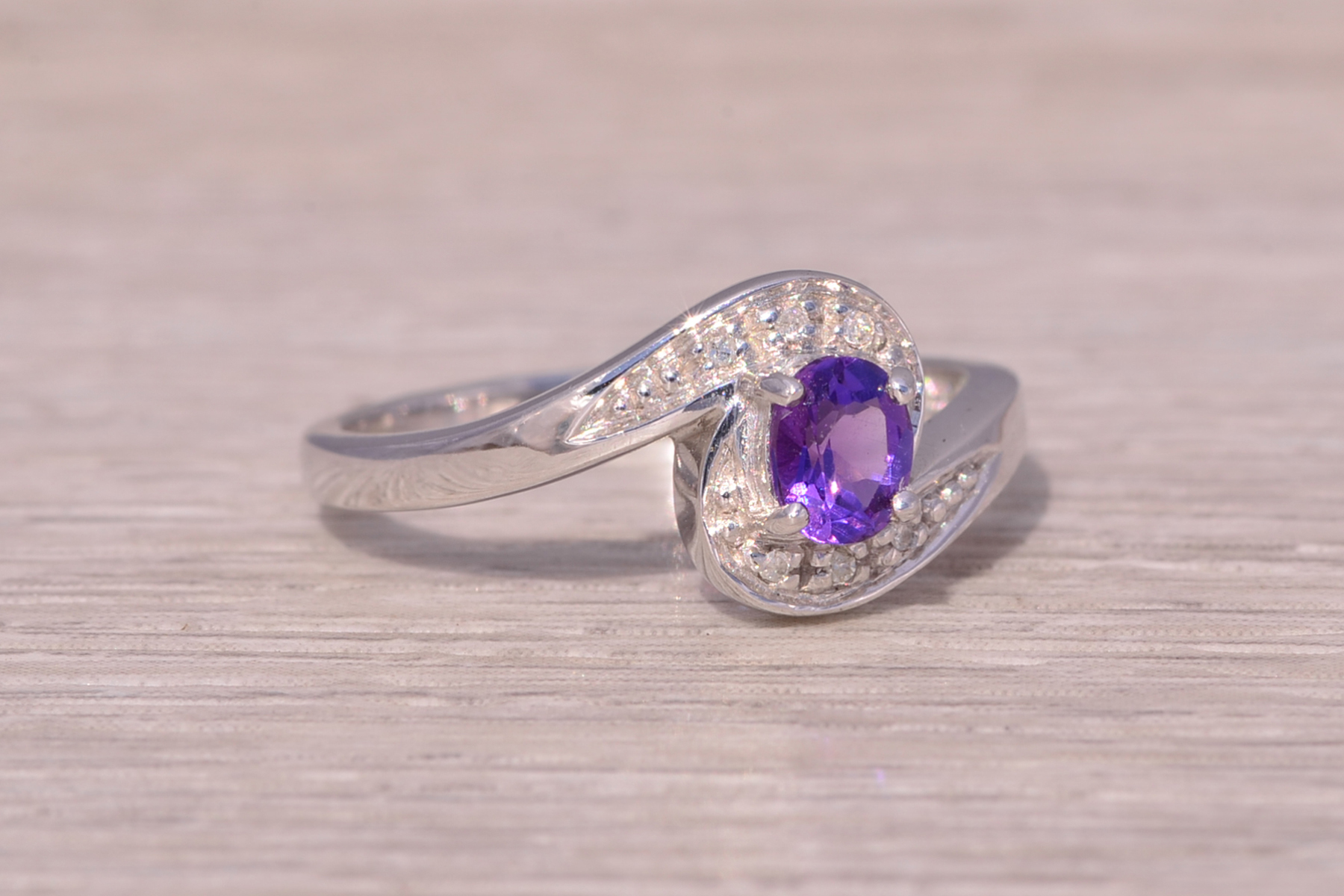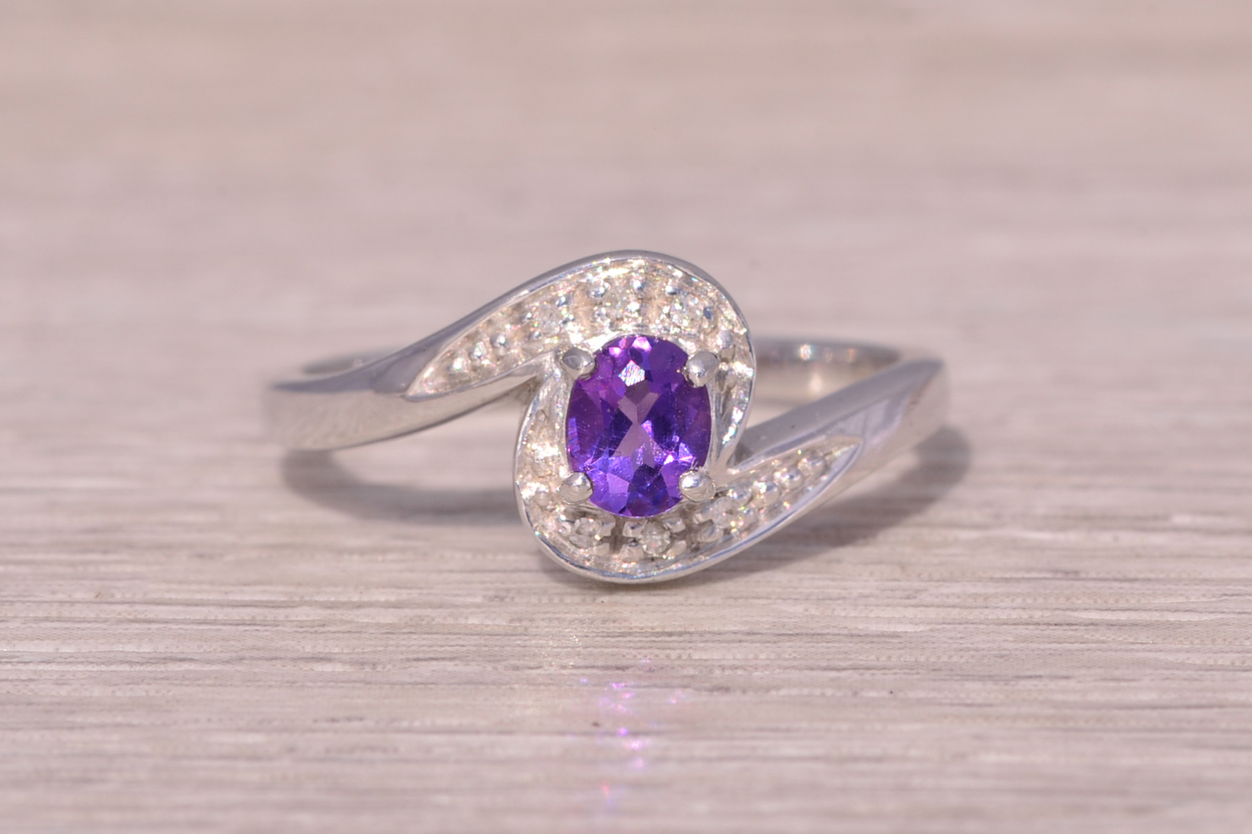 This stunning piece, known as The Amethyst Curve, features a vibrant oval-cut amethyst at its center. The deep purple gemstone is elegantly surrounded by a swirl of natural diamonds, adding brilliance and sparkle to the sleek, modern design. The graceful curves of the setting perfectly complement the amethyst, creating a harmonious and stylish look. The ring is crafted in 14 karat white gold and is currently a finger size 7 yet can be adjusted to any finger size for an additional charge upon request, ensuring a perfect fit.