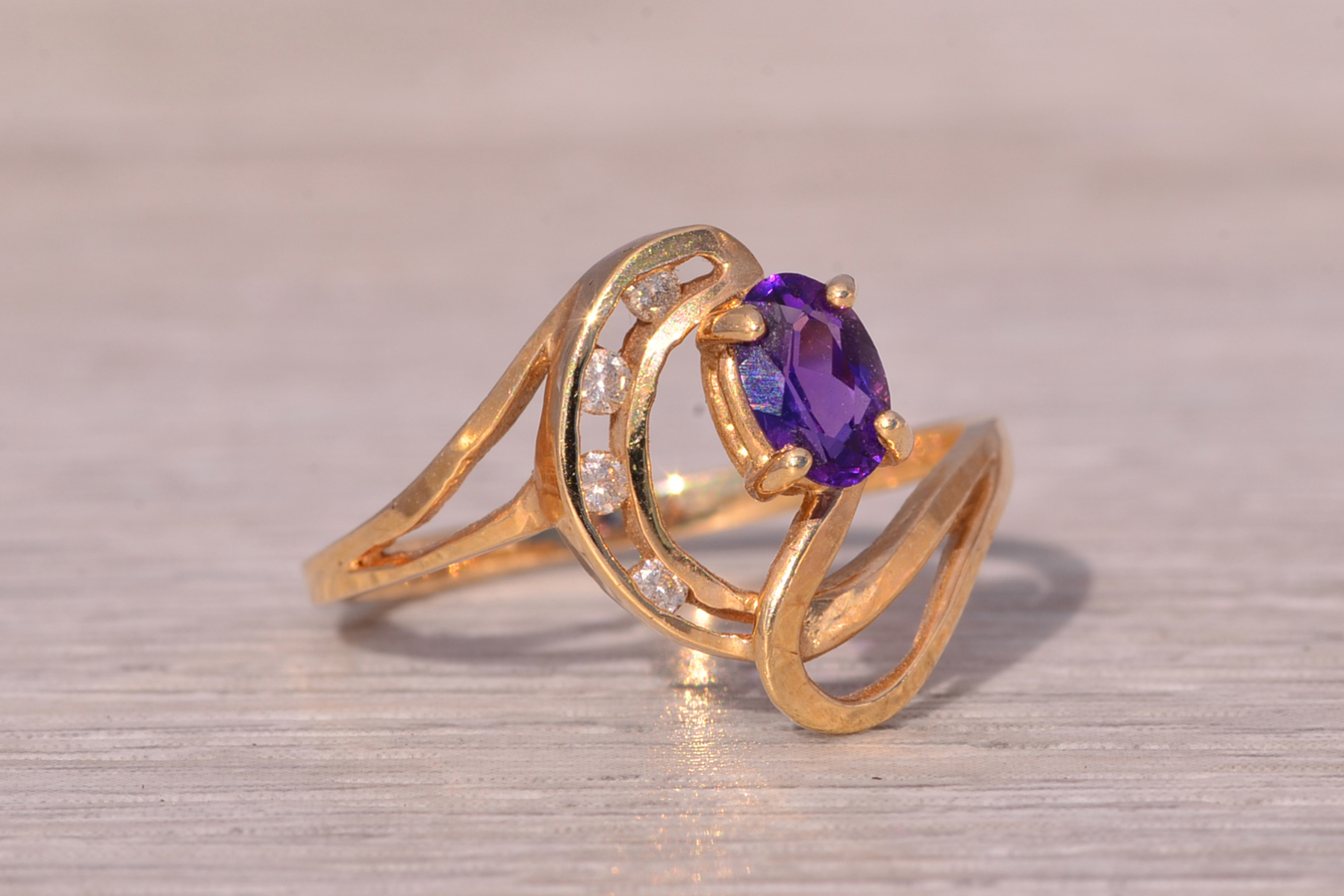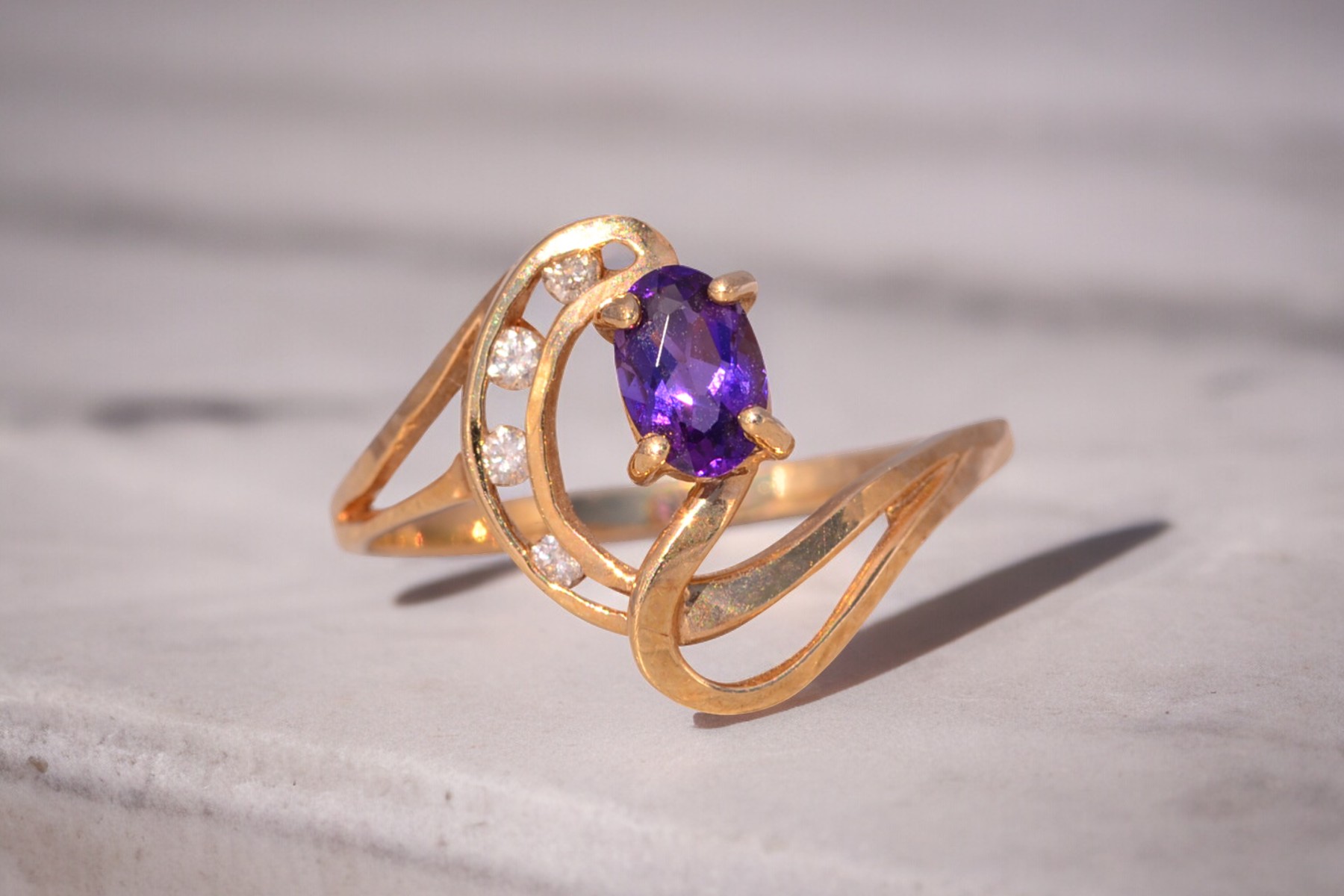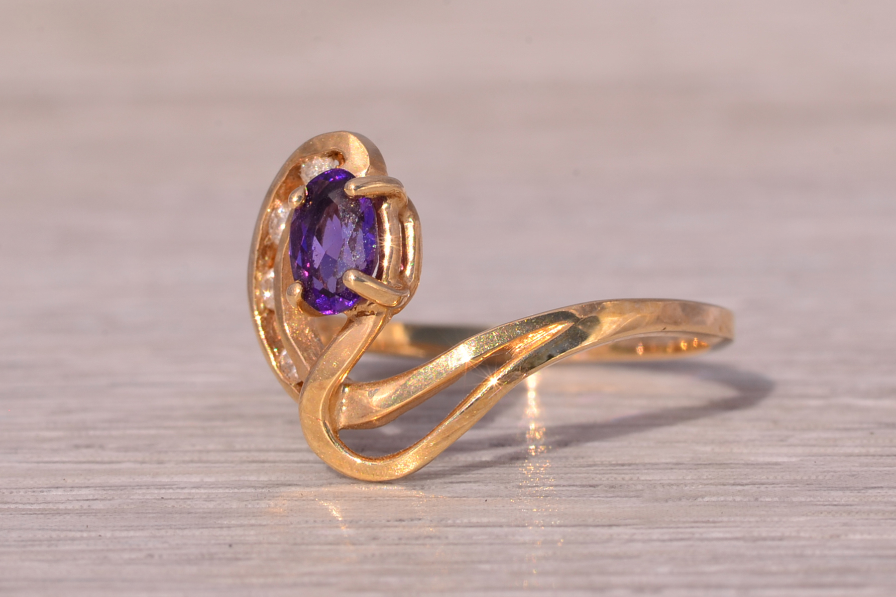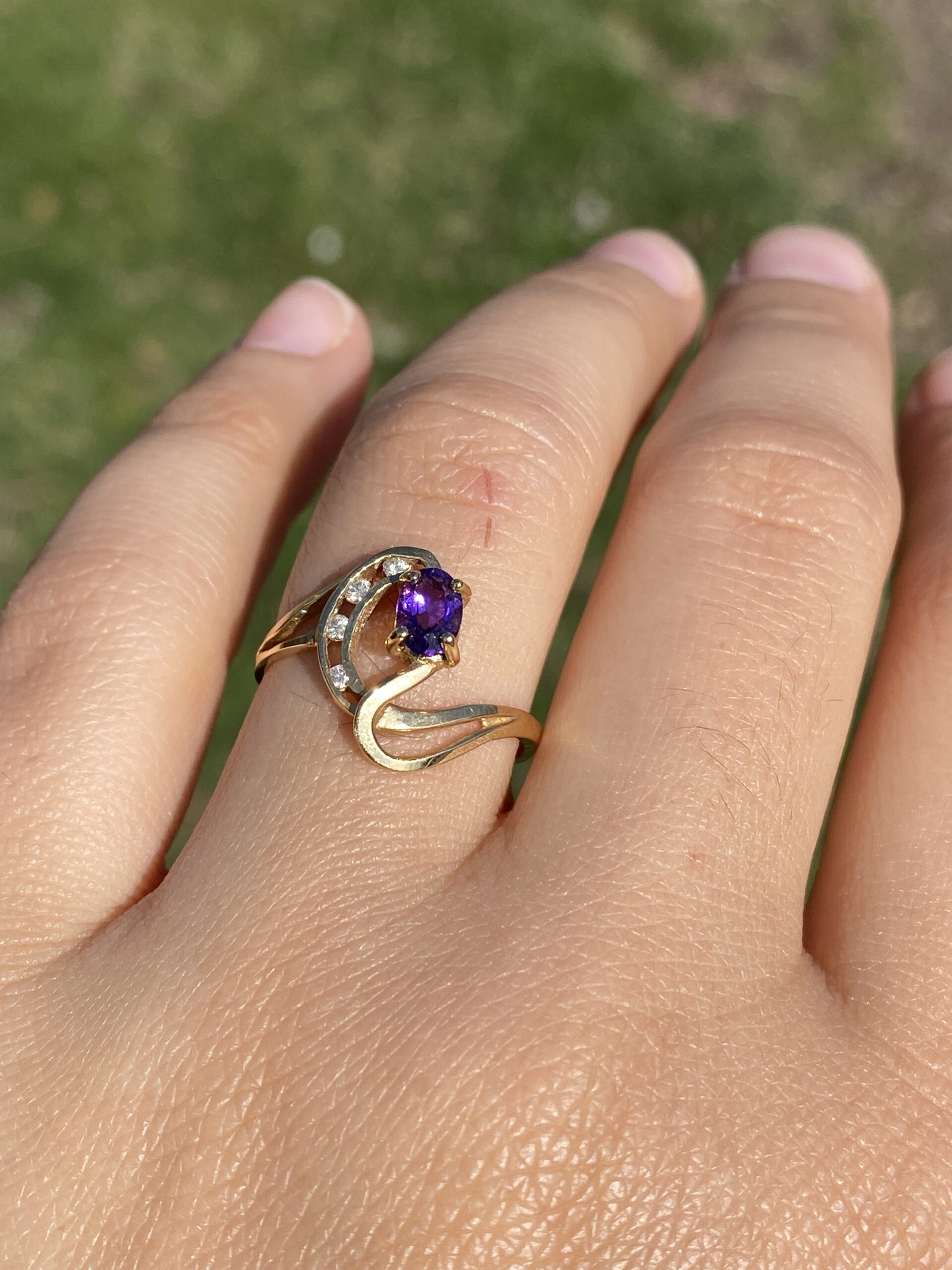 This stunning piece, known as The Amethyst Wave, features a captivating oval cut amethyst at its center. The vibrant purple amethyst is elegantly set in 14 karat yellow gold, complemented by natural diamonds accentuating the flowing wave-like design. The amethyst, with its rich color, is further enhanced by the sparkle of the natural diamonds, making this piece both elegant and eye-catching. The ring is crafted in 14 karat yellow gold and is currently a finger size 7.25 yet can be adjusted to any finger size for an additional charge upon request, ensuring a perfect fit.
