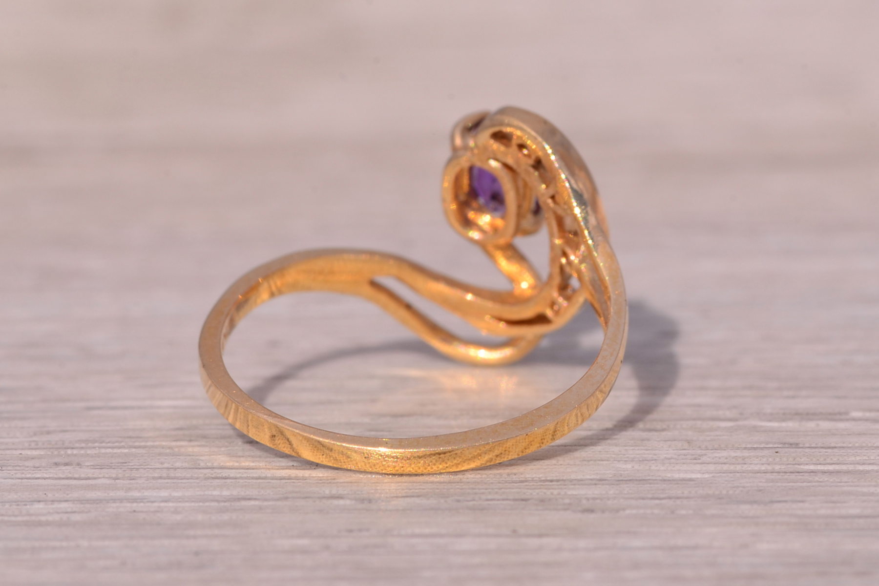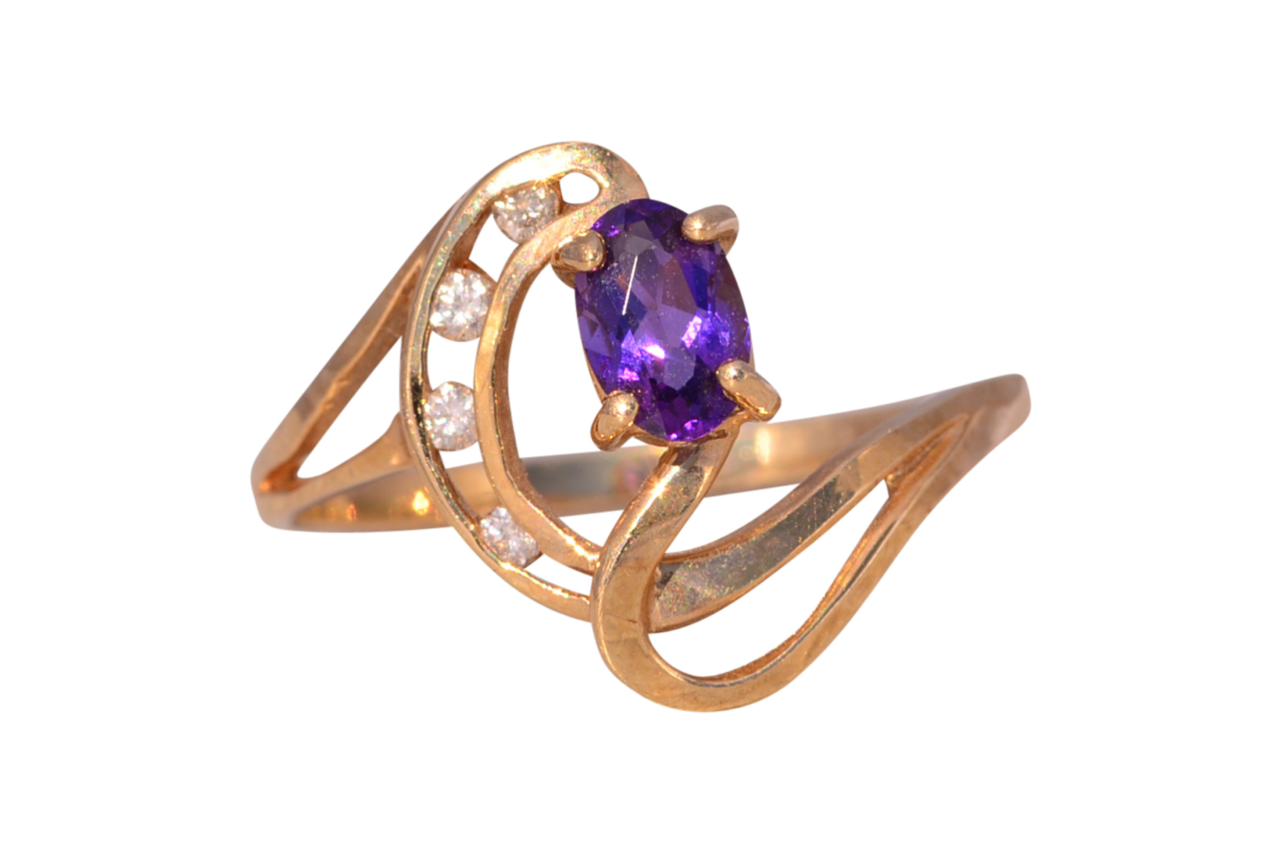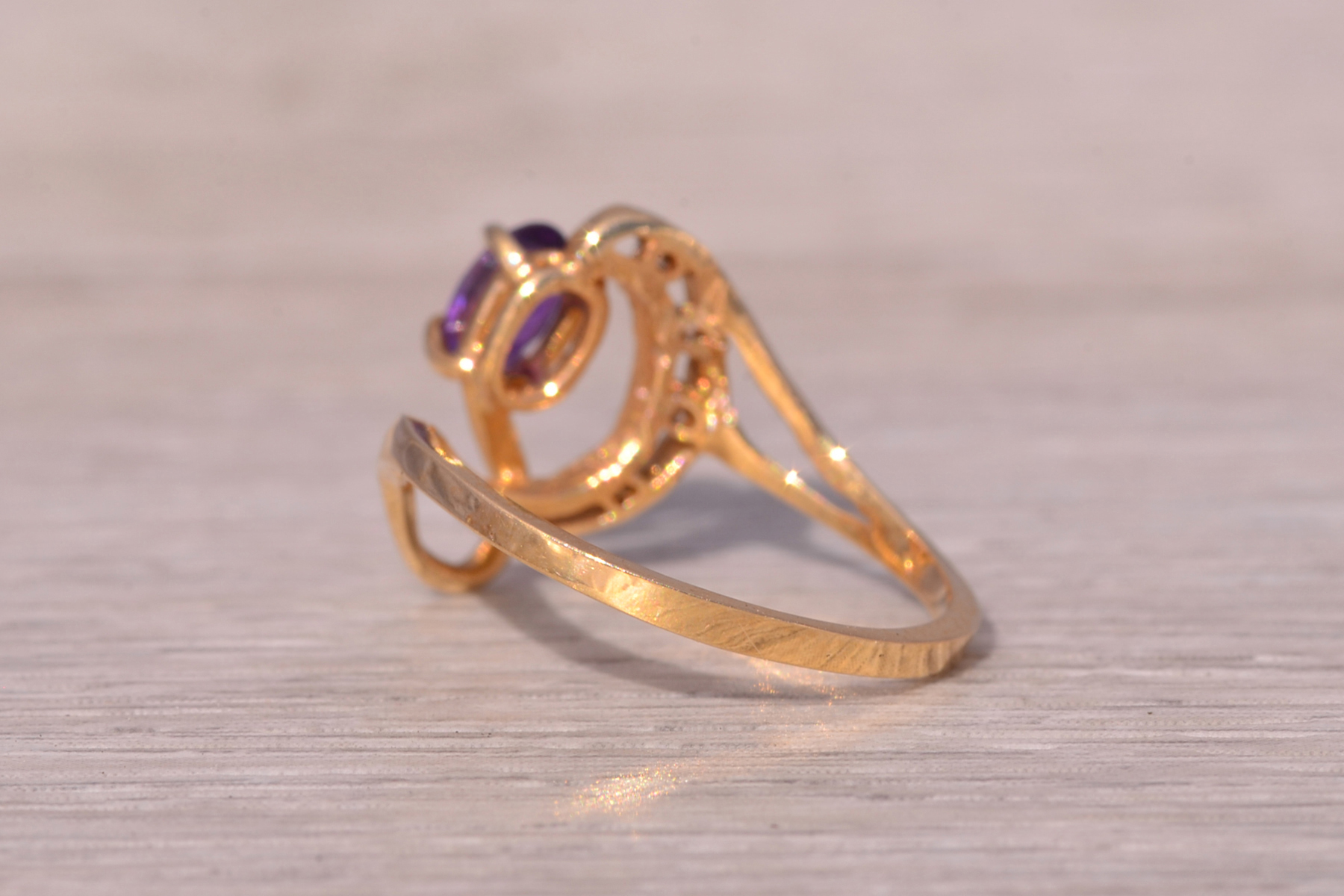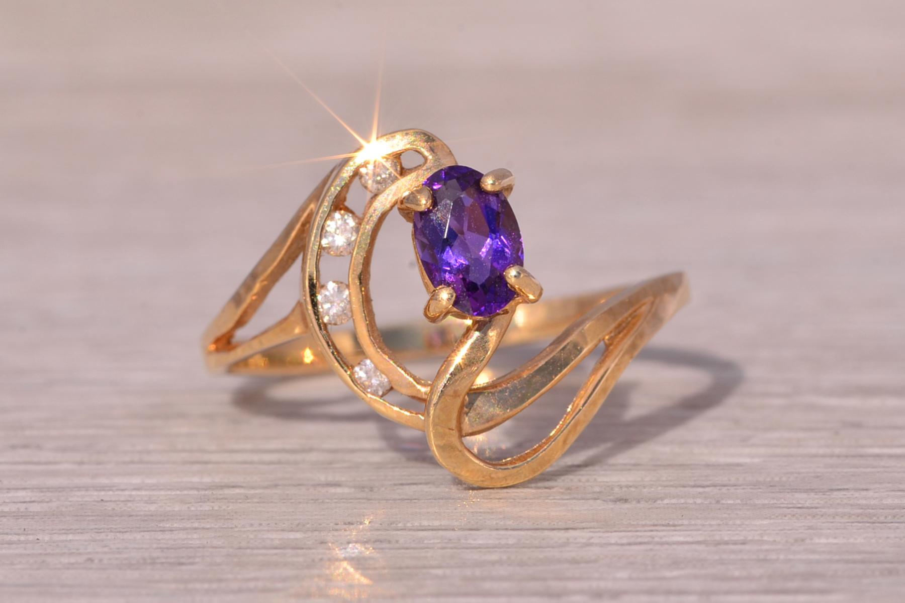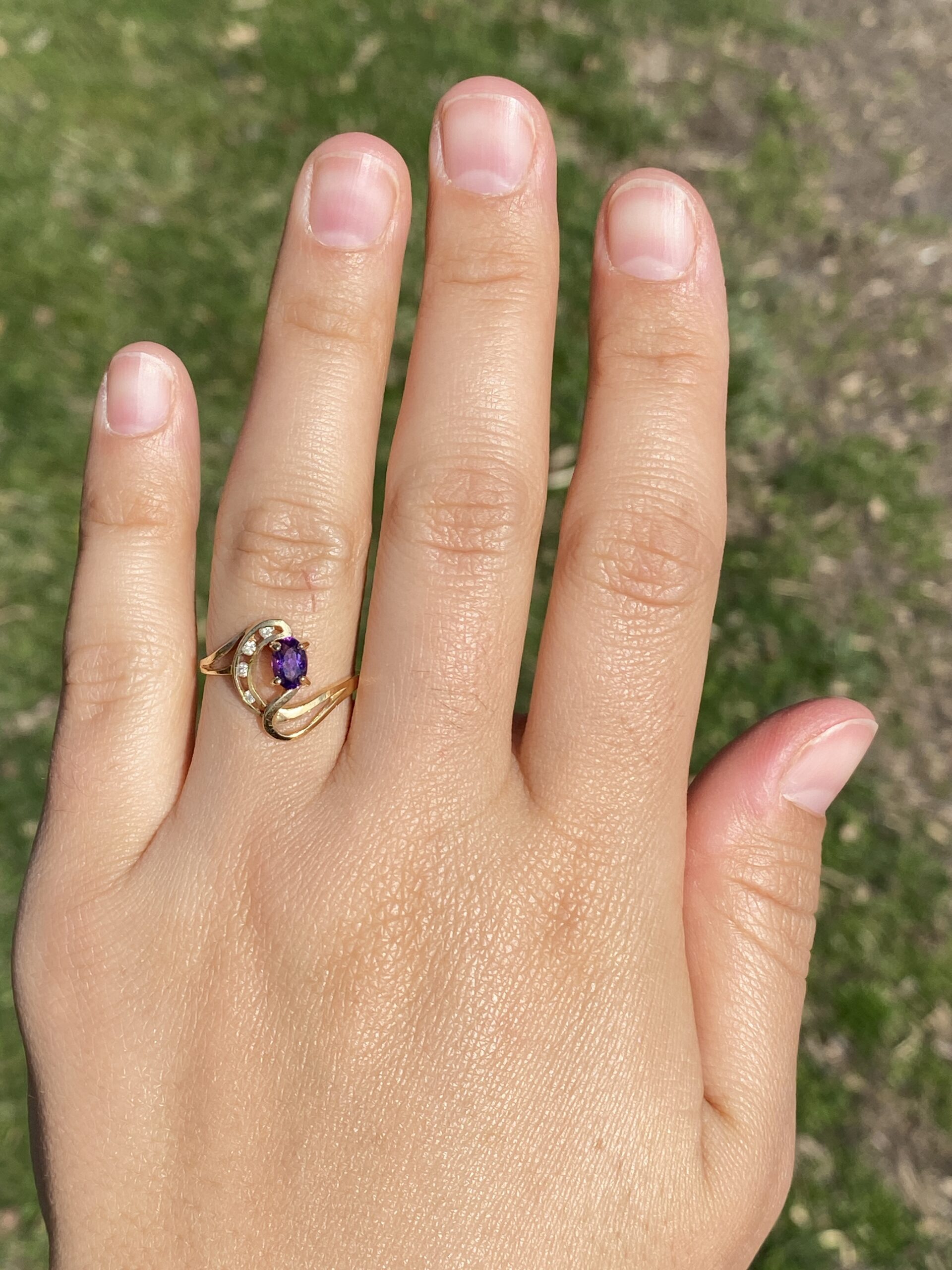 This stunning piece, known as The Amethyst Wave, features a captivating oval cut amethyst at its center. The vibrant purple amethyst is elegantly set in 14 karat yellow gold, complemented by natural diamonds accentuating the flowing wave-like design. The amethyst, with its rich color, is further enhanced by the sparkle of the natural diamonds, making this piece both elegant and eye-catching. The ring is crafted in 14 karat yellow gold and is currently a finger size 7.25 yet can be adjusted to any finger size for an additional charge upon request, ensuring a perfect fit.