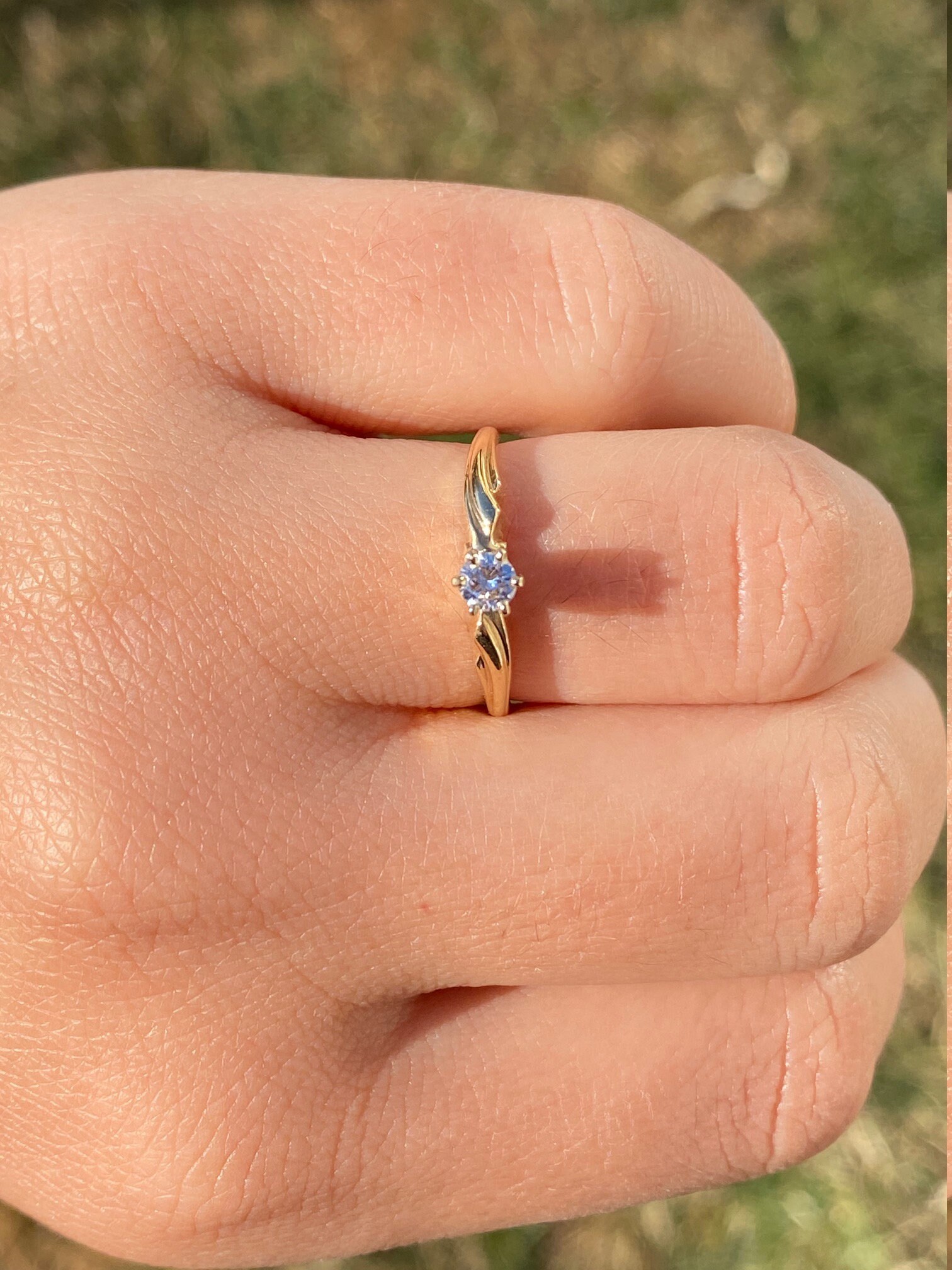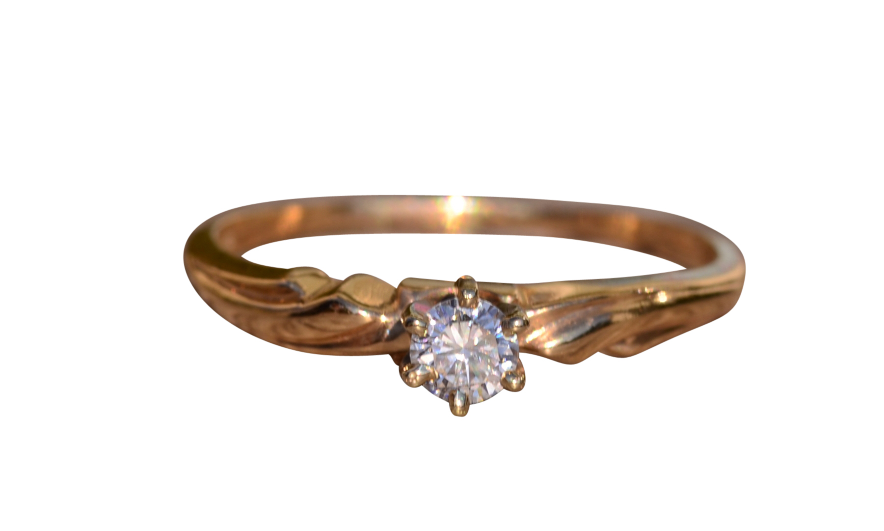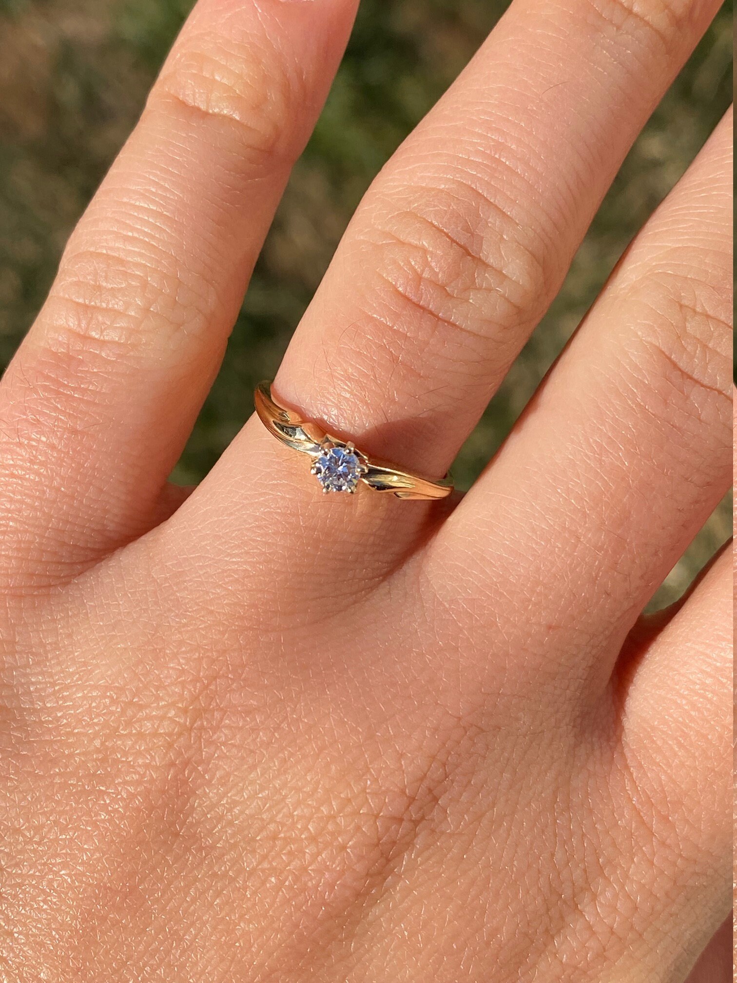 The Artamon: Vintage Yellow Gold Promise Ring with Natural Diamond. The ring is safely six prong set with a 0.16 carat natural round brilliant cut diamond. The diamond has an approximate Gemological Institute of America clarity grade of Vs2 and a color grade of G. A very slight gold carving finishes the shank and completes the look. The ring is signed Exquisite and crafted in 14 karat yellow gold. The ring is a finger size 6 1/2 yet can be adjusted to any finger size for an additional charge.