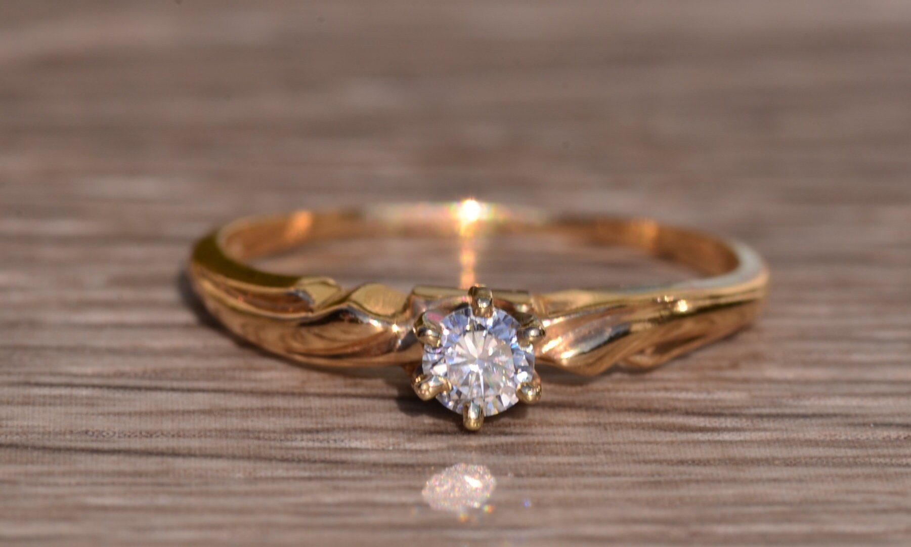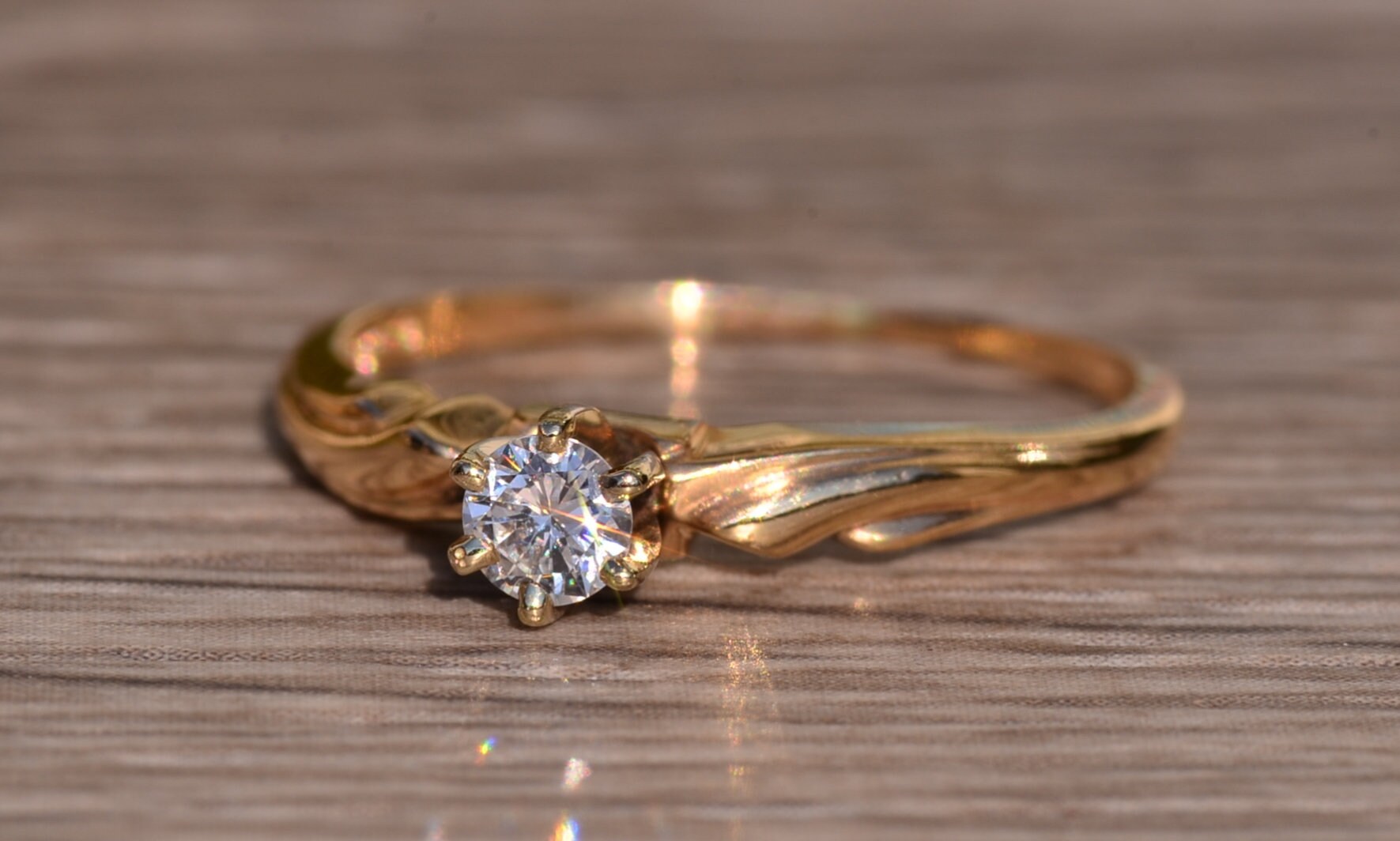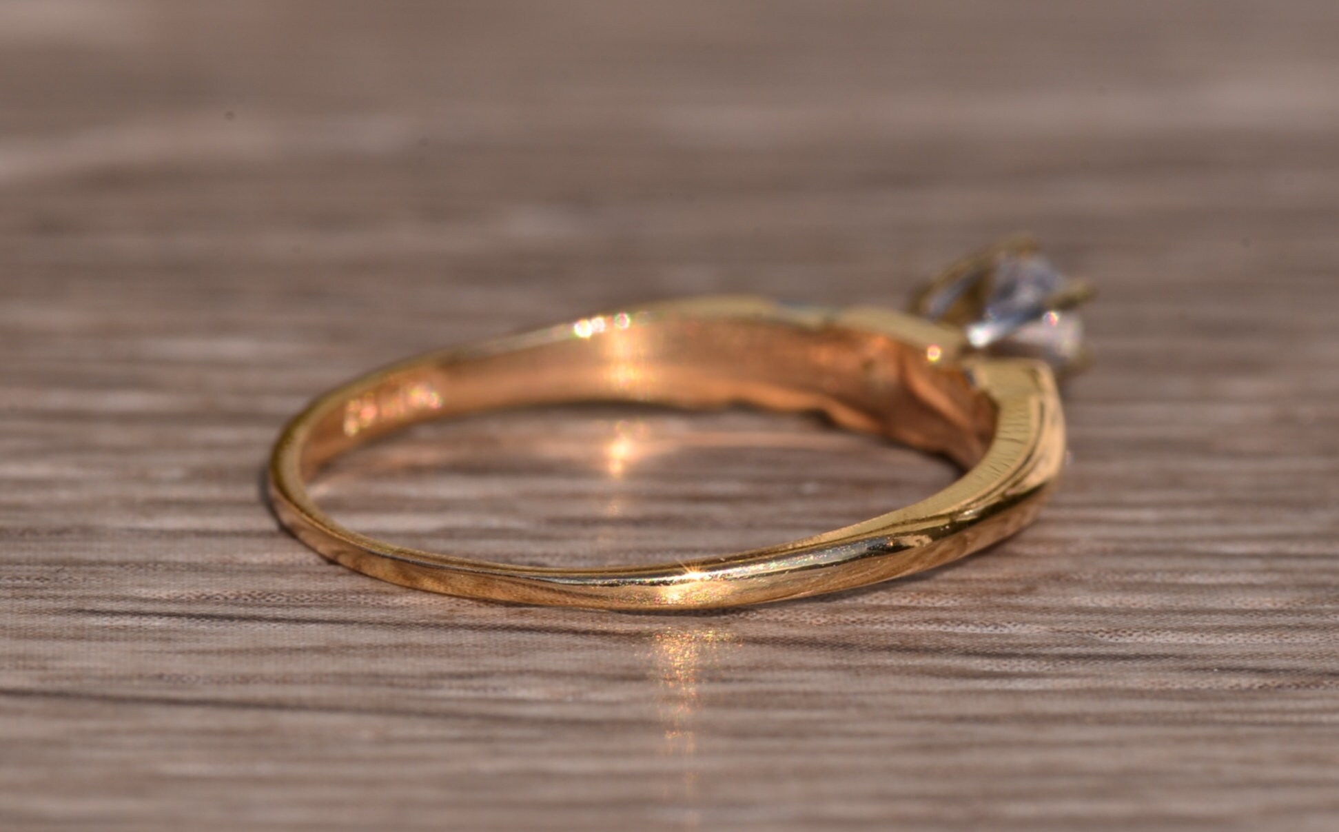 The Artamon: Vintage Yellow Gold Promise Ring with Natural Diamond. The ring is safely six prong set with a 0.16 carat natural round brilliant cut diamond. The diamond has an approximate Gemological Institute of America clarity grade of Vs2 and a color grade of G. A very slight gold carving finishes the shank and completes the look. The ring is signed Exquisite and crafted in 14 karat yellow gold. The ring is a finger size 6 1/2 yet can be adjusted to any finger size for an additional charge.