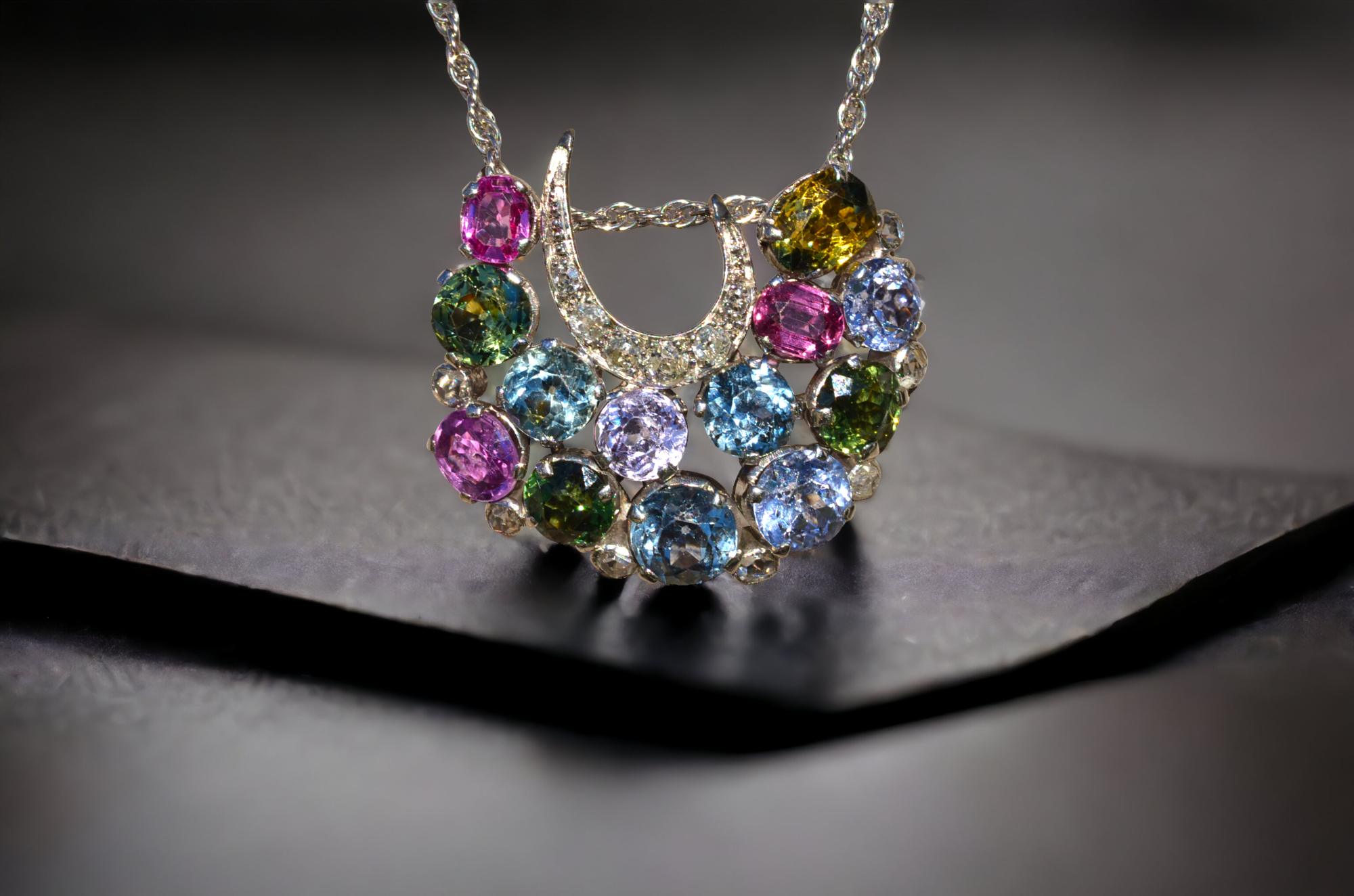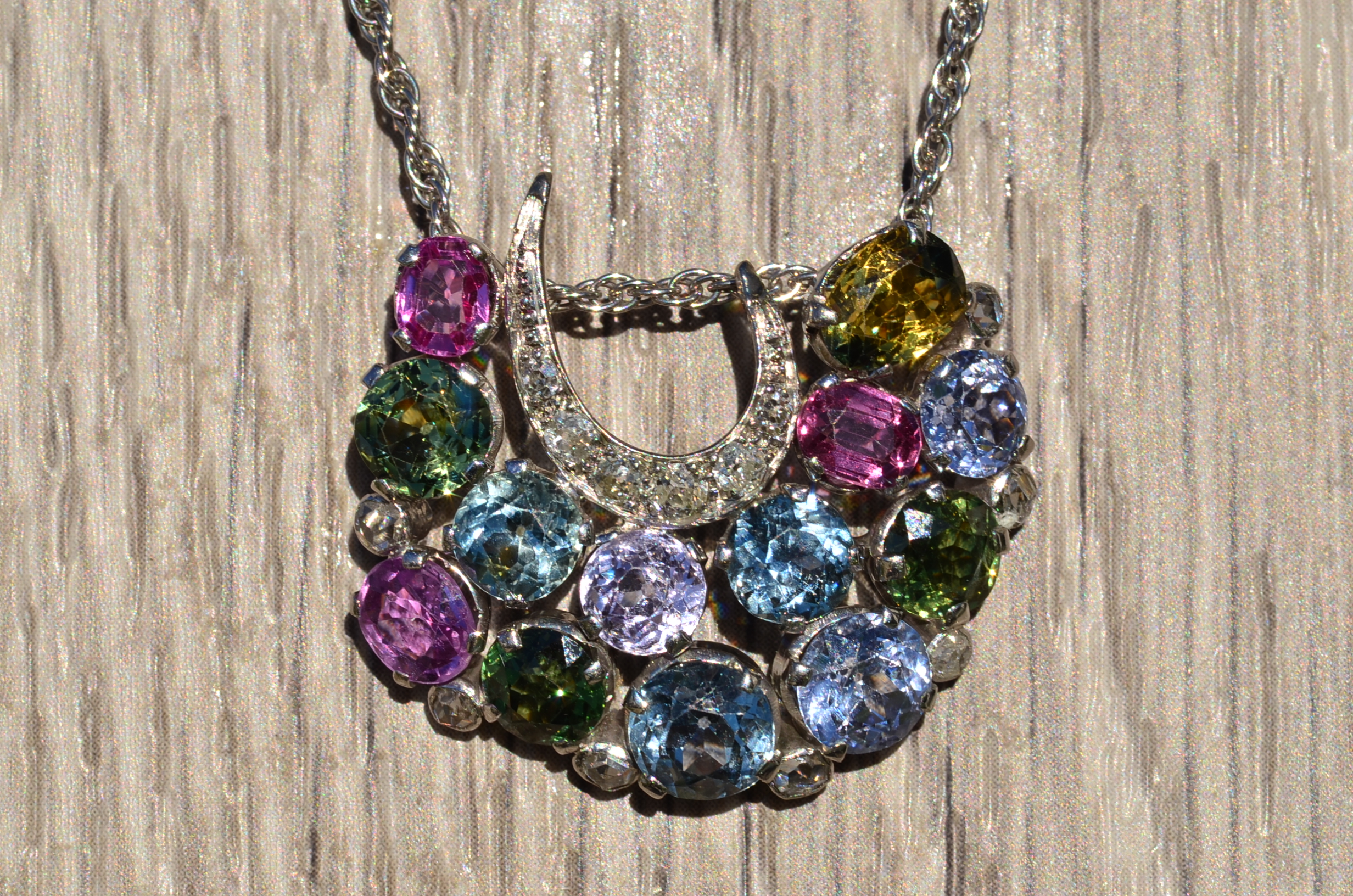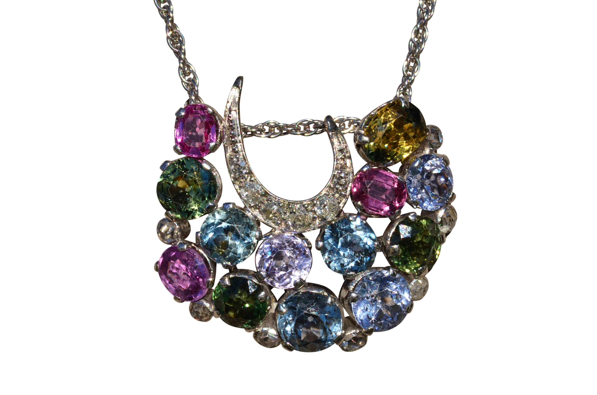 Elaborate Antique Multicolored Sapphire and Diamond Pendant in 18 Karat white Gold. Measuring approximately 1 inch x 1.25 inches, this stunning pendant features 11.11 carats of old cut vibrant colored sapphires with 0.50 carats of old mine and rose cut diamonds throughout. The double bail allows for easy sliding on and off of the chain of your choice. Add a pop of color to your outfit with this one of a kind original pendant.