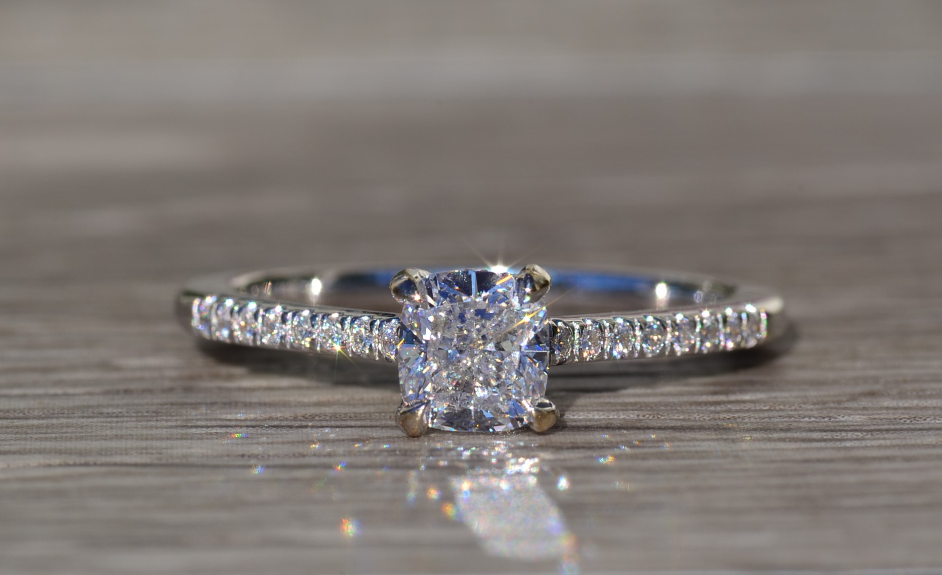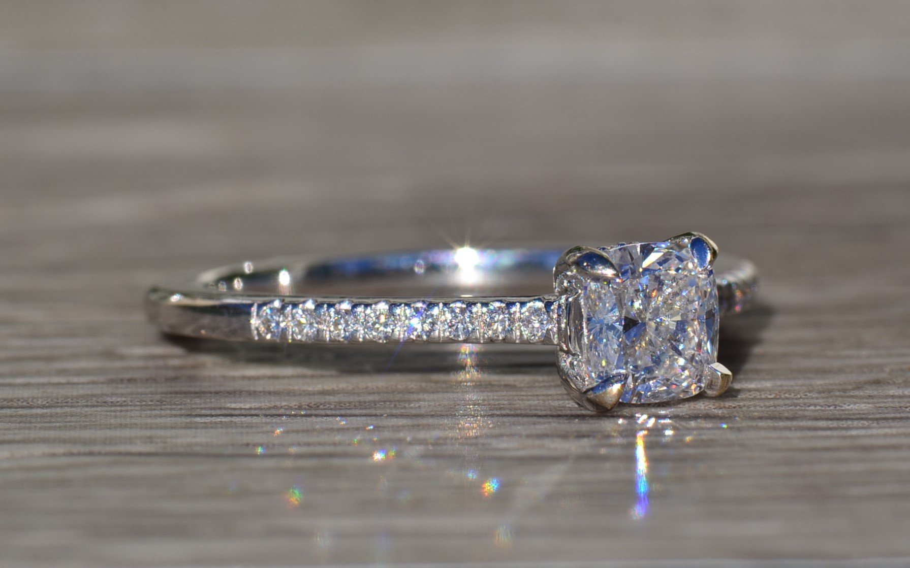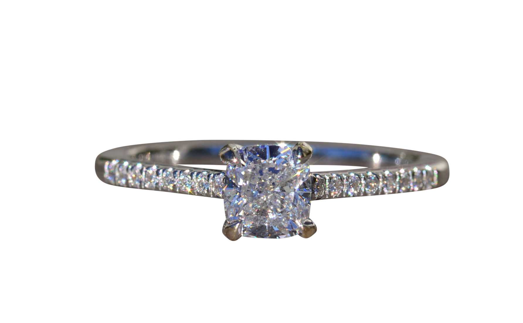 The Astoria: Ladies 18K Gold Engagement Ring set with 0.81 CT Diamond. Crafted in 18 karat white gold, this contemporary style engagement ring centers on a 0.81 carat cushion cut diamond. The diamond has a Gemological Institute of America clarity grade of VVS2 and a color grade of F. Accent diamonds continue down either side of the center adding sparkle and shine to the entire piece. This ring is a finger size 7.25 yet is able to be adjusted to any finger size for an additional charge.