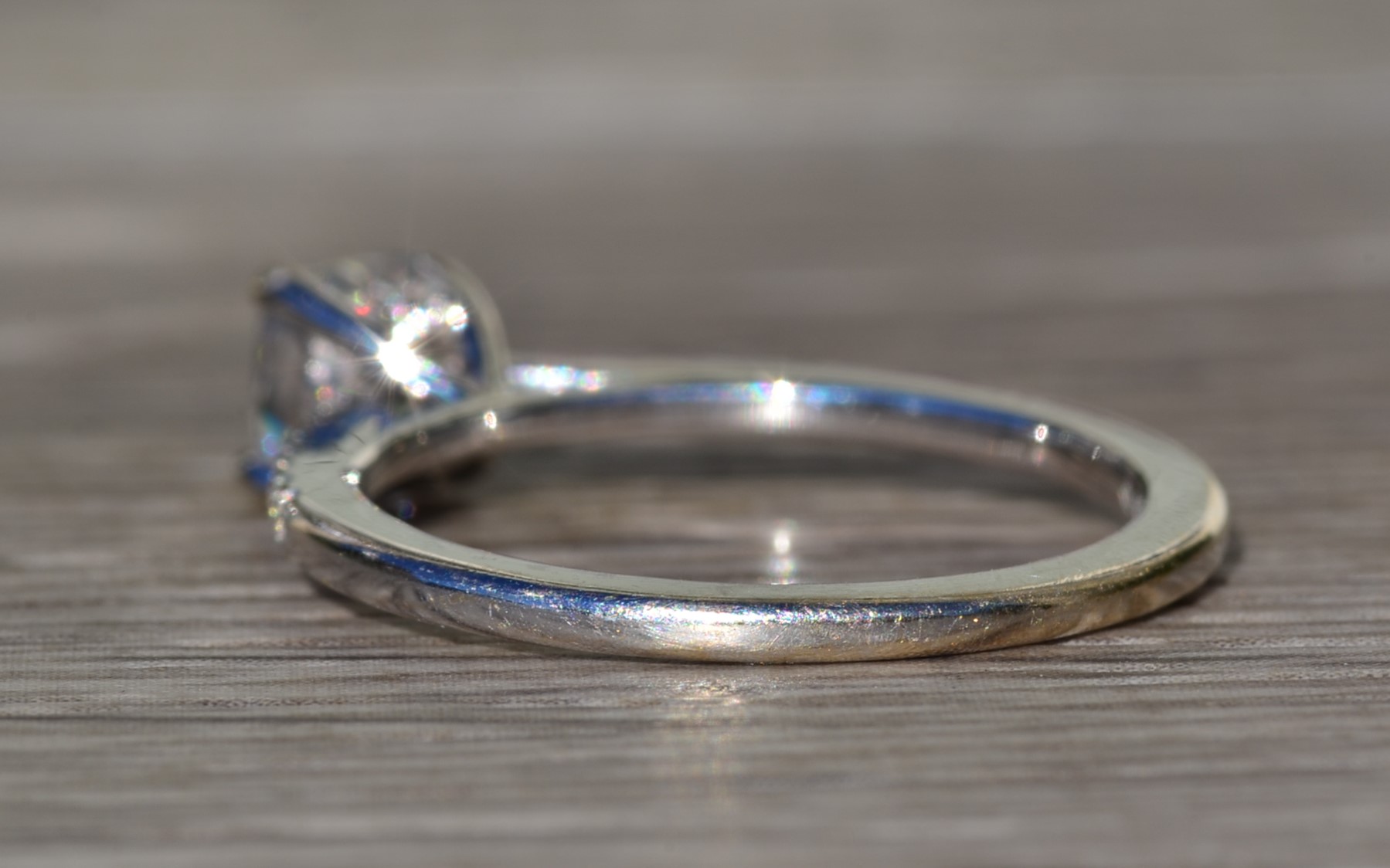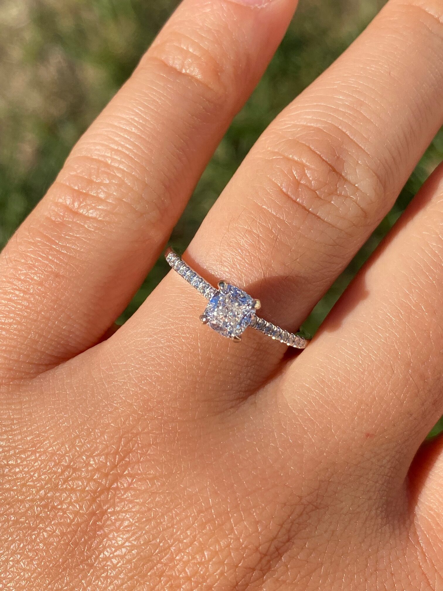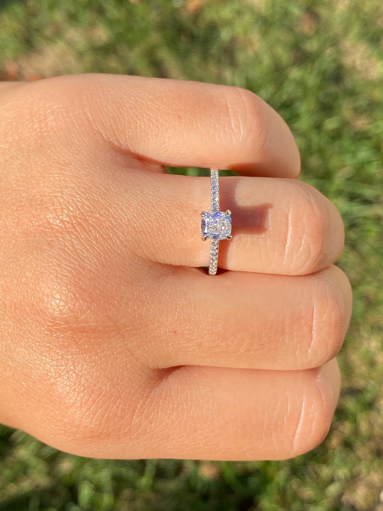 The Astoria: Ladies 18K Gold Engagement Ring set with 0.81 CT Diamond. Crafted in 18 karat white gold, this contemporary style engagement ring centers on a 0.81 carat cushion cut diamond. The diamond has a Gemological Institute of America clarity grade of VVS2 and a color grade of F. Accent diamonds continue down either side of the center adding sparkle and shine to the entire piece. This ring is a finger size 7.25 yet is able to be adjusted to any finger size for an additional charge.