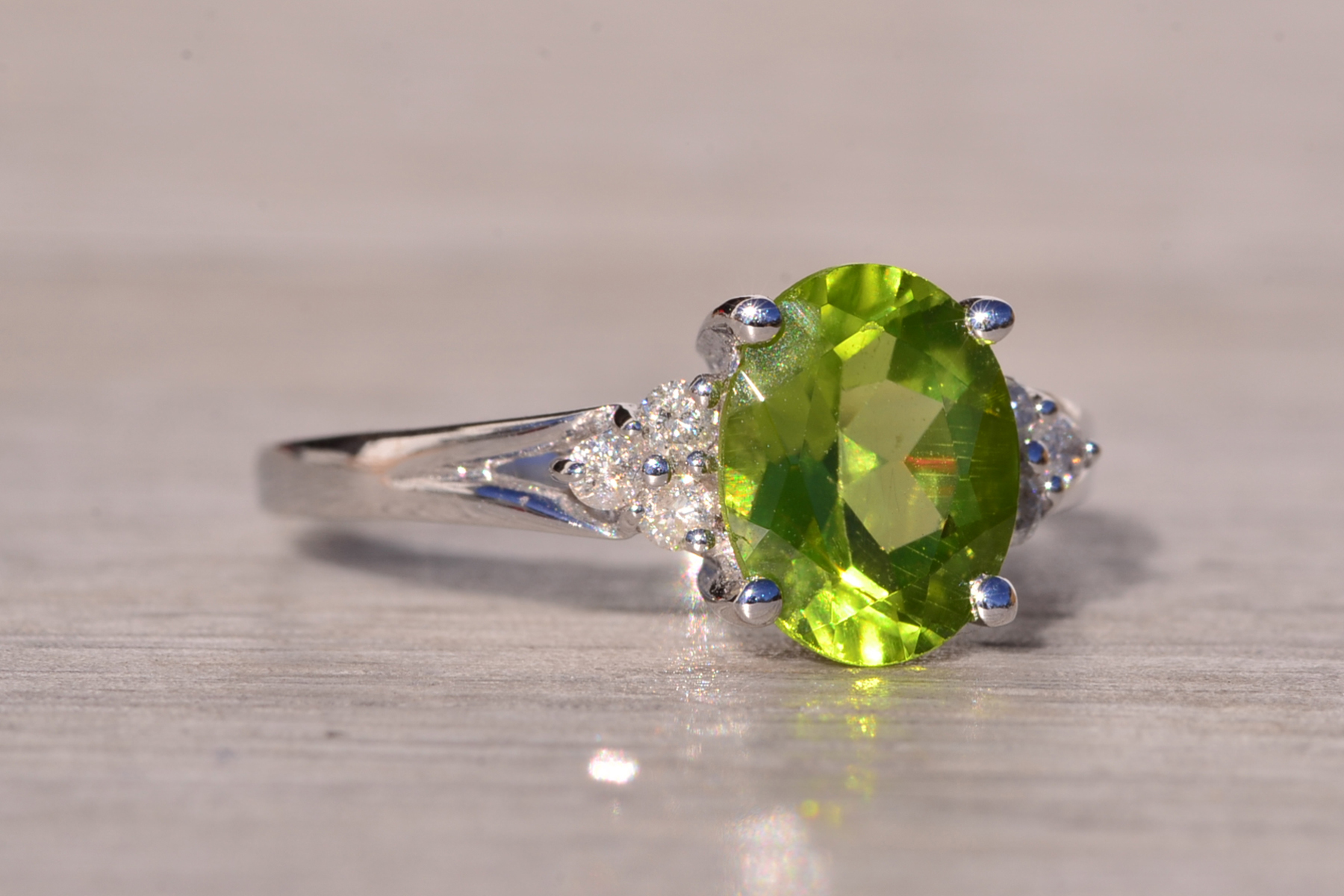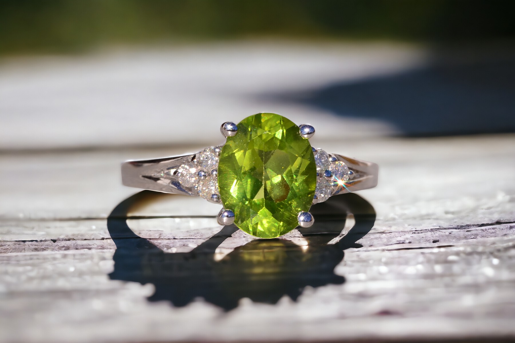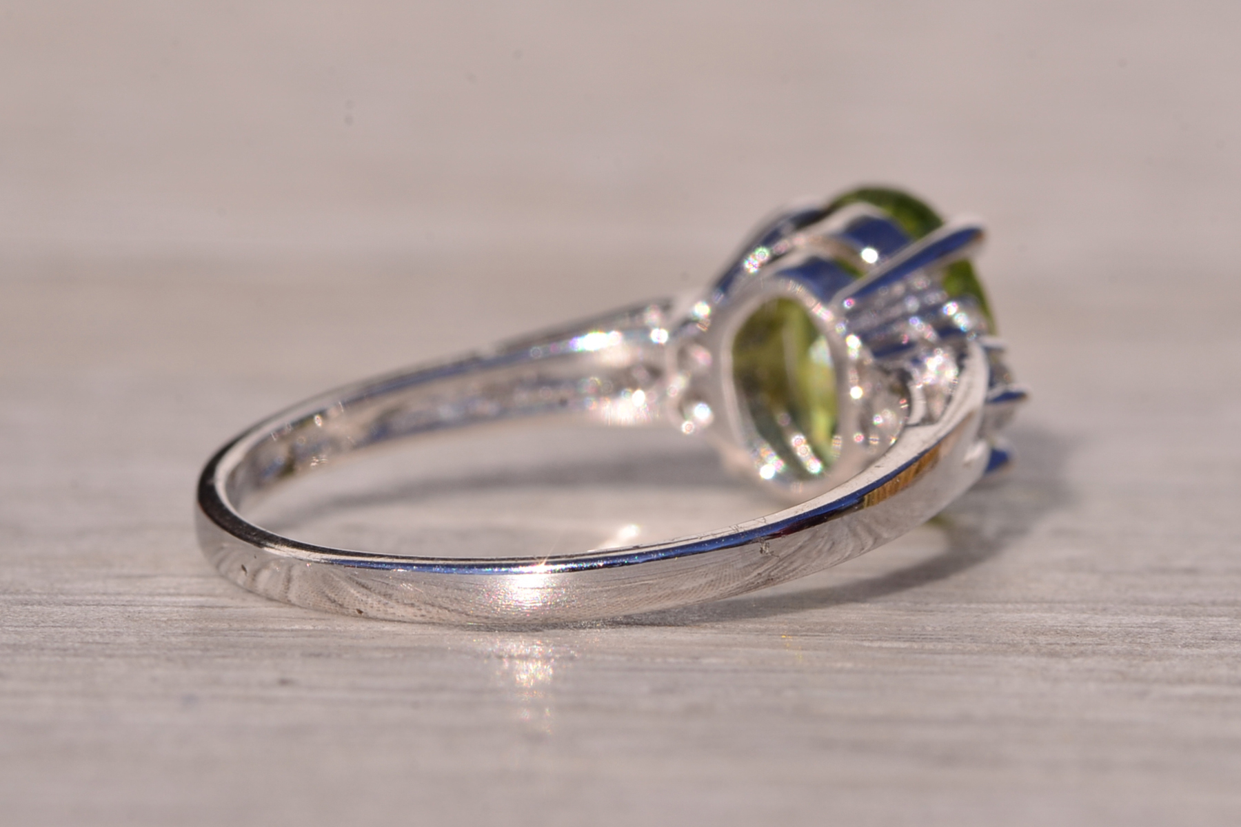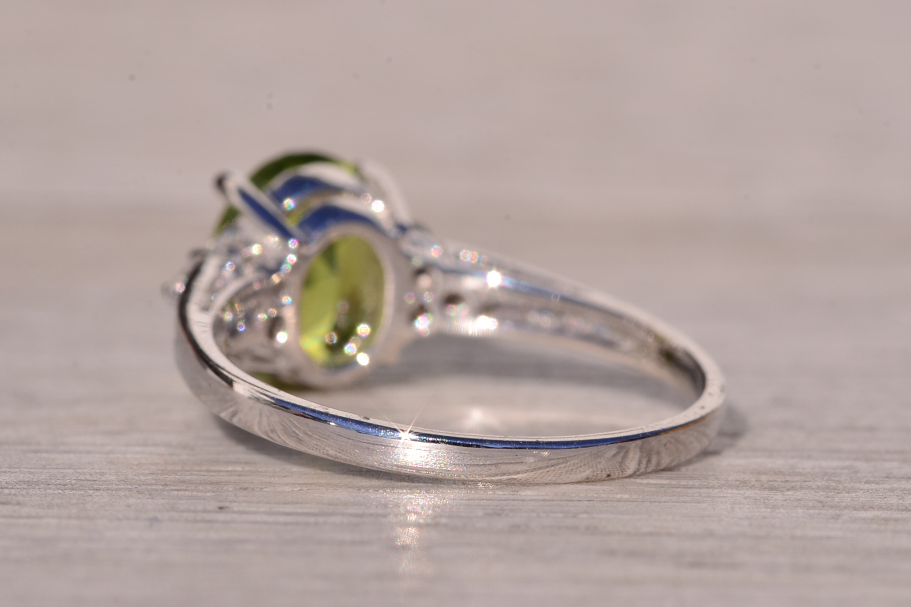 The Augusto: Natural Peridot and Diamond Ring in White Gold. This captivating ring showcases a brilliant 9x7mm oval-cut natural peridot at its center, radiating vivid hues of green with remarkable brilliance. Flanking the peridot on either side are three round brilliant cut natural diamonds, arranged in a graceful two-to-one pattern, adding a touch of sophistication and sparkle to the design. The elegant composition is further accentuated by a small split in the shank at the top, offering a subtle yet distinctive detail. Crafted with precision in 14 karat white gold, this ring epitomizes grace and elegance. Currently sized at 7, it can be adjusted to fit any finger size for an additional fee, ensuring a perfect and comfortable fit for its wearer.
