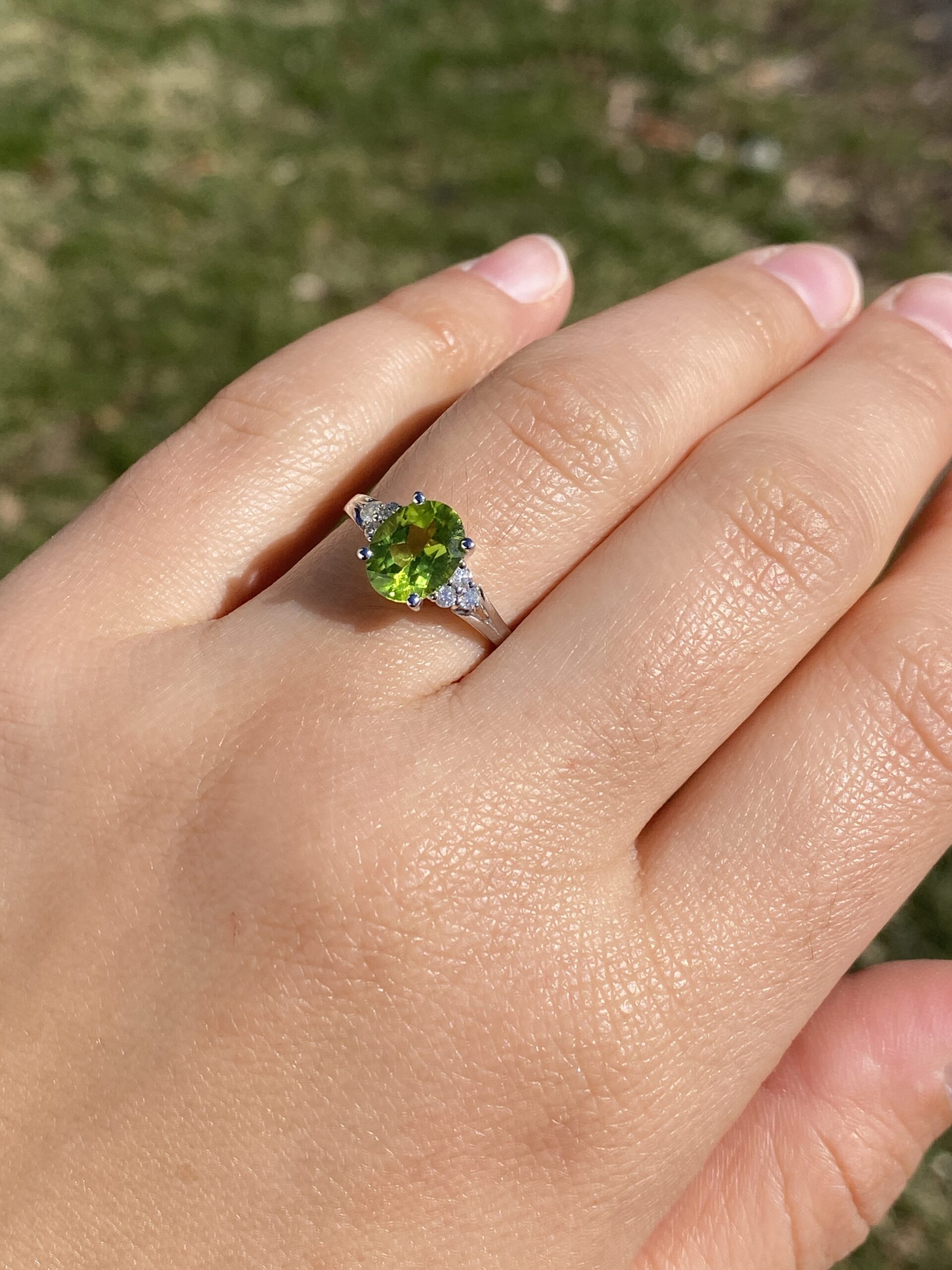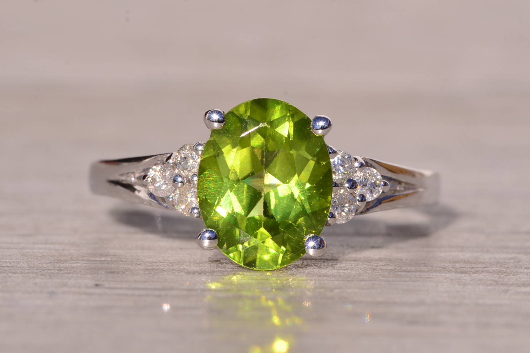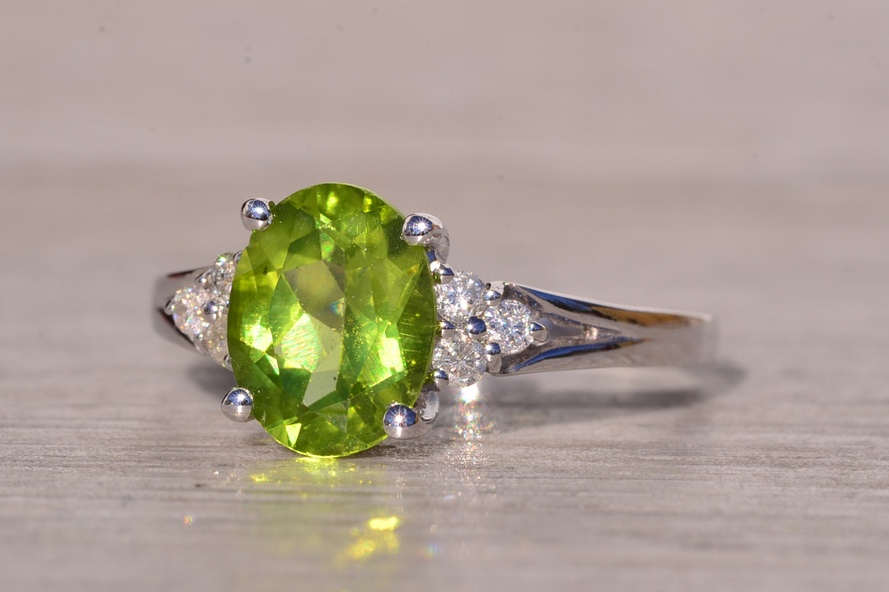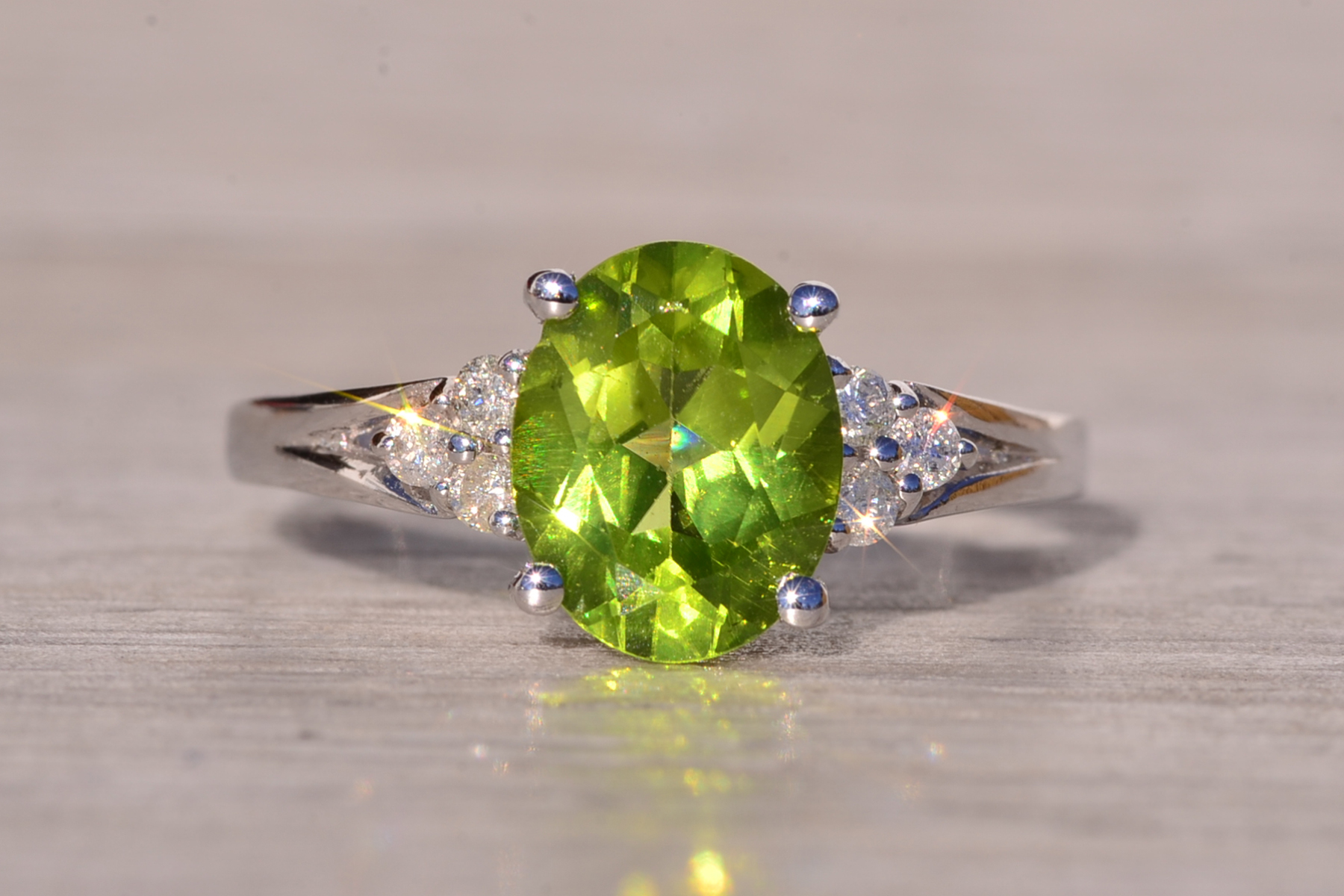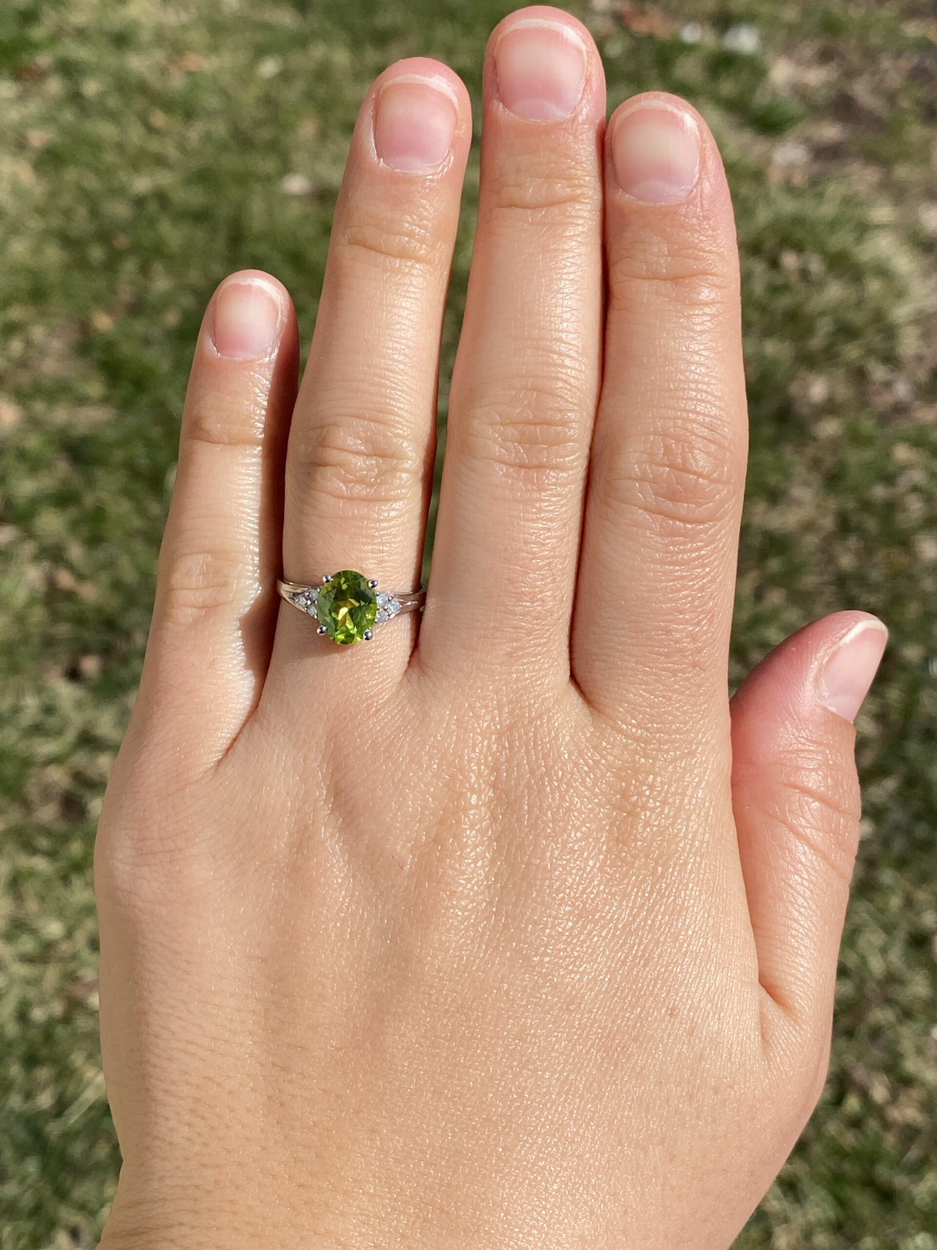 The Augusto: Natural Peridot and Diamond Ring in White Gold. This captivating ring showcases a brilliant 9x7mm oval-cut natural peridot at its center, radiating vivid hues of green with remarkable brilliance. Flanking the peridot on either side are three round brilliant cut natural diamonds, arranged in a graceful two-to-one pattern, adding a touch of sophistication and sparkle to the design. The elegant composition is further accentuated by a small split in the shank at the top, offering a subtle yet distinctive detail. Crafted with precision in 14 karat white gold, this ring epitomizes grace and elegance. Currently sized at 7, it can be adjusted to fit any finger size for an additional fee, ensuring a perfect and comfortable fit for its wearer.