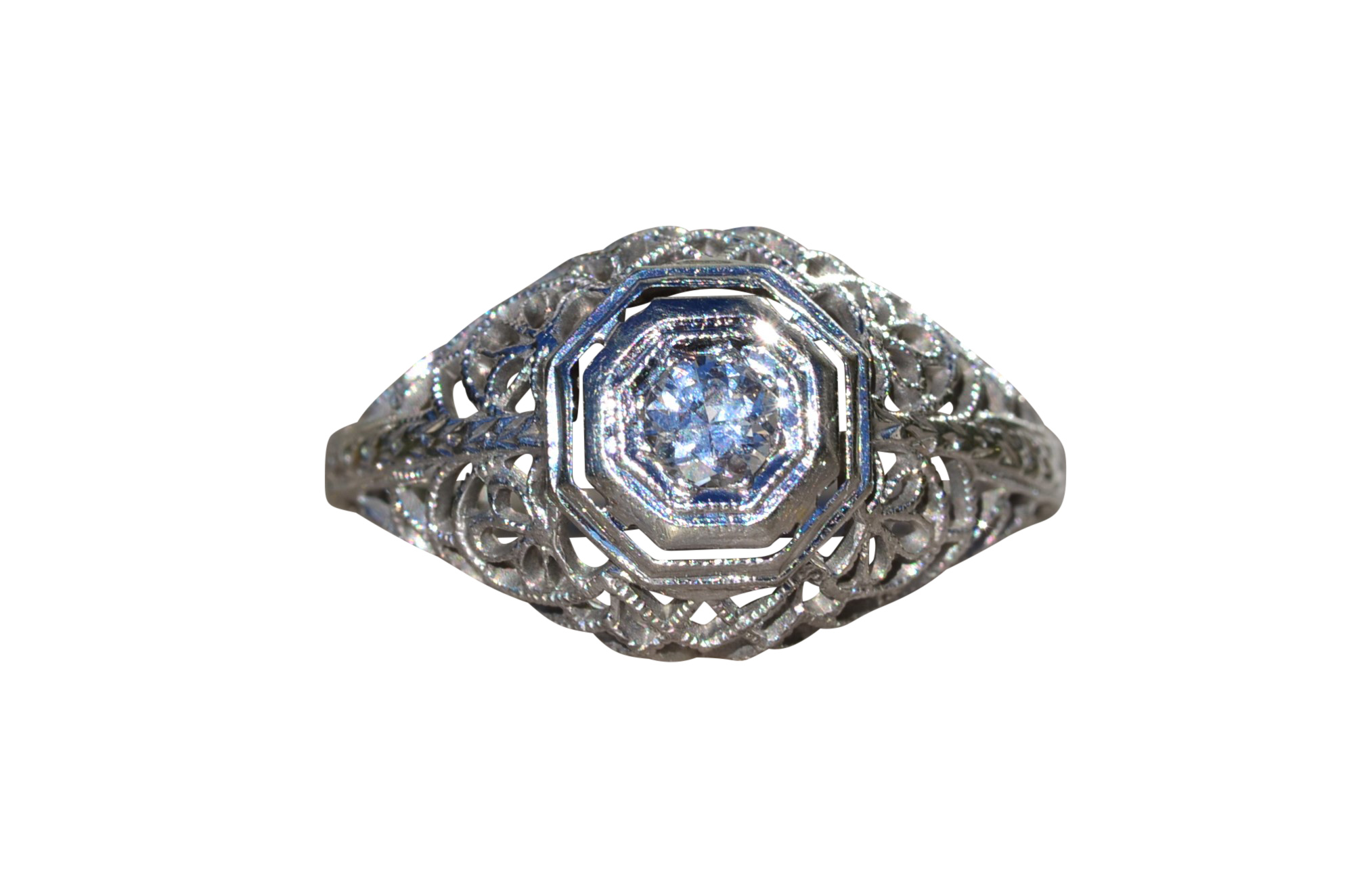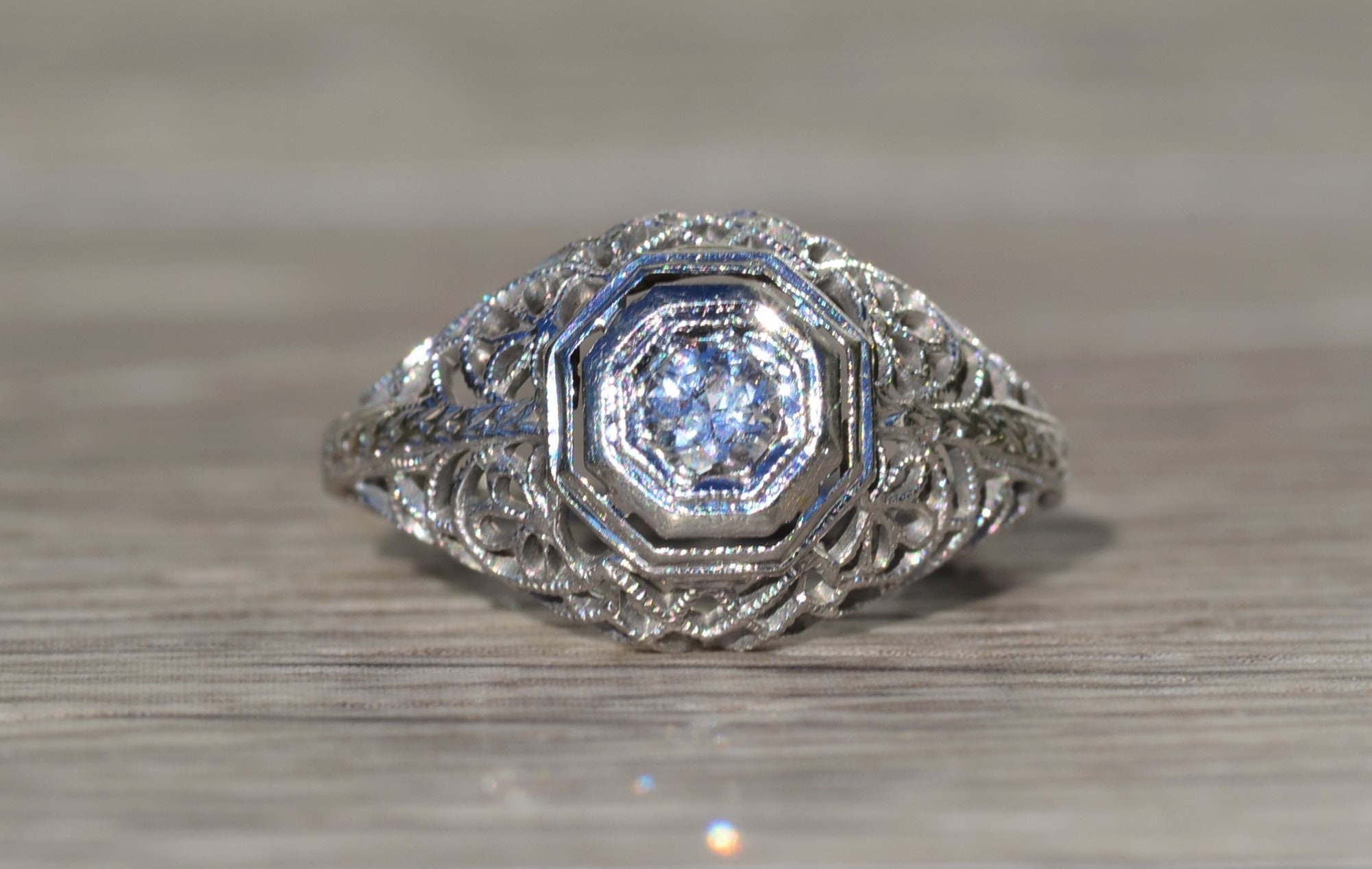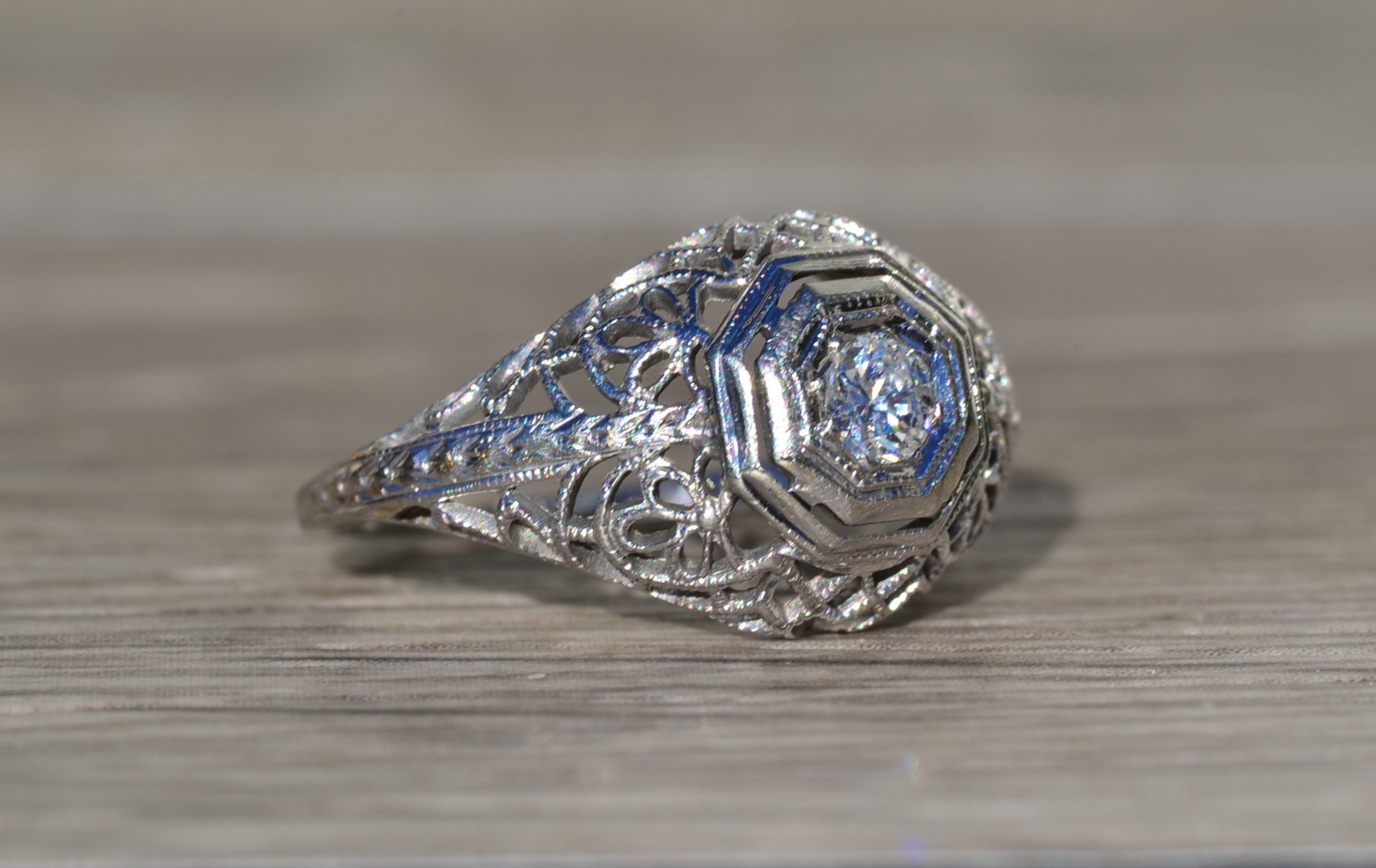Ladies Antique Engagement Ring in 14K Gold set with 0.15 CT Diamond. Crafted in 14 karat white gold, this Deco antique ring features a 0.15 carat center diamond. The diamond has an approximate Gemological Institute of America clarity grade of SI1 and a color grade of G. Surrounding the center is intricate filigree and fine milgrain adding immense, handcrafted detail to the piece. Currently a finger size 4, this ring can be resized for an additional charge.