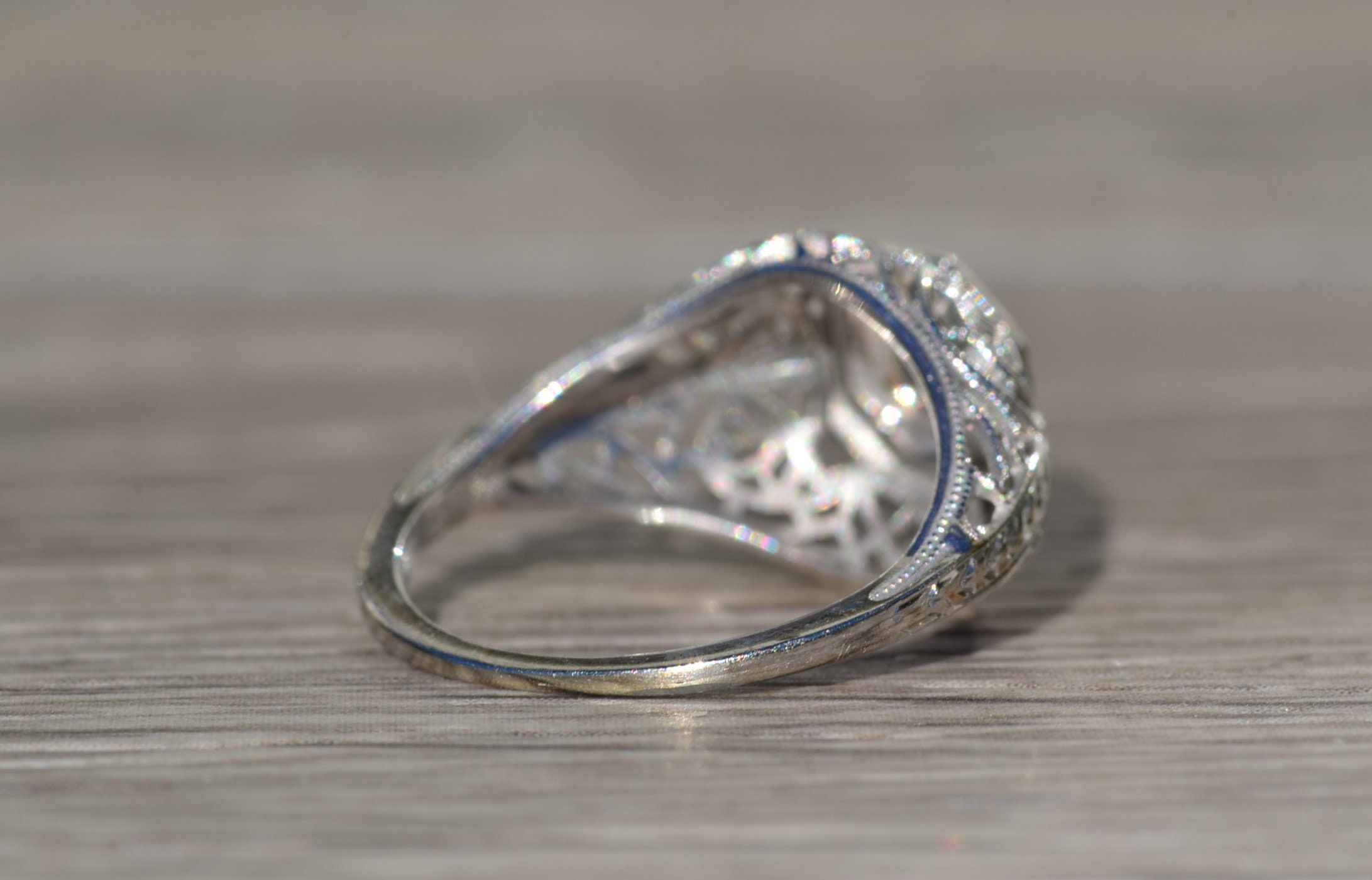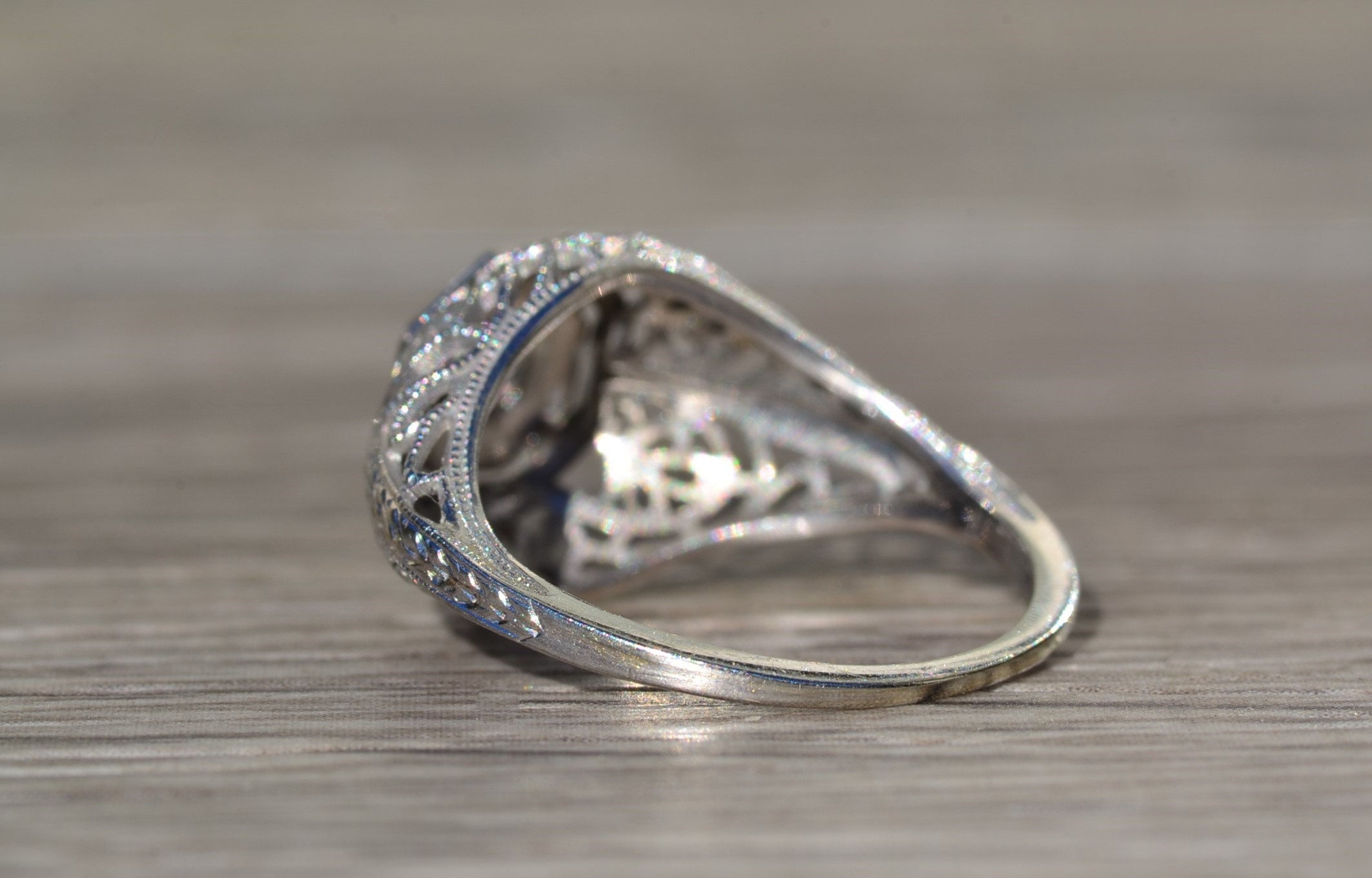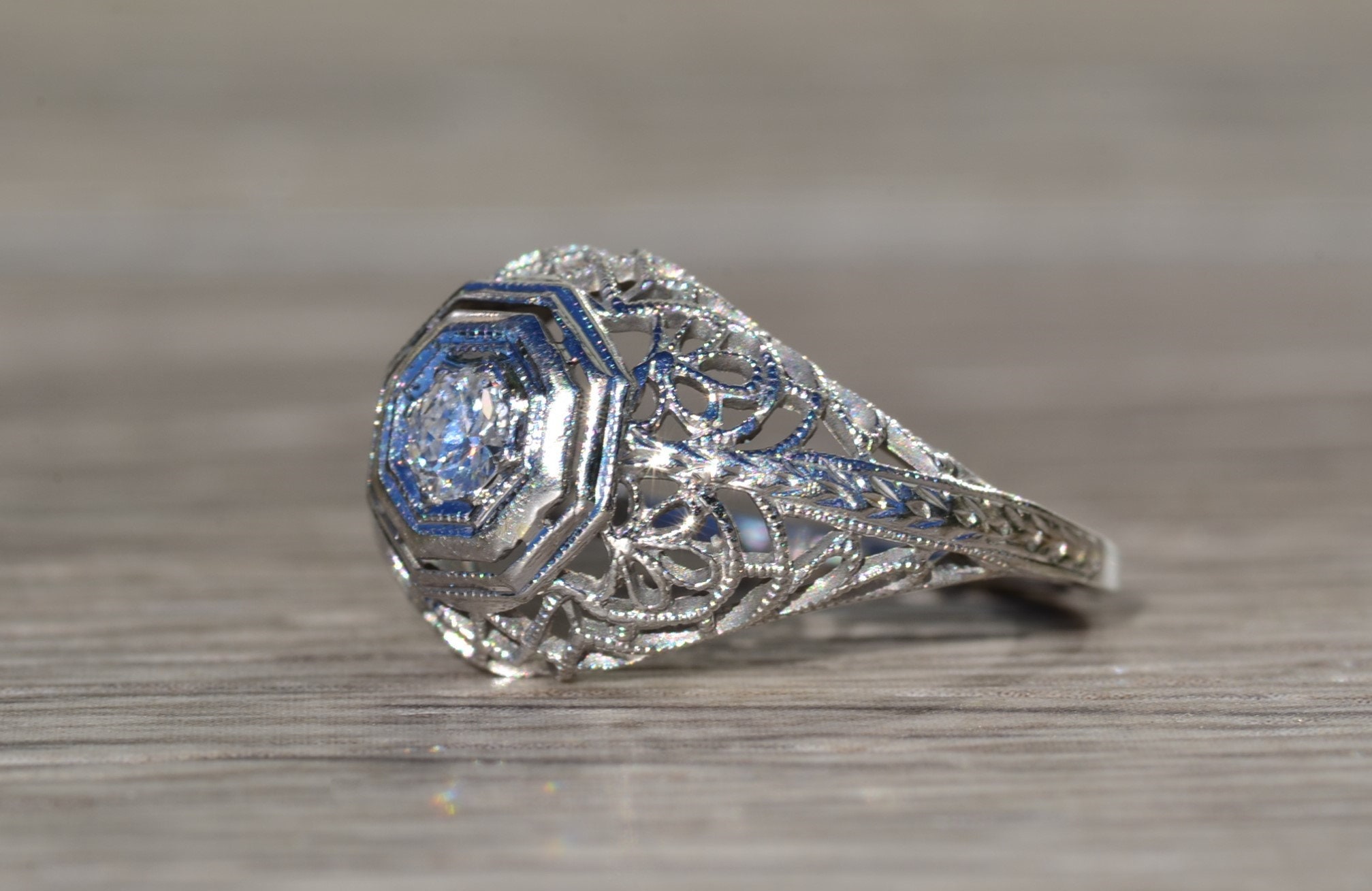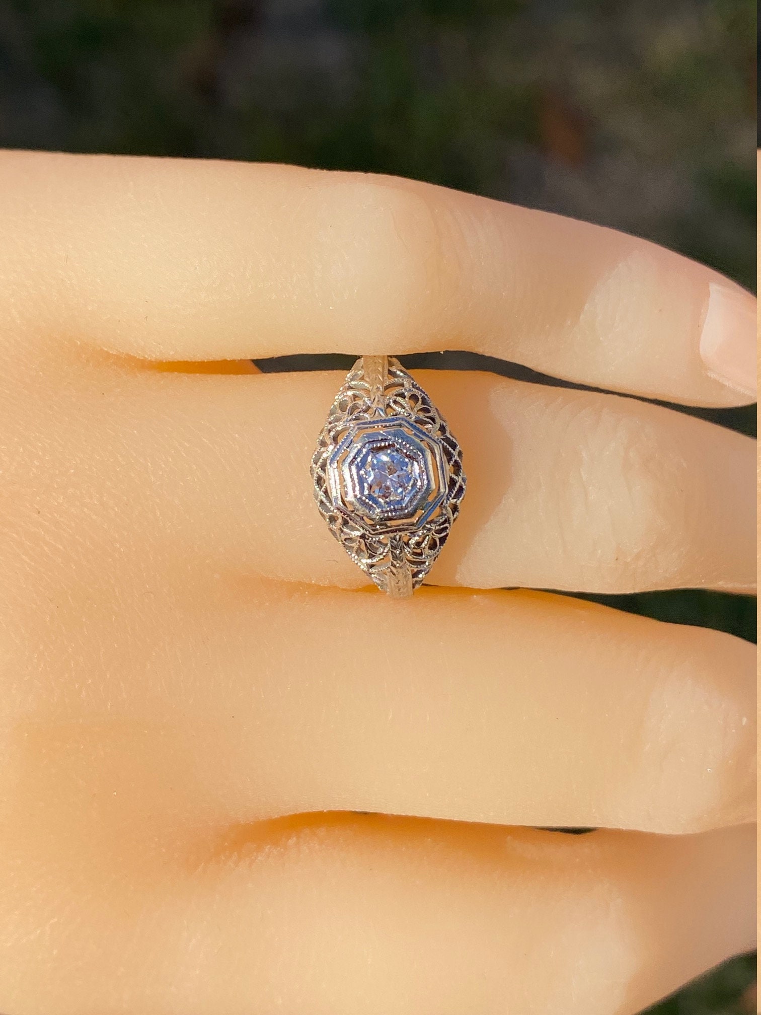 Ladies Antique Engagement Ring in 14K Gold set with 0.15 CT Diamond. Crafted in 14 karat white gold, this Deco antique ring features a 0.15 carat center diamond. The diamond has an approximate Gemological Institute of America clarity grade of SI1 and a color grade of G. Surrounding the center is intricate filigree and fine milgrain adding immense, handcrafted detail to the piece. Currently a finger size 4, this ring can be resized for an additional charge.