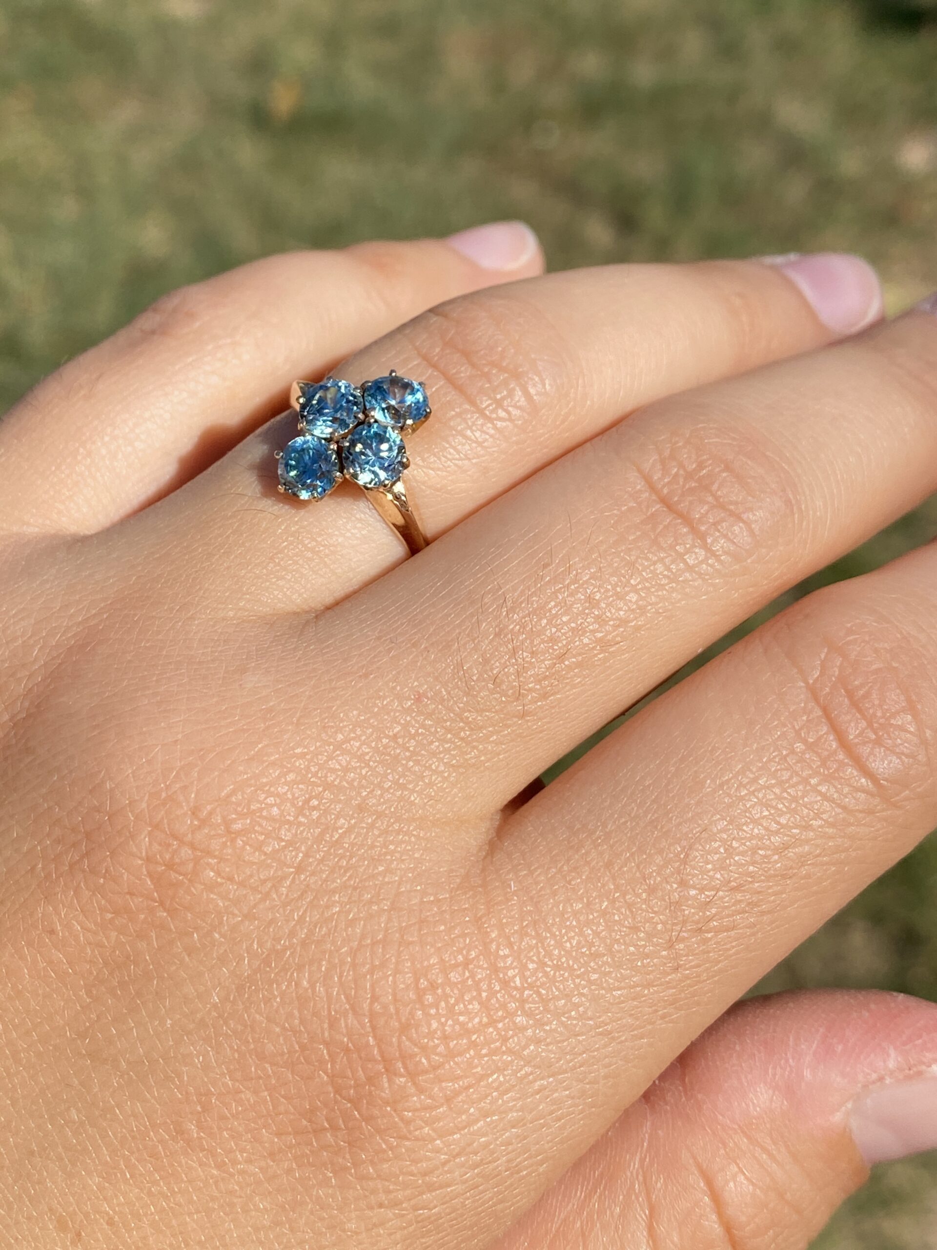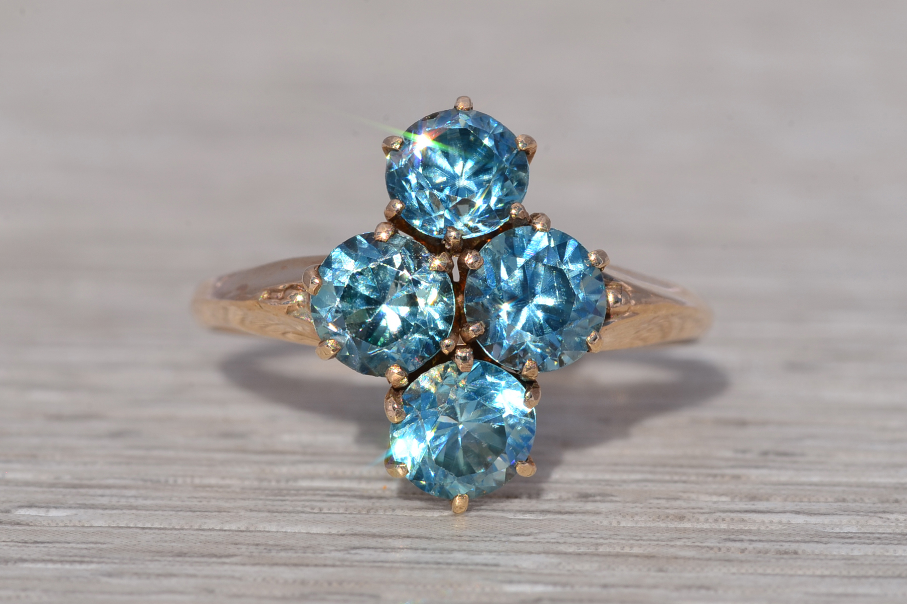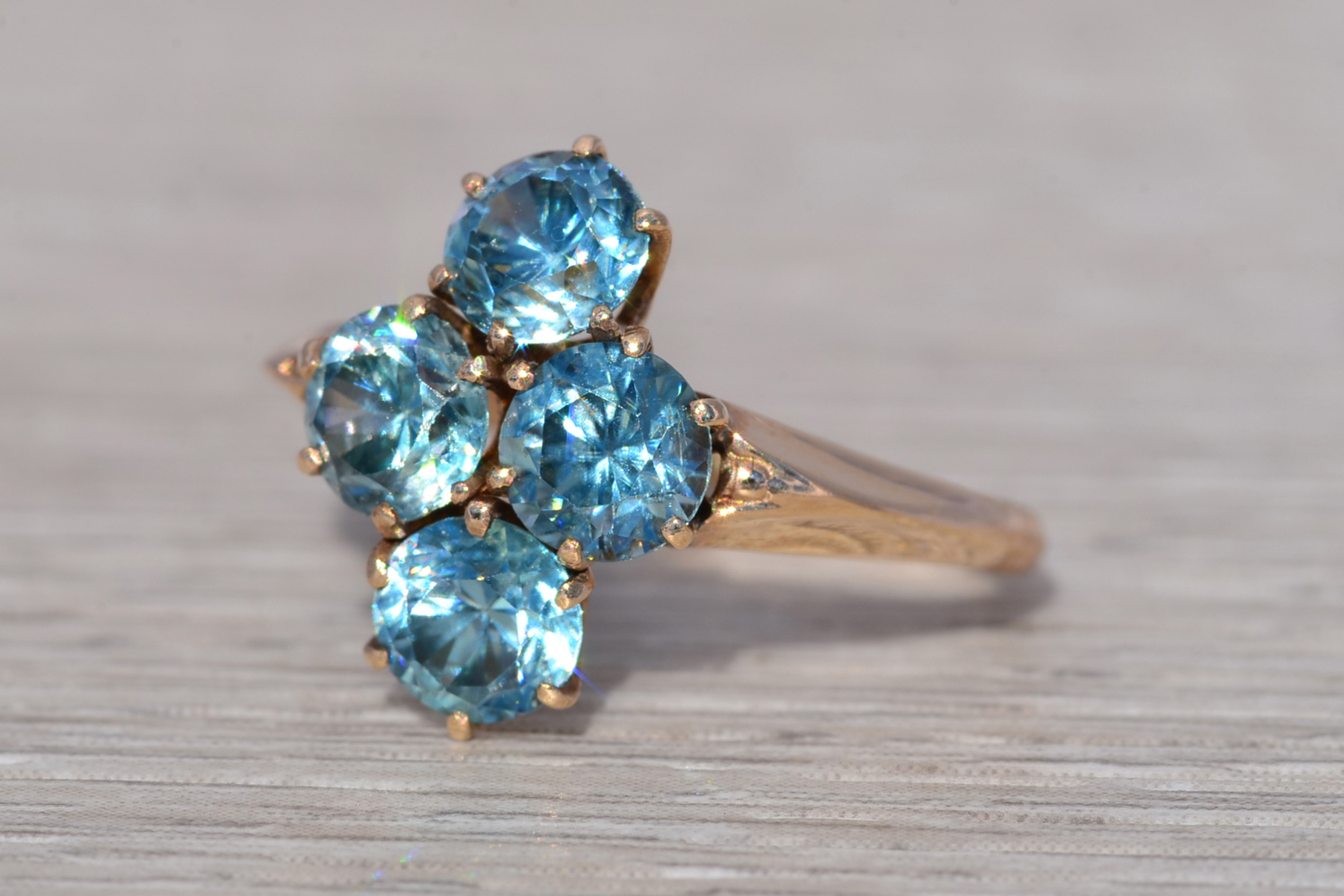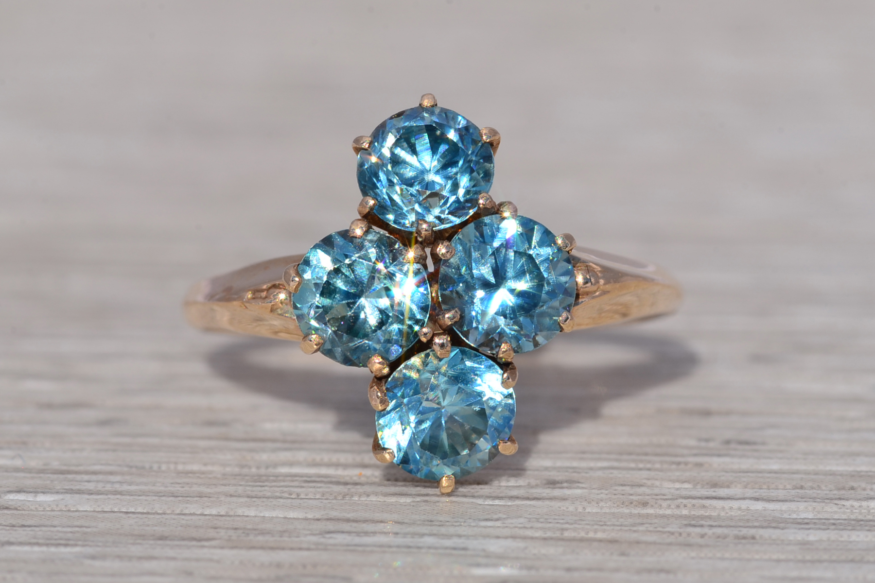 This stunning piece, known as The Azure Quartet, features four round natural blue zircons arranged in a striking clover formation at the center. Each stone displays vibrant ocean-blue brilliance with exceptional fire, beautifully enhanced by the warm yellow gold prong setting. The elevated cluster design creates impressive presence while maintaining balance and wearability. The ring is crafted in yellow gold and is currently a finger size 5.75 yet can be adjusted to any finger size for an additional charge upon request, ensuring a perfect fit.