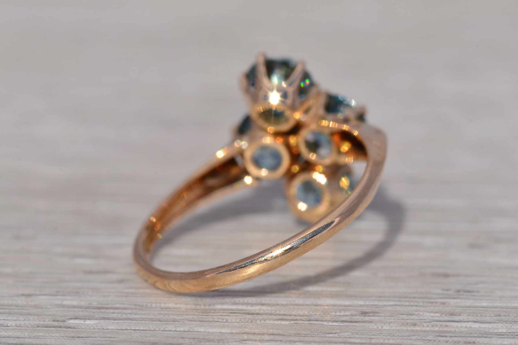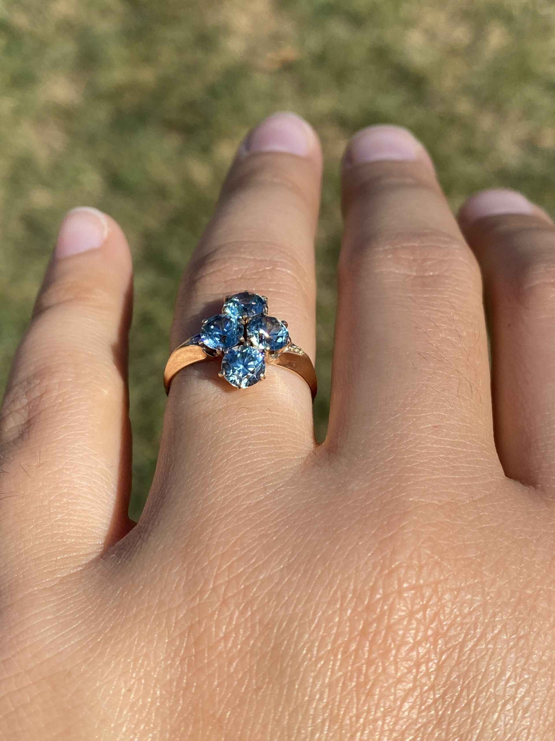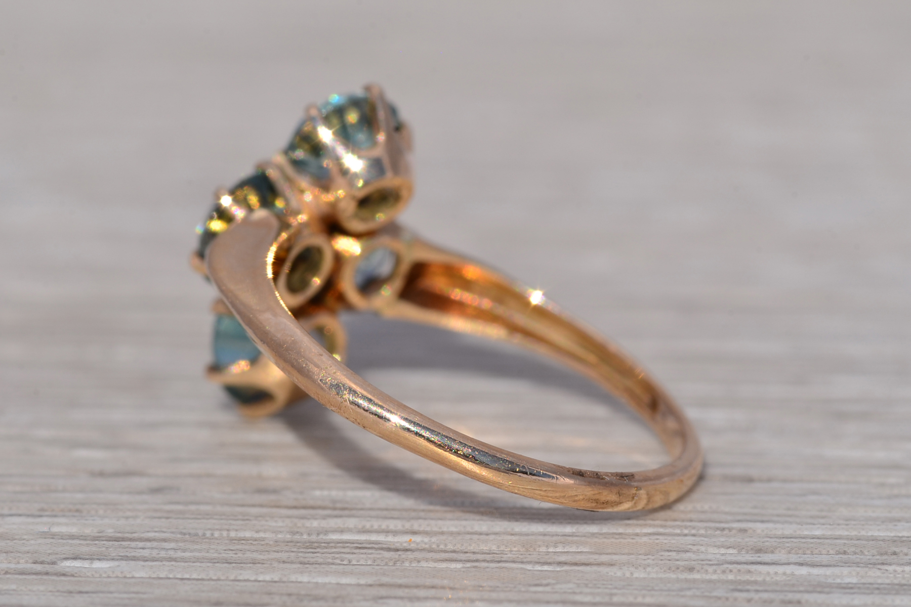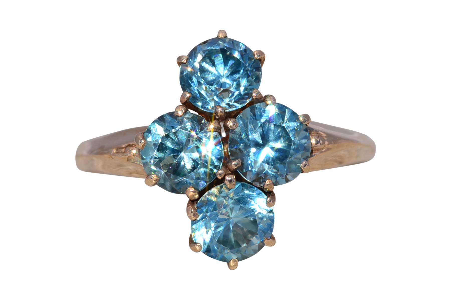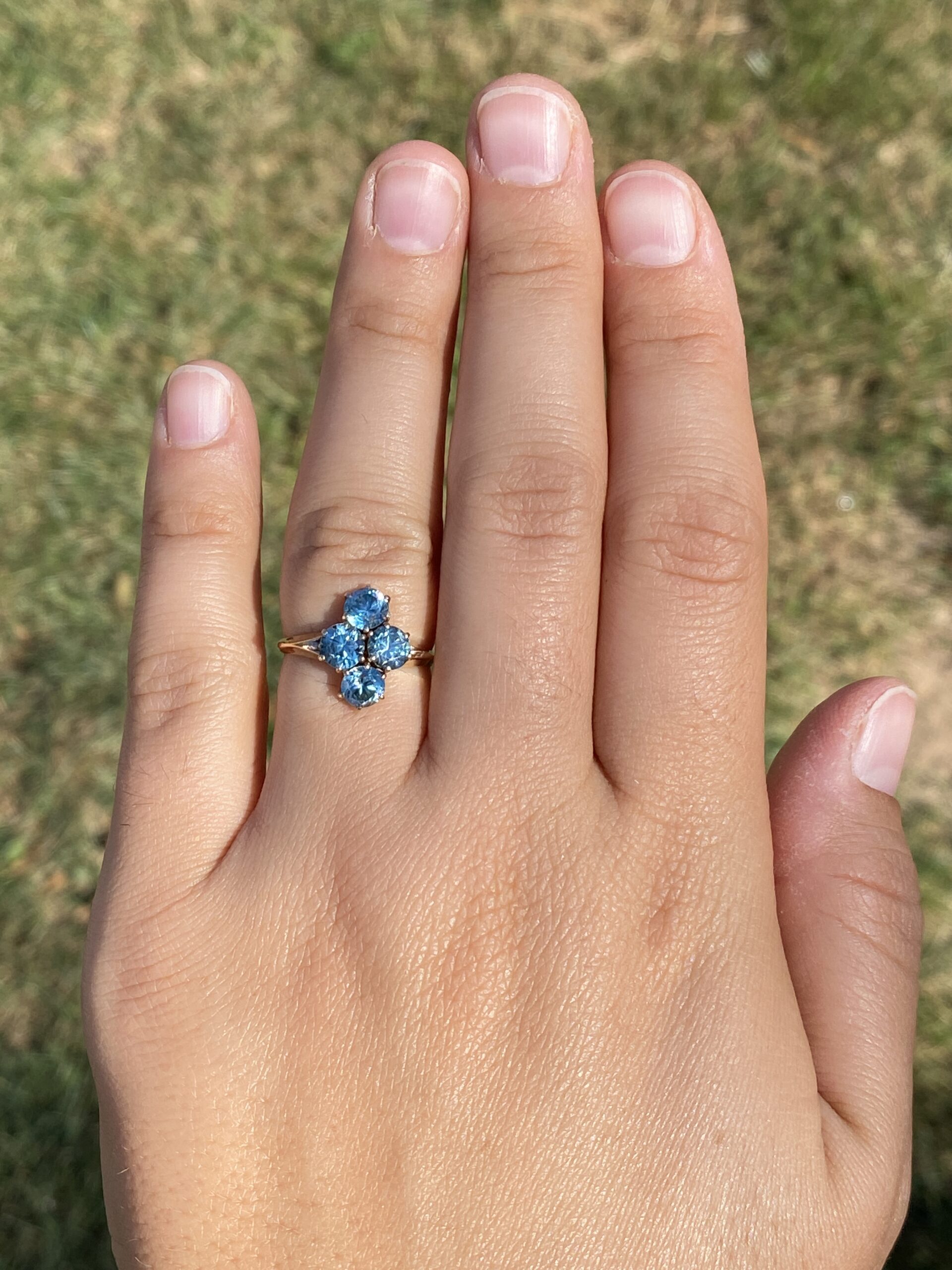 This stunning piece, known as The Azure Quartet, features four round natural blue zircons arranged in a striking clover formation at the center. Each stone displays vibrant ocean-blue brilliance with exceptional fire, beautifully enhanced by the warm yellow gold prong setting. The elevated cluster design creates impressive presence while maintaining balance and wearability. The ring is crafted in yellow gold and is currently a finger size 5.75 yet can be adjusted to any finger size for an additional charge upon request, ensuring a perfect fit.