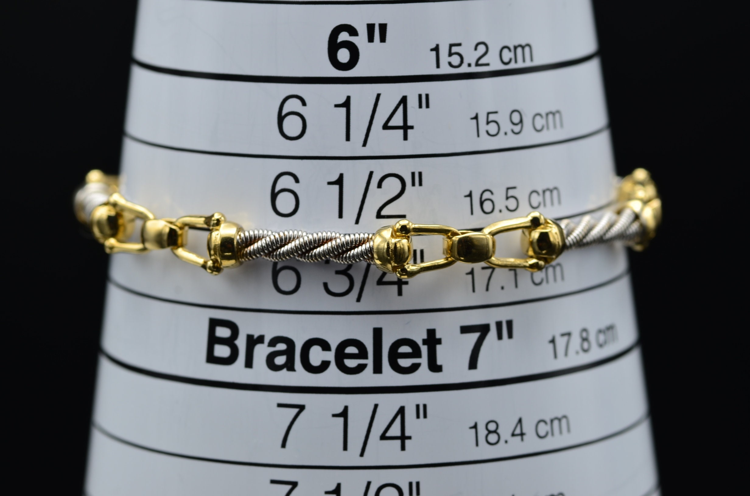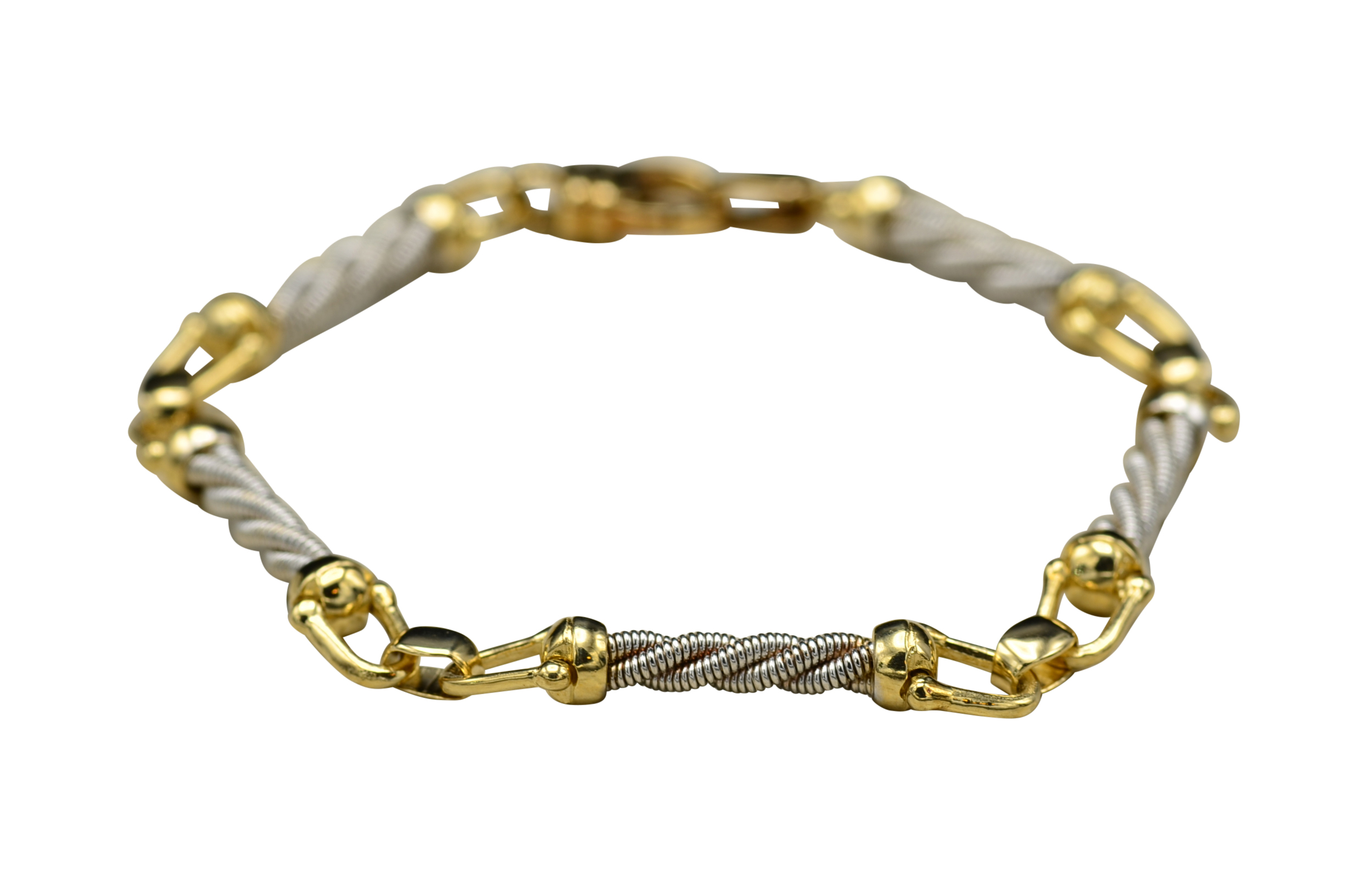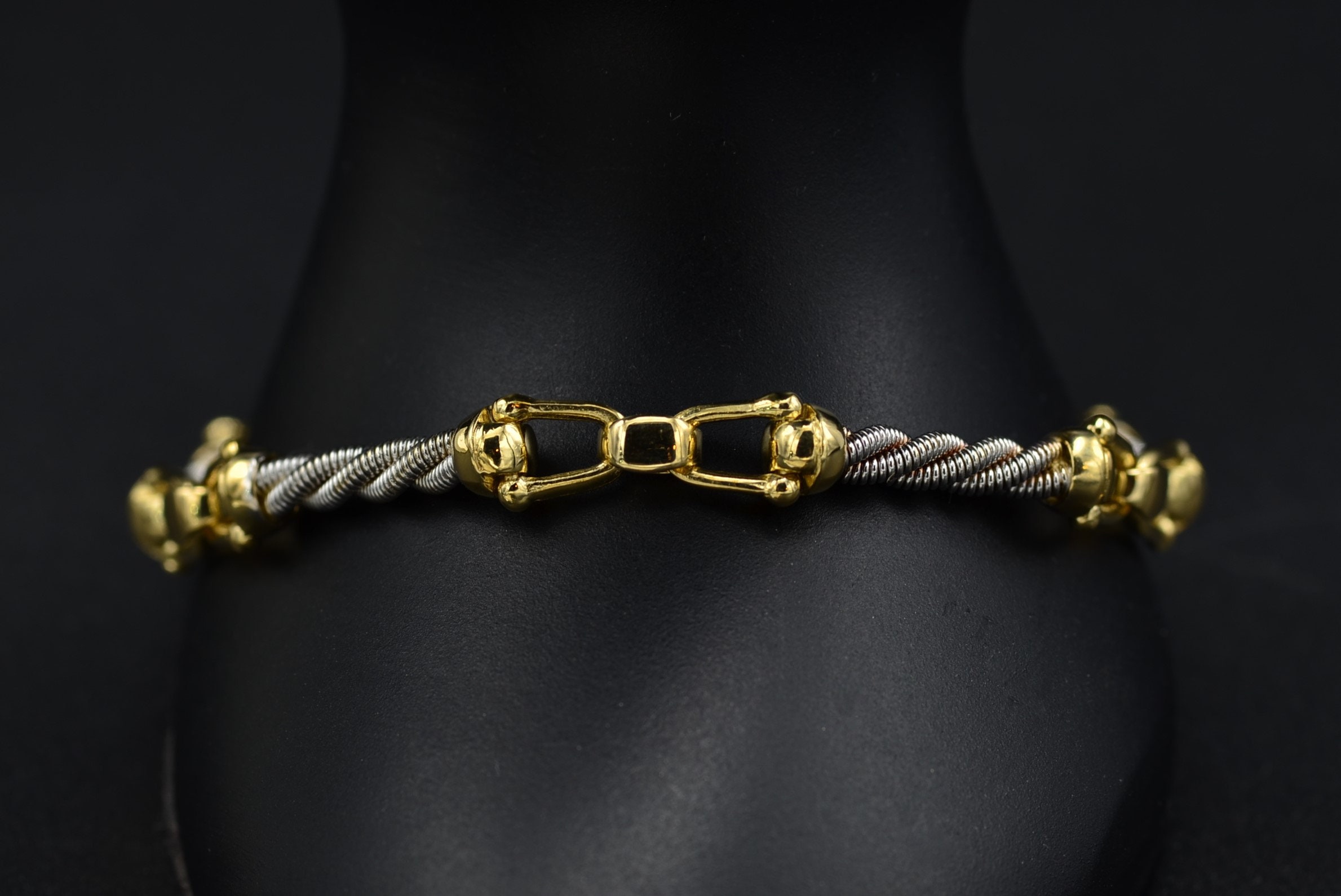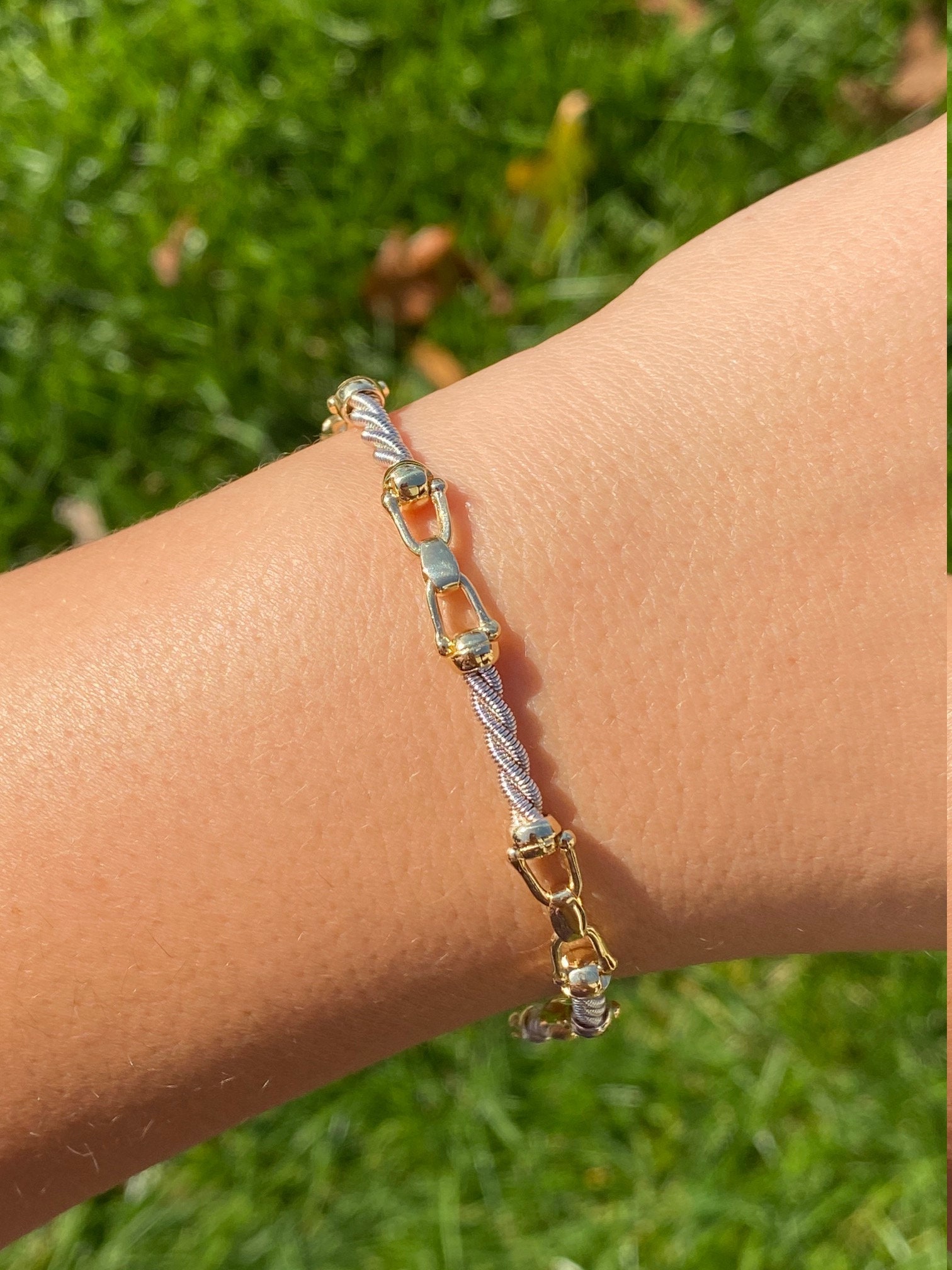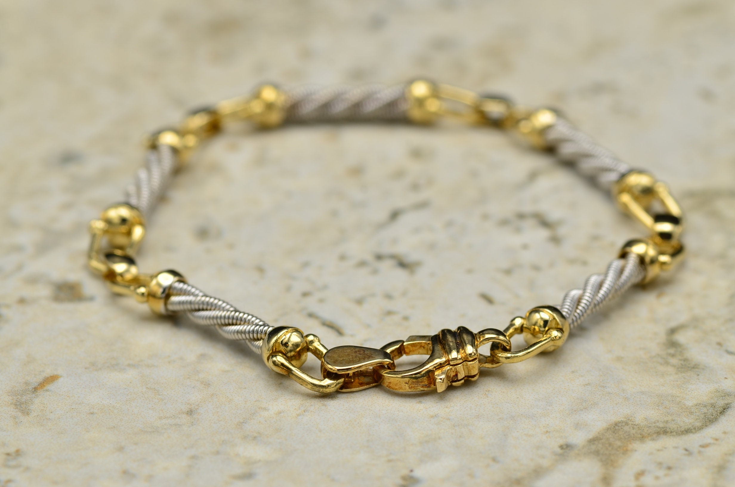 Ladies 14K Two Tone Specialty Link Bracelet. This vintage ladies bracelet measures 6.75 inches in length and features yellow gold and white gold links. A large lobster style clasp provides a secure closure on this bracelet while adding to the bold style. Twisted white gold sections give this bracelet a modern feel without being too heavy.