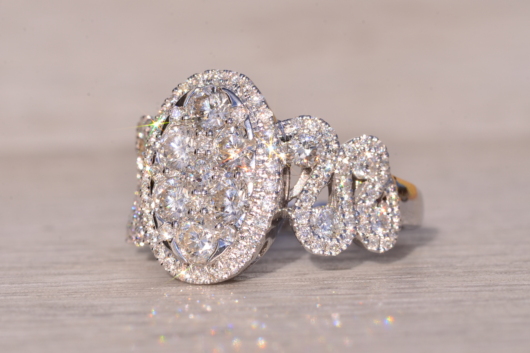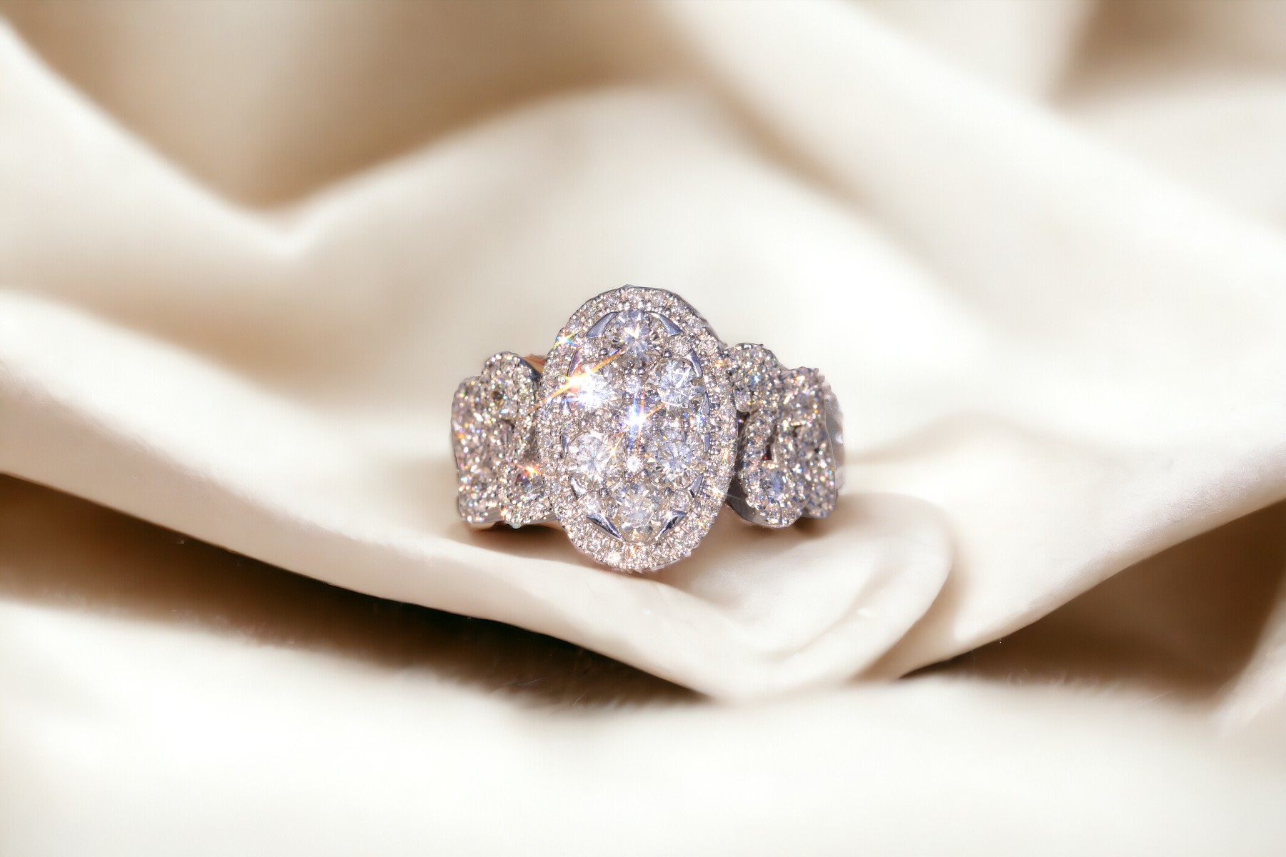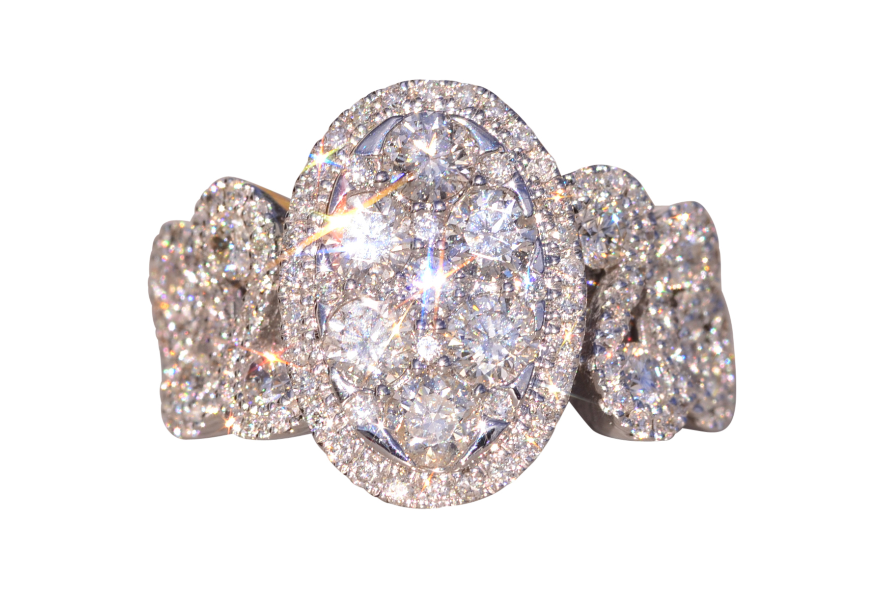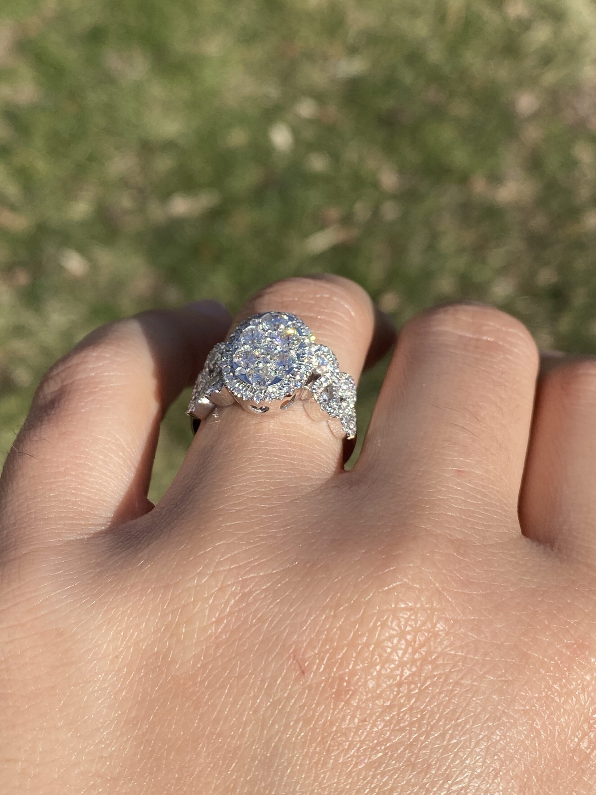The Beenie: Cluster Top Natural Diamond Ring in White Gold. Elevate your style with this exquisite ring, adorned with a captivating cluster of round brilliant-cut natural diamonds arranged in an oval shape at the center. Encircling this stunning cluster is a delicate halo of additional round brilliant-cut diamonds, enhancing the ring’s brilliance and radiance. Crafted with meticulous attention to detail, the shank of the ring features an intricately woven design, adorned with diamonds that complement the center arrangement beautifully. Adding to its allure, larger diamonds are meticulously placed at the crest of each weave, accentuating the ring’s elegance and sophistication. With a total diamond weight of 1.62 carats, this ring exudes luxury and glamour at every turn. Below the diamonds, intricate filigree work adds a touch of refinement and elegance, completing the ring’s exquisite design. Fashioned from 14 karat white gold, this ring boasts both durability and timeless elegance. Currently sized at 7, it can be resized to fit any finger size for an additional fee, ensuring a perfect fit for its wearer.