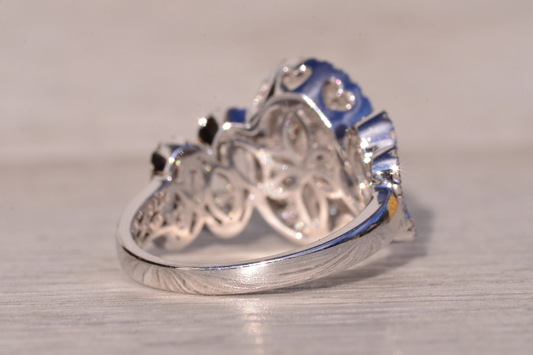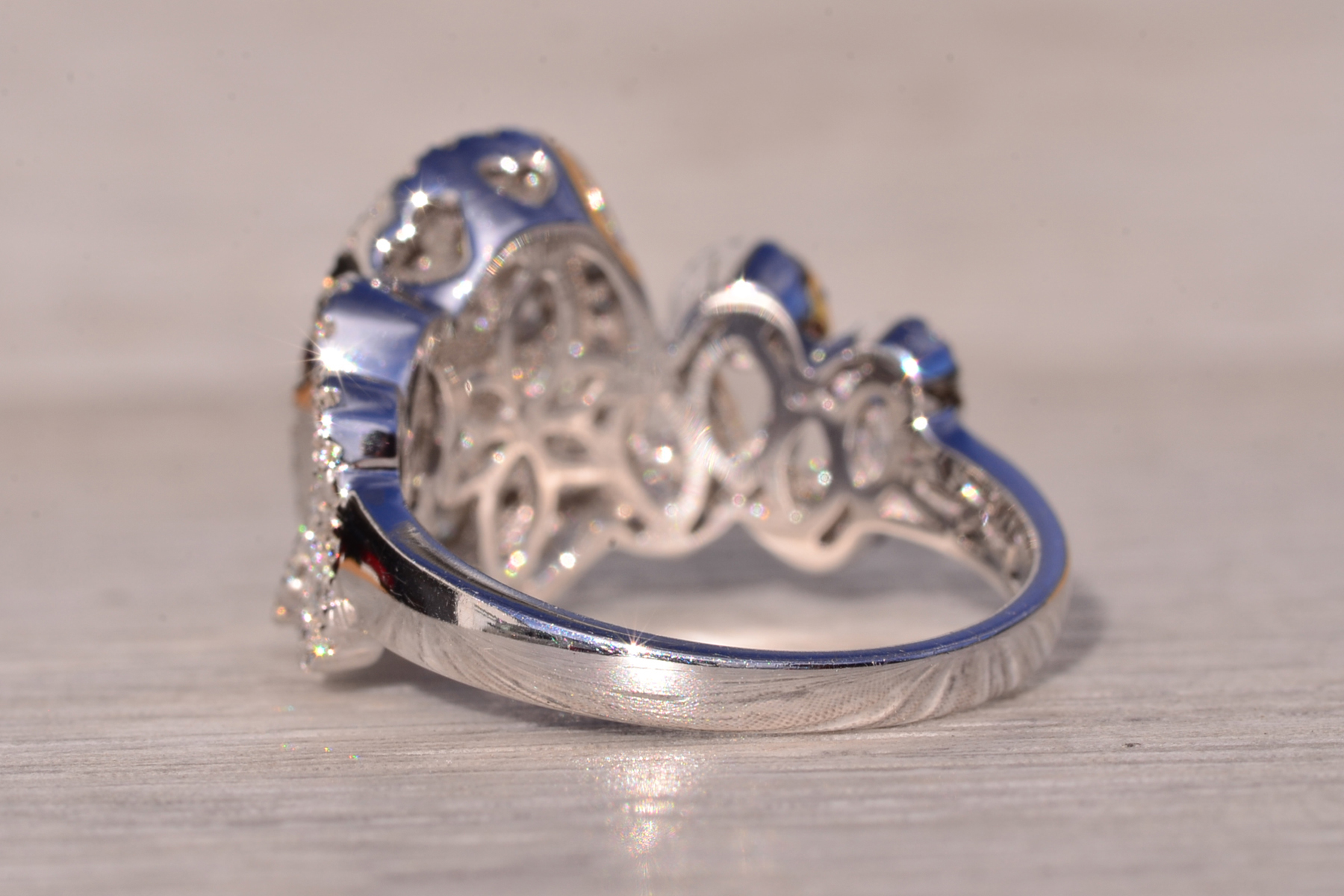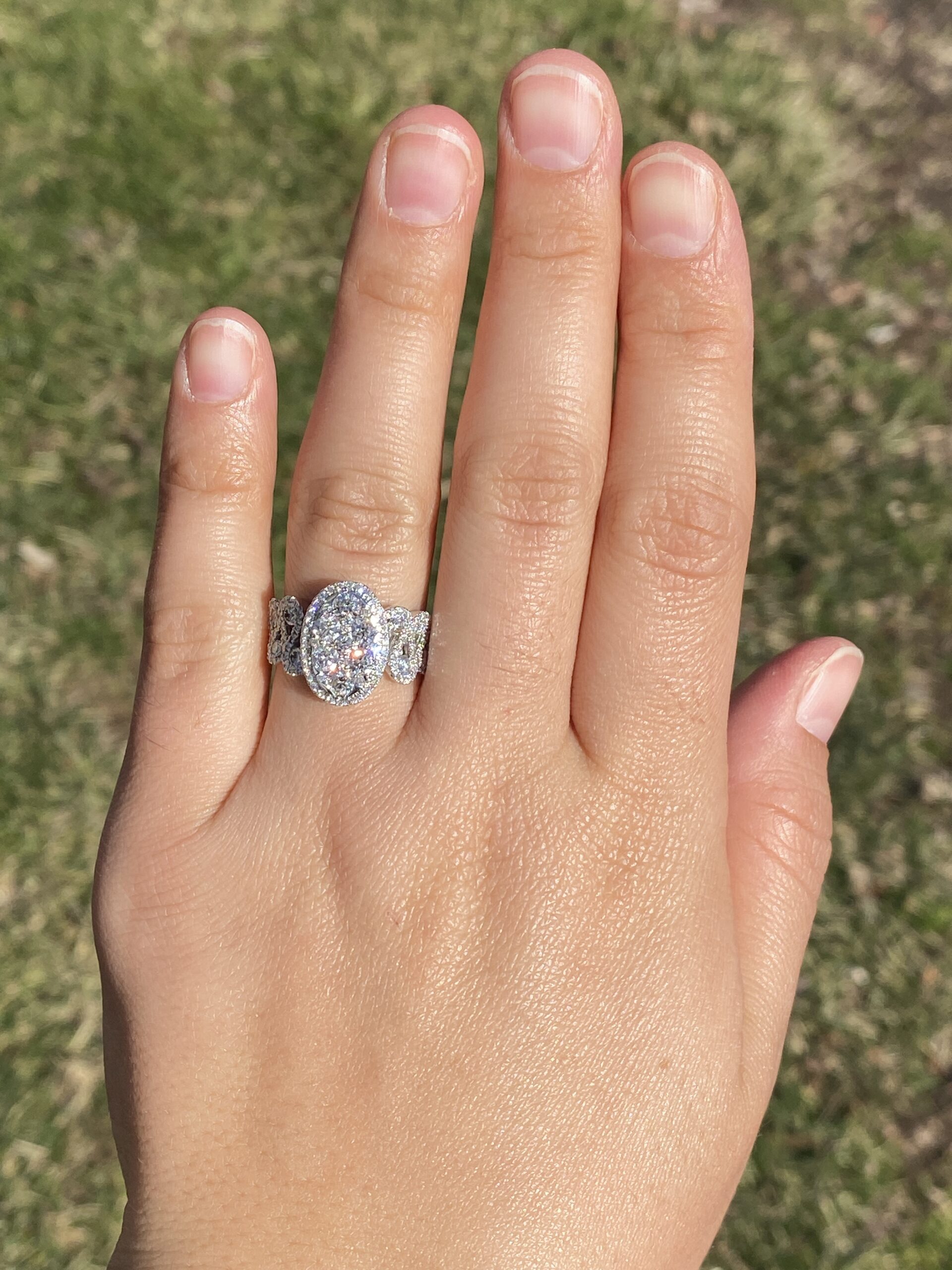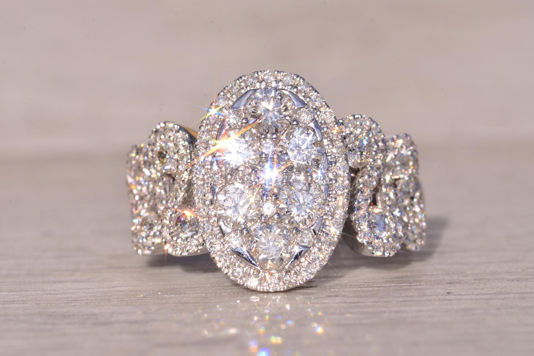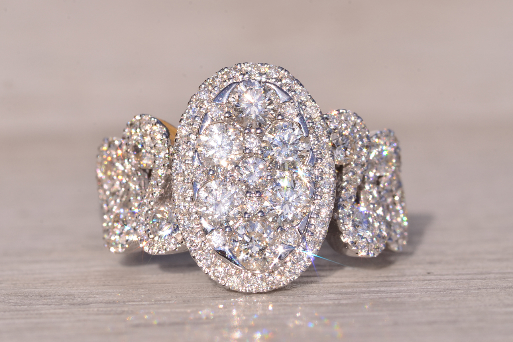 The Beenie: Cluster Top Natural Diamond Ring in White Gold. Elevate your style with this exquisite ring, adorned with a captivating cluster of round brilliant-cut natural diamonds arranged in an oval shape at the center. Encircling this stunning cluster is a delicate halo of additional round brilliant-cut diamonds, enhancing the ring’s brilliance and radiance. Crafted with meticulous attention to detail, the shank of the ring features an intricately woven design, adorned with diamonds that complement the center arrangement beautifully. Adding to its allure, larger diamonds are meticulously placed at the crest of each weave, accentuating the ring’s elegance and sophistication. With a total diamond weight of 1.62 carats, this ring exudes luxury and glamour at every turn. Below the diamonds, intricate filigree work adds a touch of refinement and elegance, completing the ring’s exquisite design. Fashioned from 14 karat white gold, this ring boasts both durability and timeless elegance. Currently sized at 7, it can be resized to fit any finger size for an additional fee, ensuring a perfect fit for its wearer.