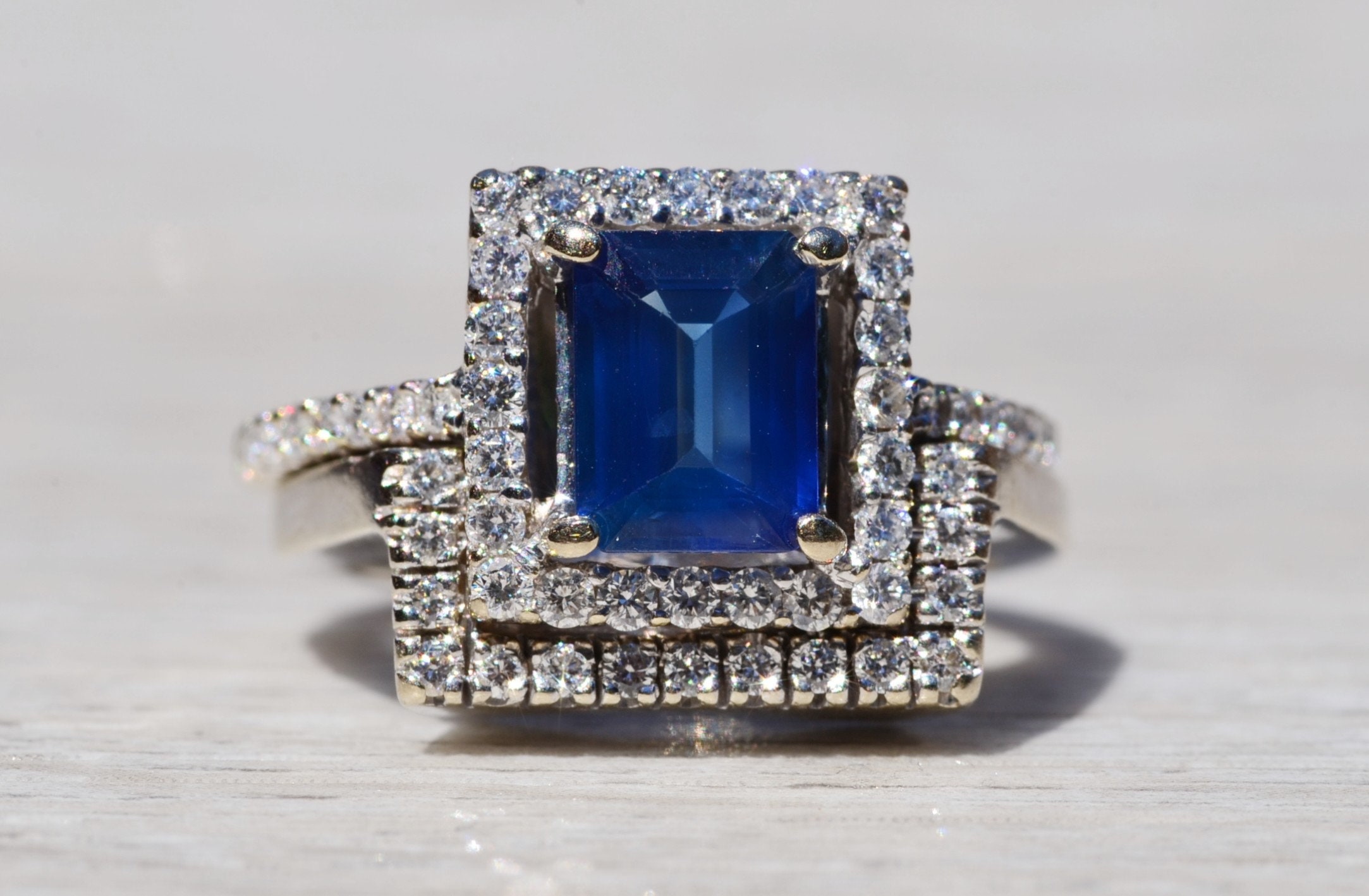 SKU: 18002605 Categories: All Antique & Vintage Engagement Rings, All Antiquities & Vintage, Colored Stone Engagement Rings, Contemporary Jewelry, Engagement Rings, New & Bespoke, New & Bespoke Engagement Rings, Simplistic Jewelry Tags: 14 karat, Band, blue, bridal set, custom band, custom fit band, diffused, diffused sapphire, emerald cut, engagement ring, Ladies, ring, sapphire, sapphire engagement, vintage, wedding band, wedding ring, wedding ring set, wedding set, White Gold