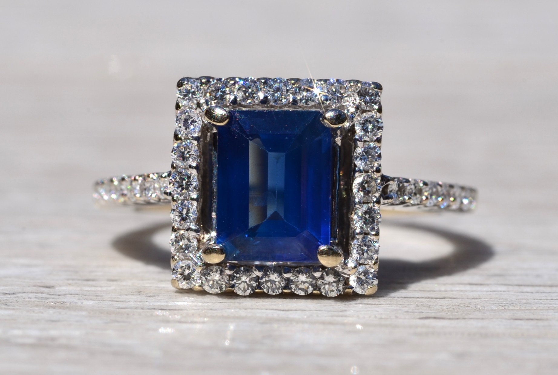 The Bell Mountain: Diffused Emerald Cut Blue Sapphire Engagement Ring and Wedding Set with Custom Band - Jewelry Memo