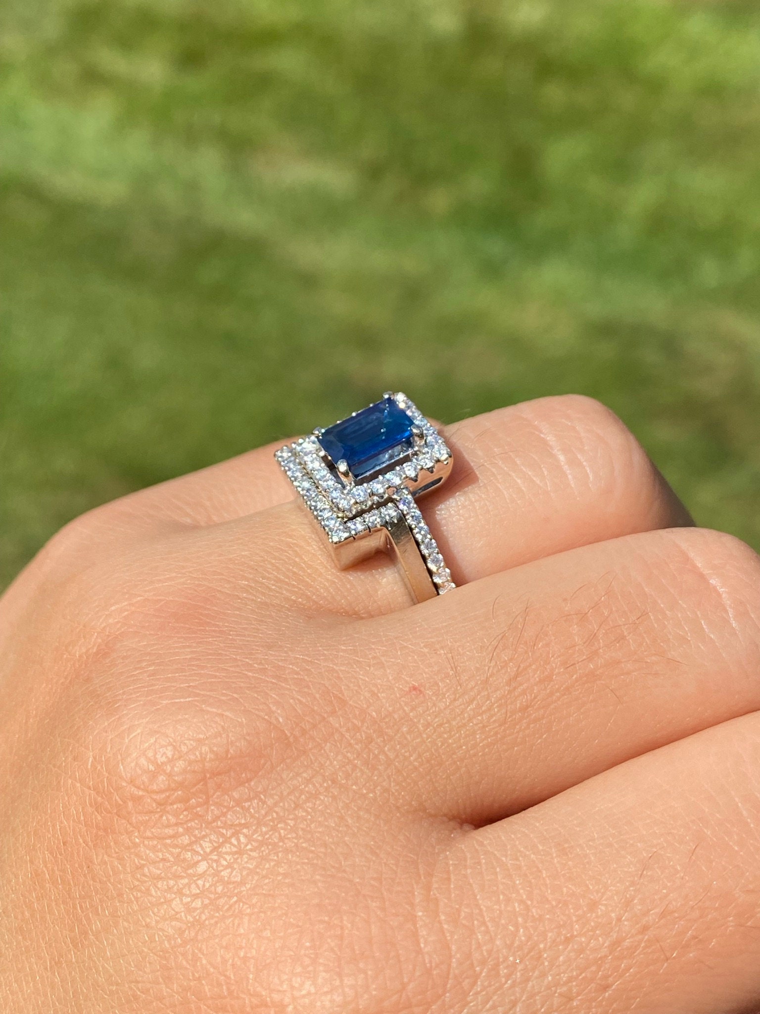The Bell Mountain: Diffused Emerald Cut Blue Sapphire Engagement Ring and Wedding Set with Custom Band. The engagement ring centers on a 1.60 carat emerald cut diffused blue sapphire with deep saturation. Surrounding the center is a halo of round brilliant cut diamonds. Diamonds continue down the shank of the engagement ring and are also present in the custom fitted white gold band. Both rings are crafted in 14 karat white gold and are currently a finger size 5 3/4 yet can be adjusted to any finger size for an additional charge on request. This wedding set has it all.