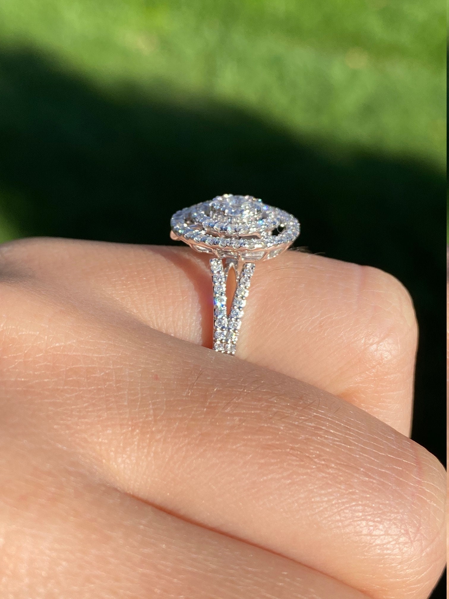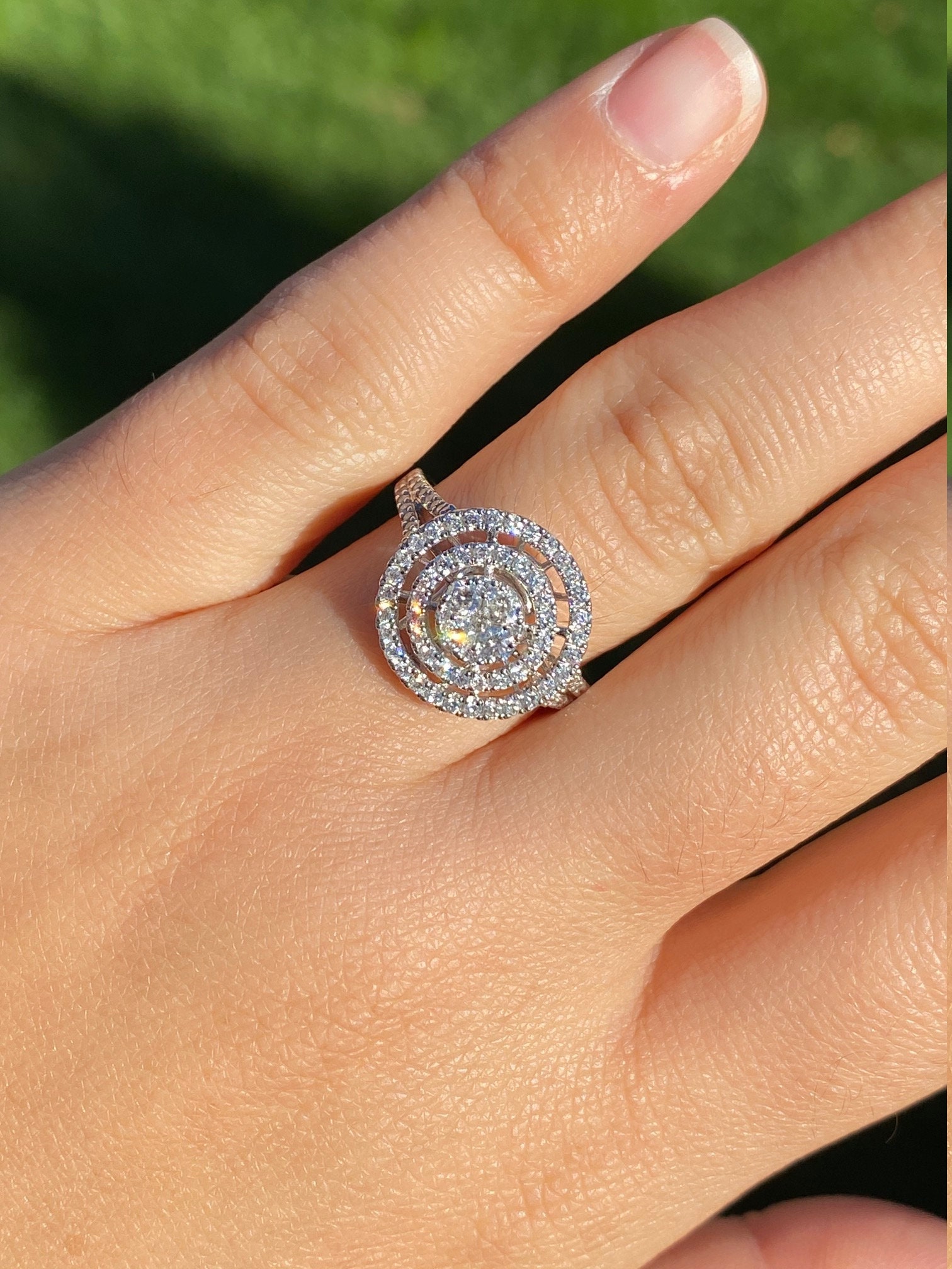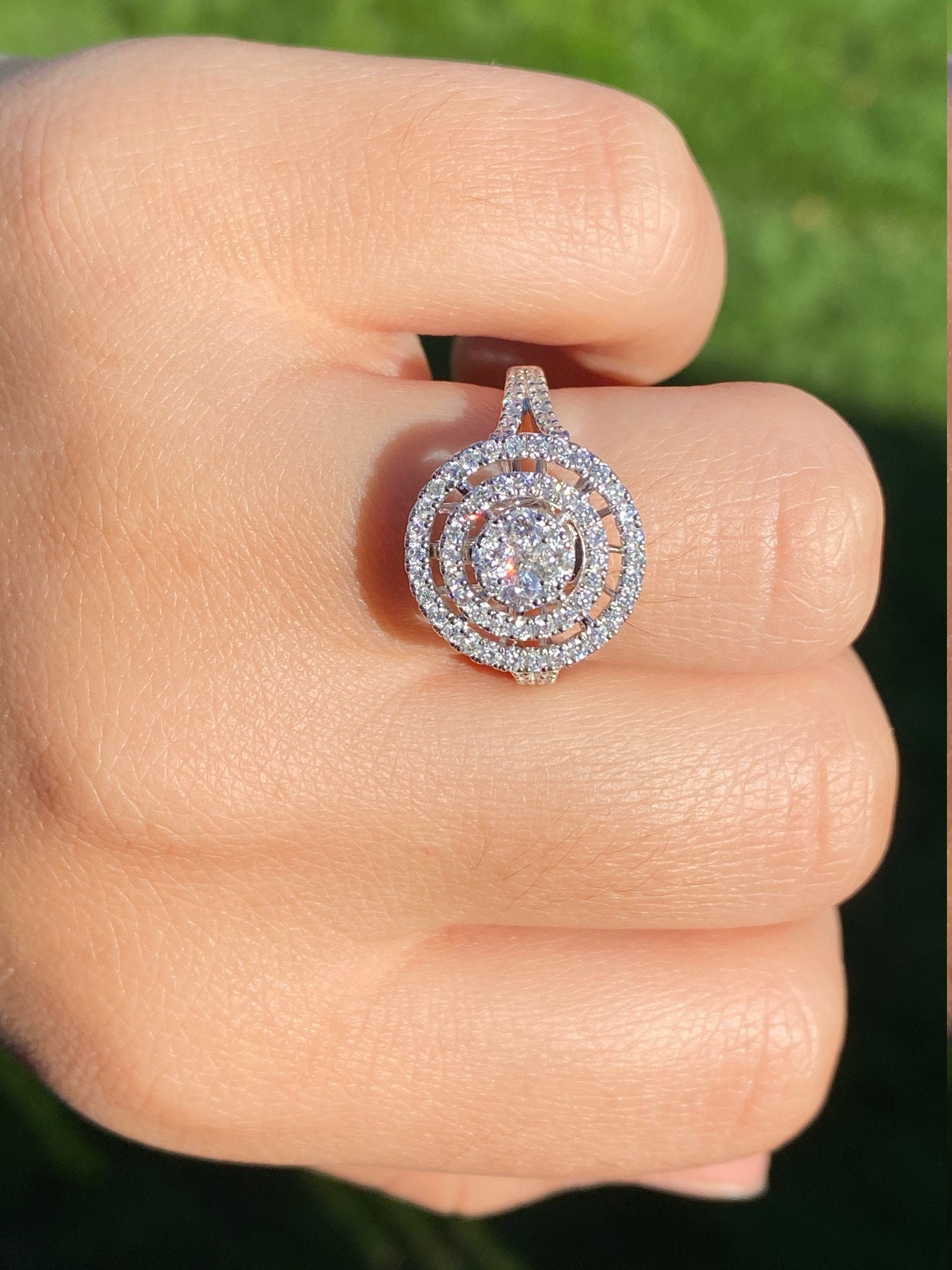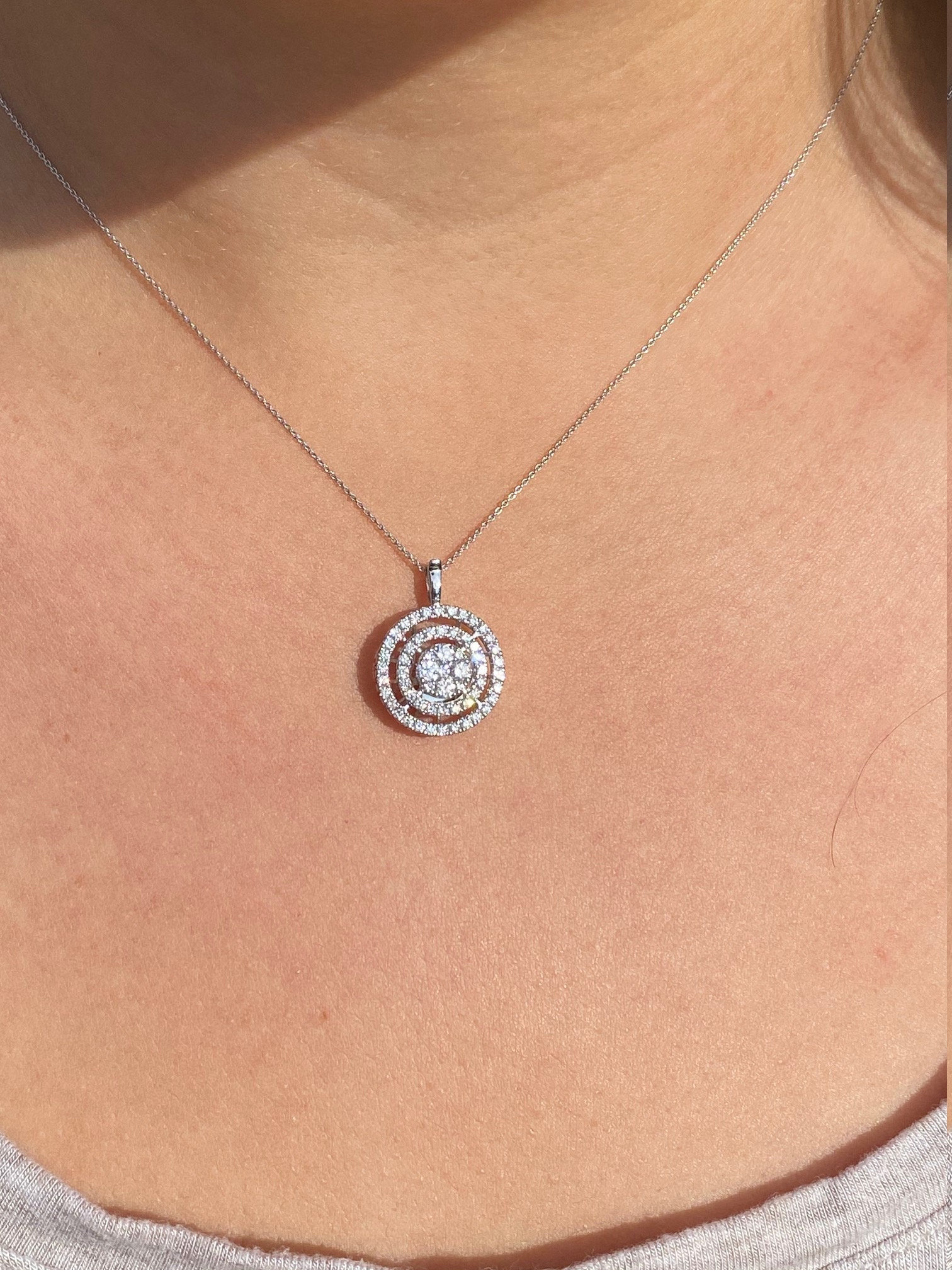 Contemporary Double Halo Diamond Ring and Pendant Conversion Piece. This unique ring is crafted in 14 karat white gold and features 1 carat of diamonds throughout the ring. The double halo setting can be worn as a ring (as shown) or removed and worn as a pendant. Place this pendant on a white gold chain and wear it as the perfect diamond necklace. The ring is a finger size 7 1/4, yet can be adjusted in size if needed.