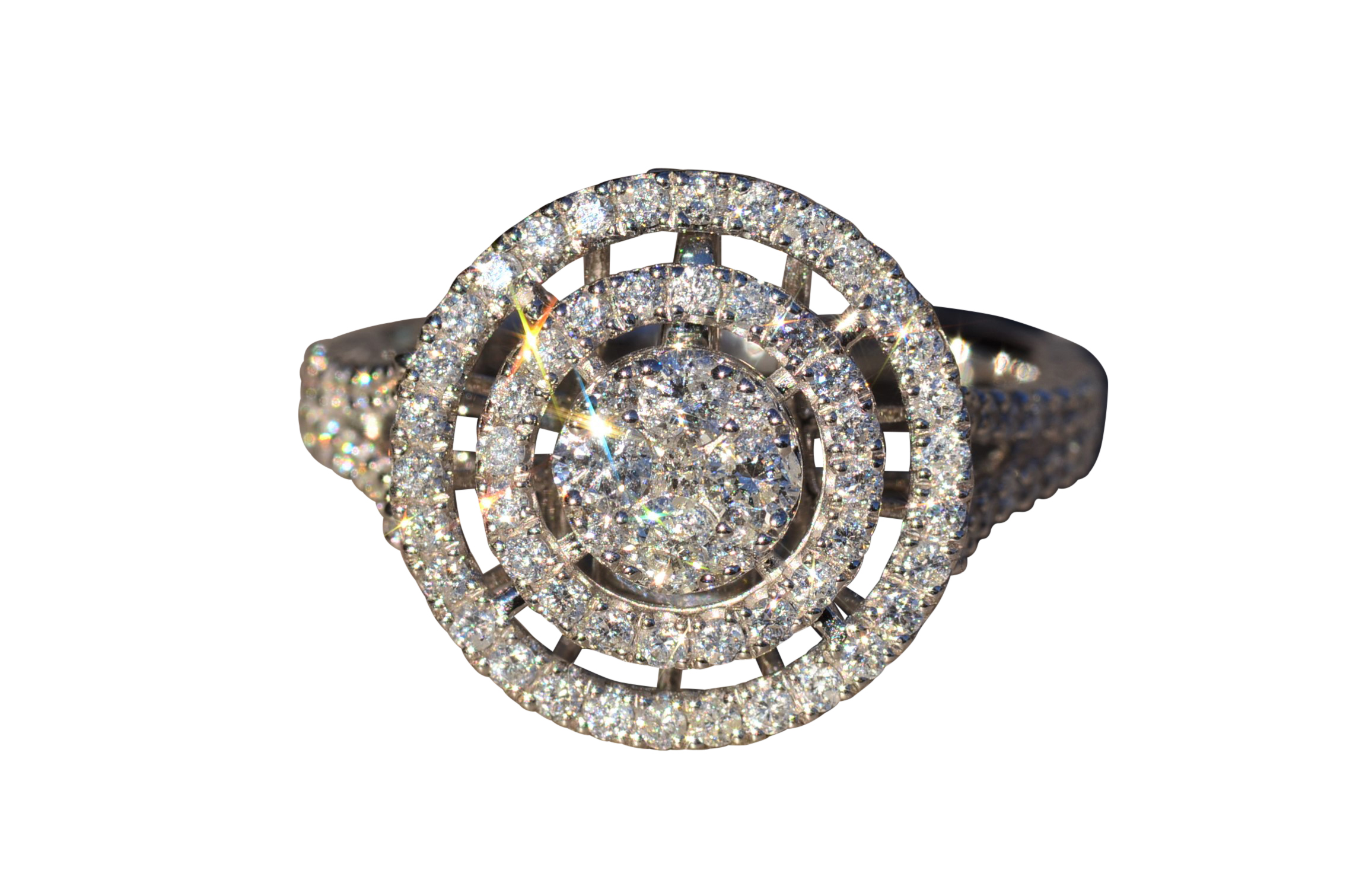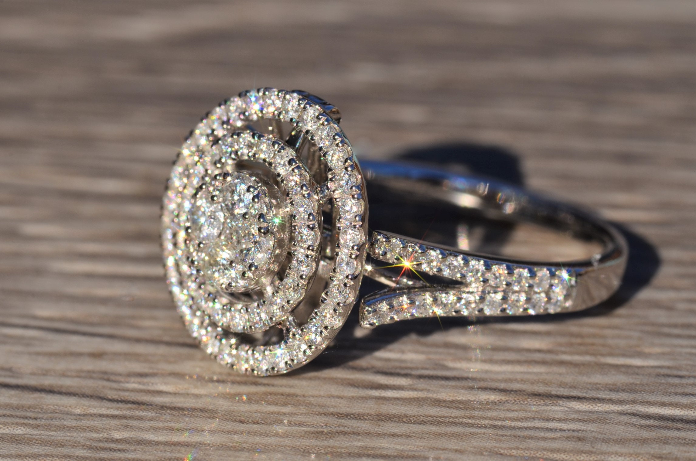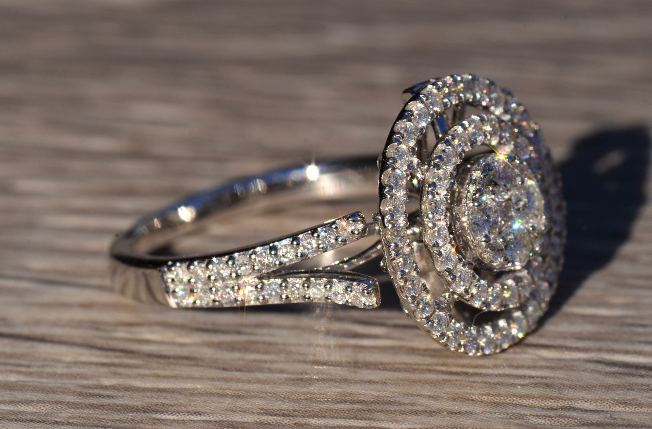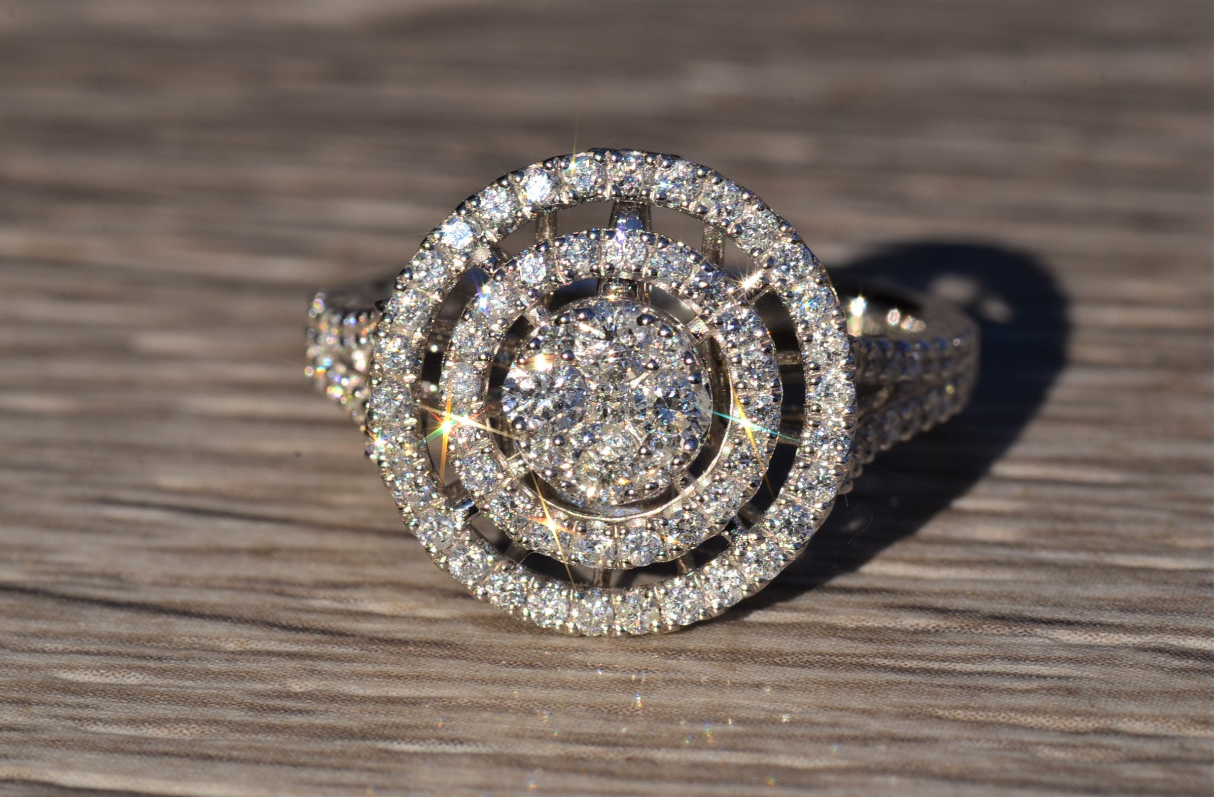 Contemporary Double Halo Diamond Ring and Pendant Conversion Piece. This unique ring is crafted in 14 karat white gold and features 1 carat of diamonds throughout the ring. The double halo setting can be worn as a ring (as shown) or removed and worn as a pendant. Place this pendant on a white gold chain and wear it as the perfect diamond necklace. The ring is a finger size 7 1/4, yet can be adjusted in size if needed.