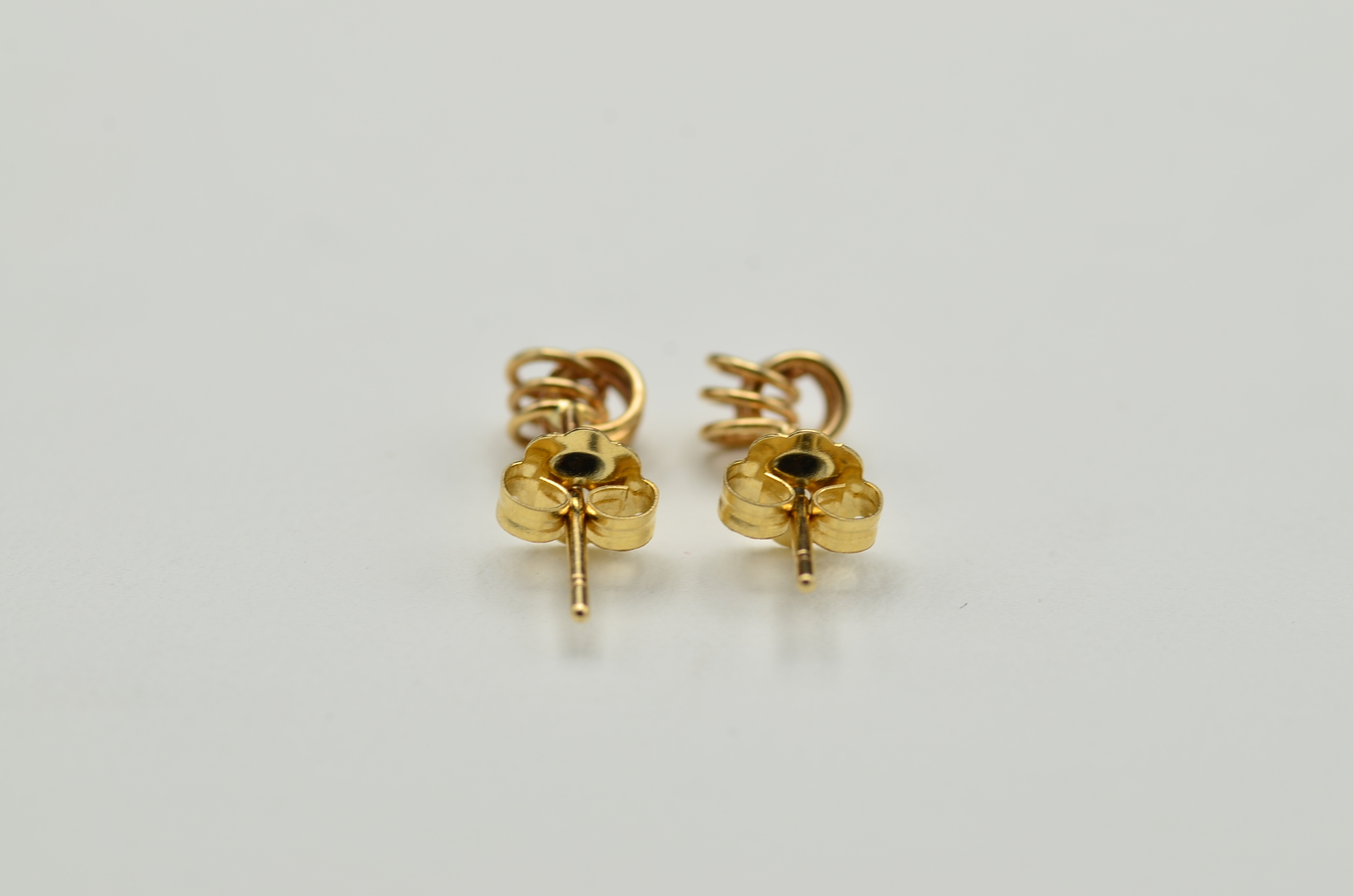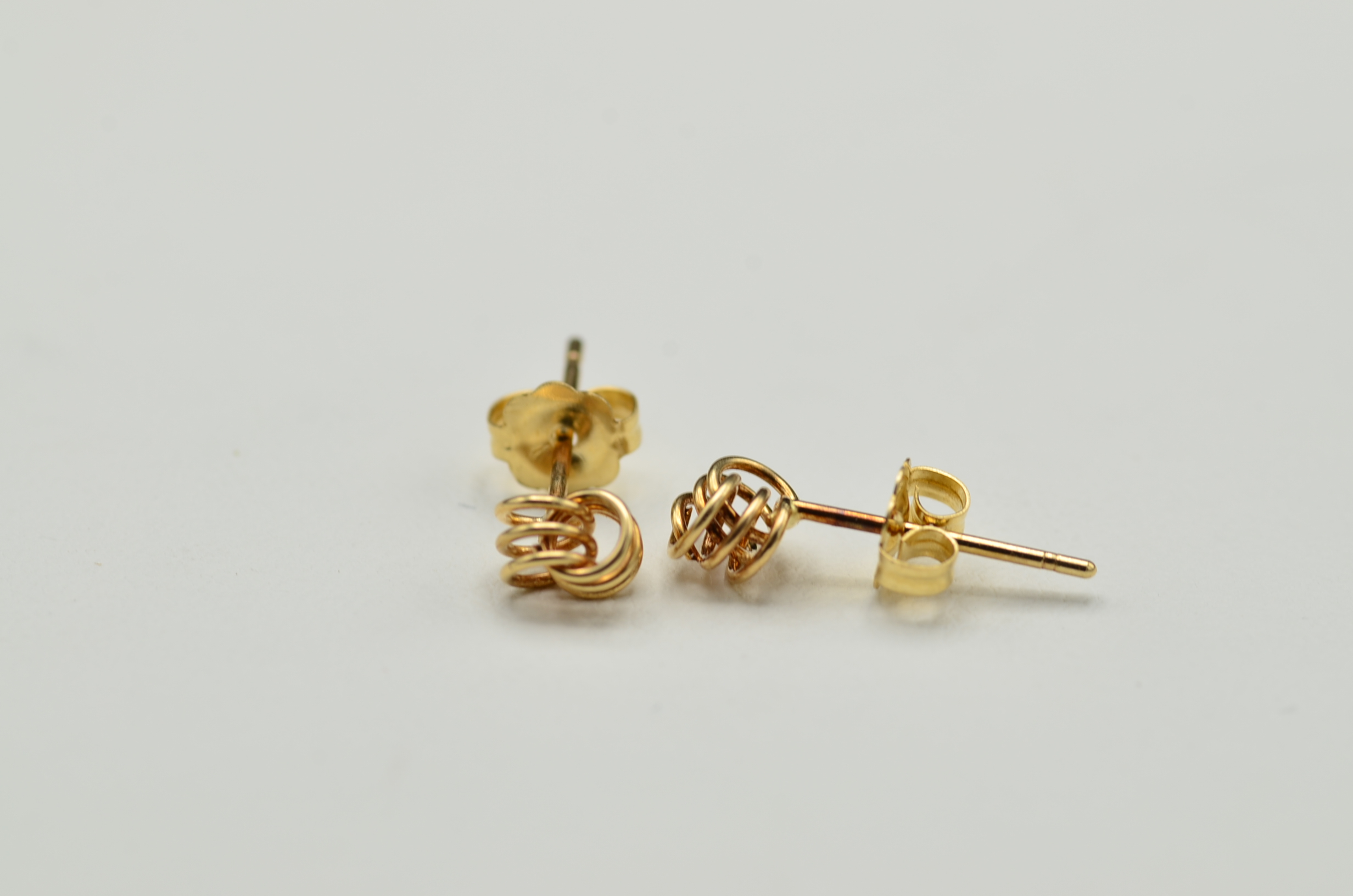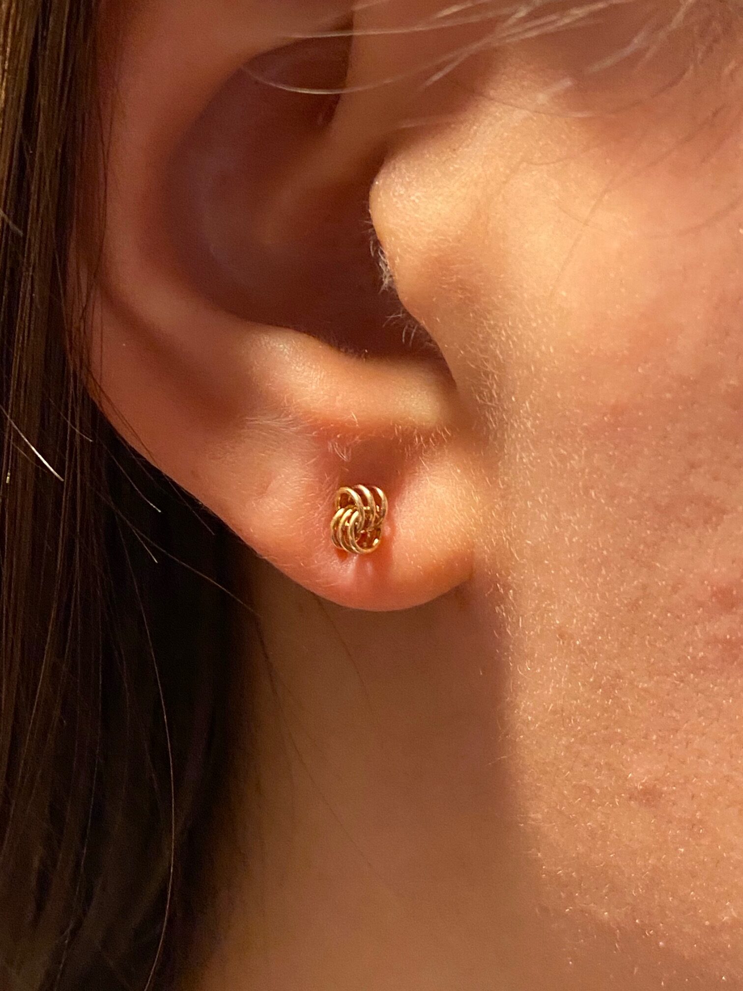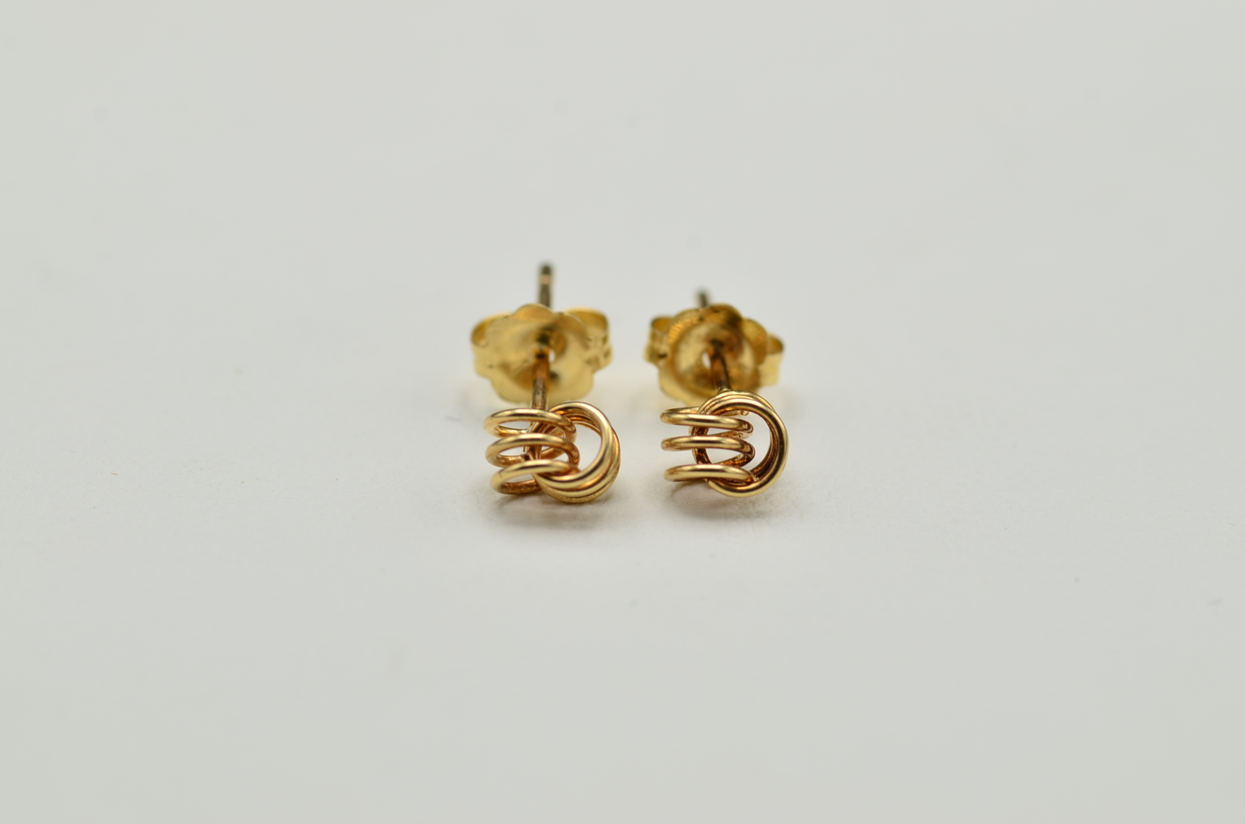 The Bellinis: Petite 14K Yellow Gold Knot Stud Earrings. These everyday studs are lightweight, comfortable to wear with standard posts, and measure approximately 5mm x 4mm in size.