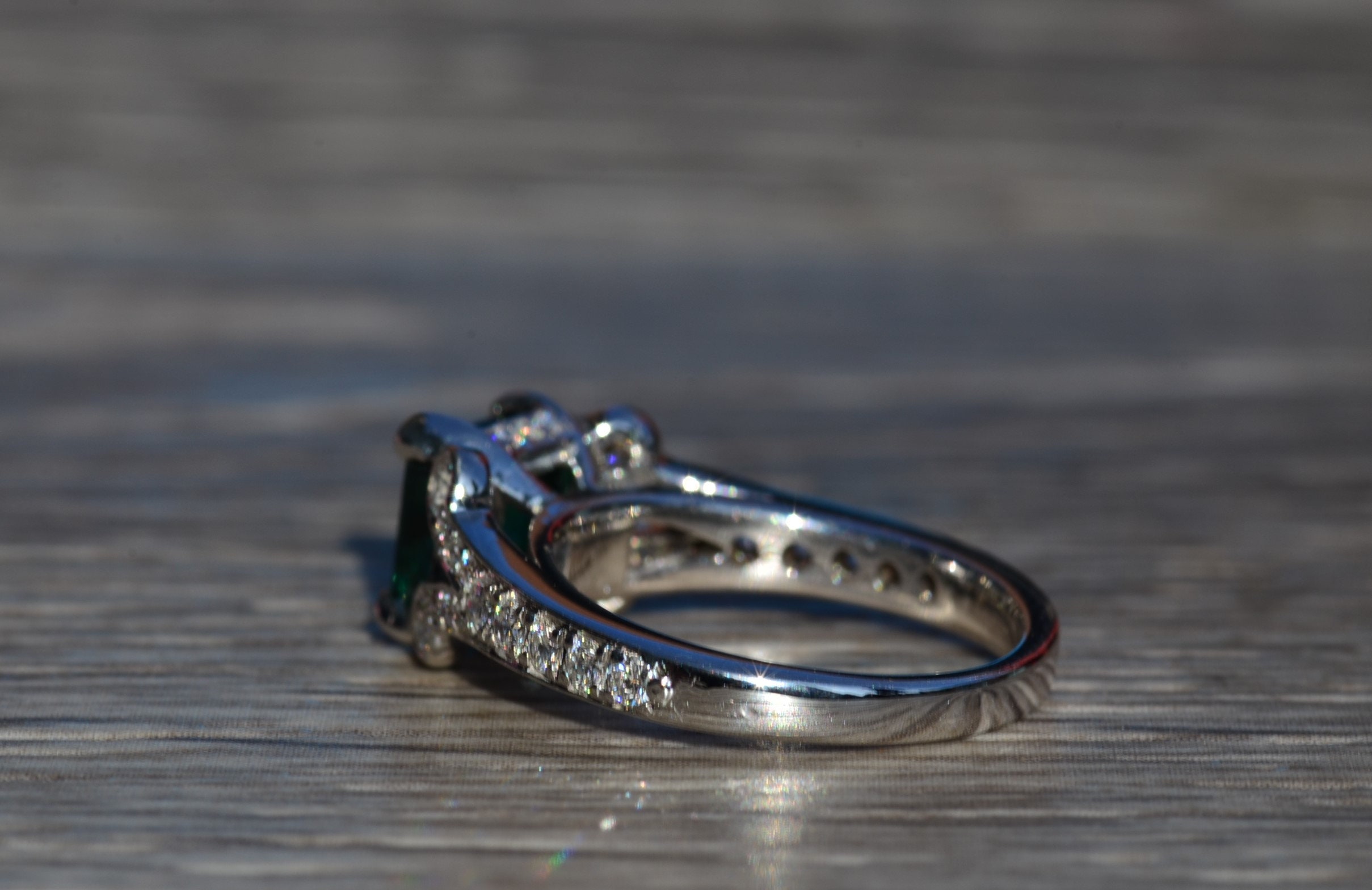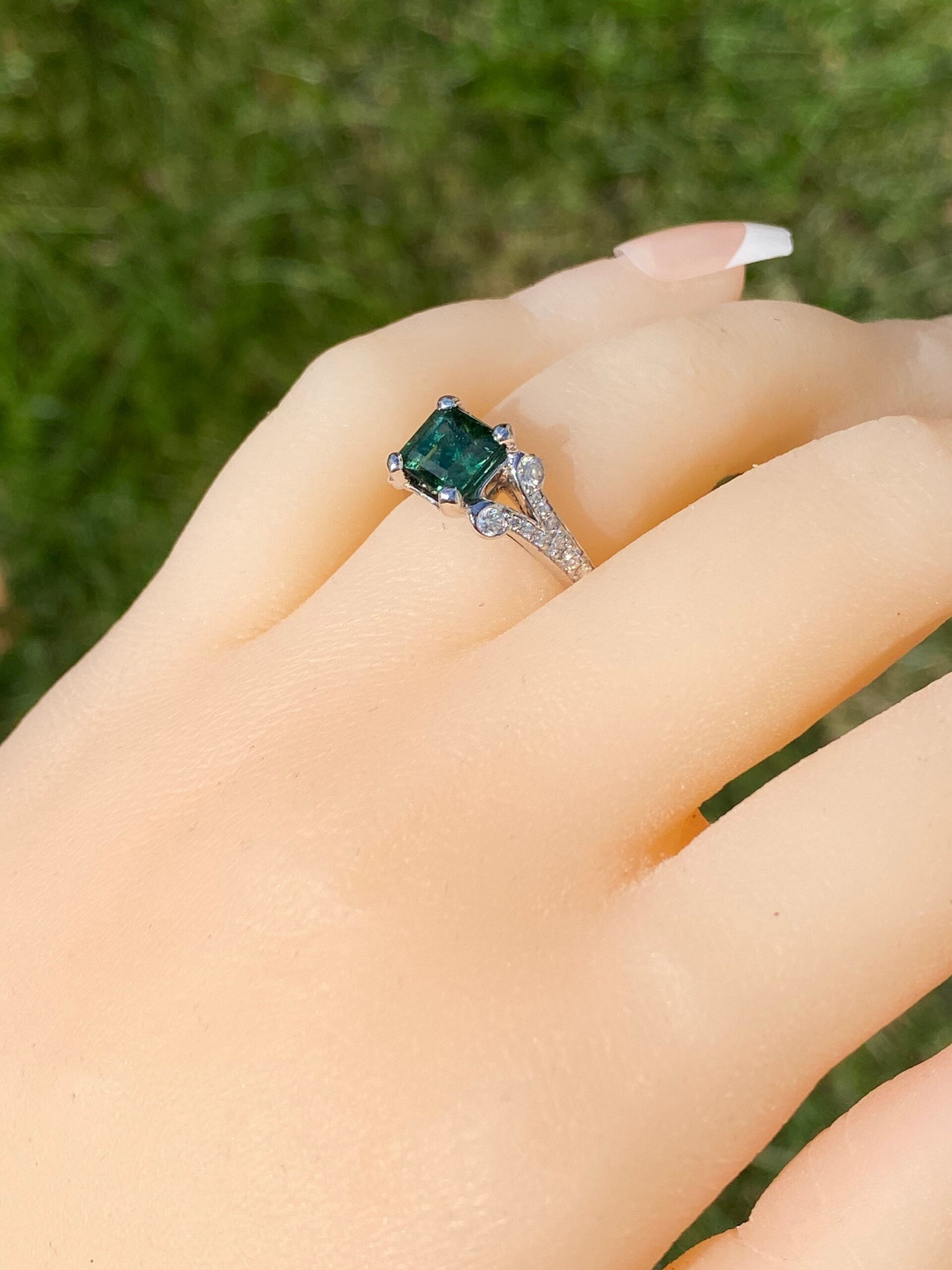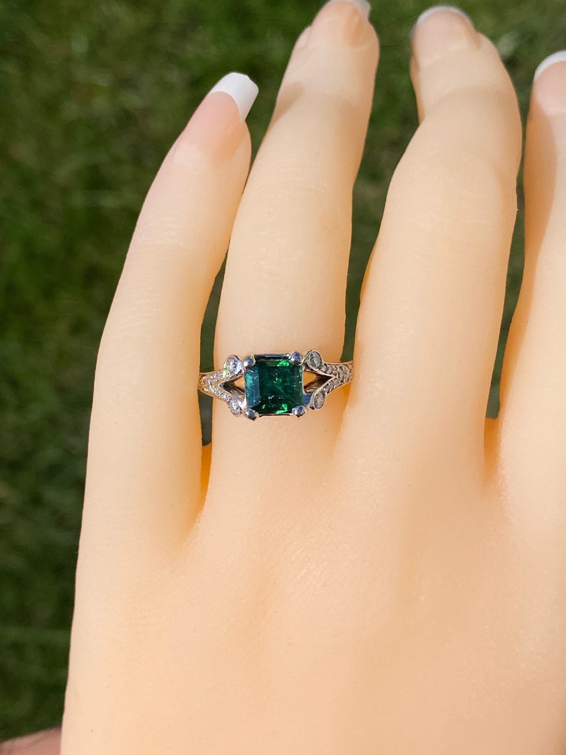 Vintage Tourmaline and Diamond Ring in Platinum. Beautifully crafted in durable platinum, this ladies engagement style ring centers on a 1.60 carat tourmaline. A total diamond weight of 0.50 carats can be found set throughout the mounting adding shimmer and shine. This ring is currently a finger size 4.25 and is able to be resized for an additional charge.