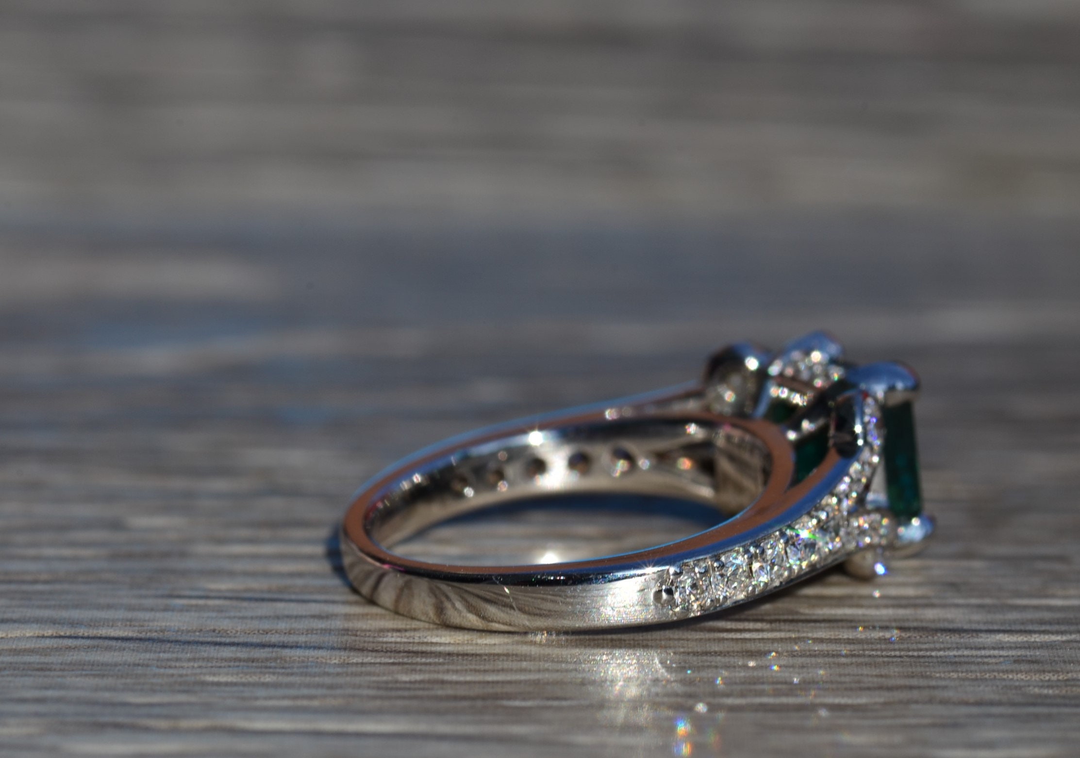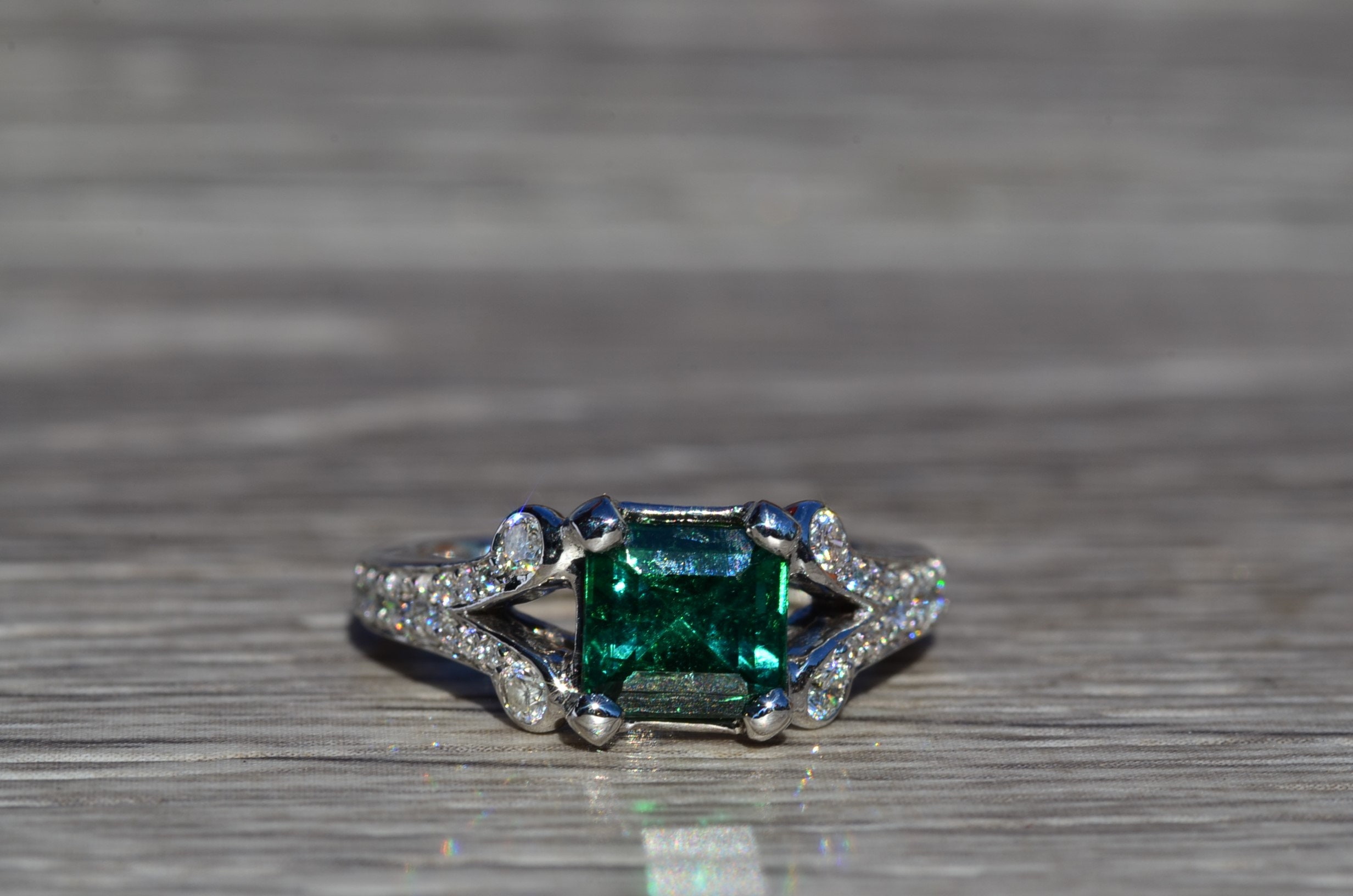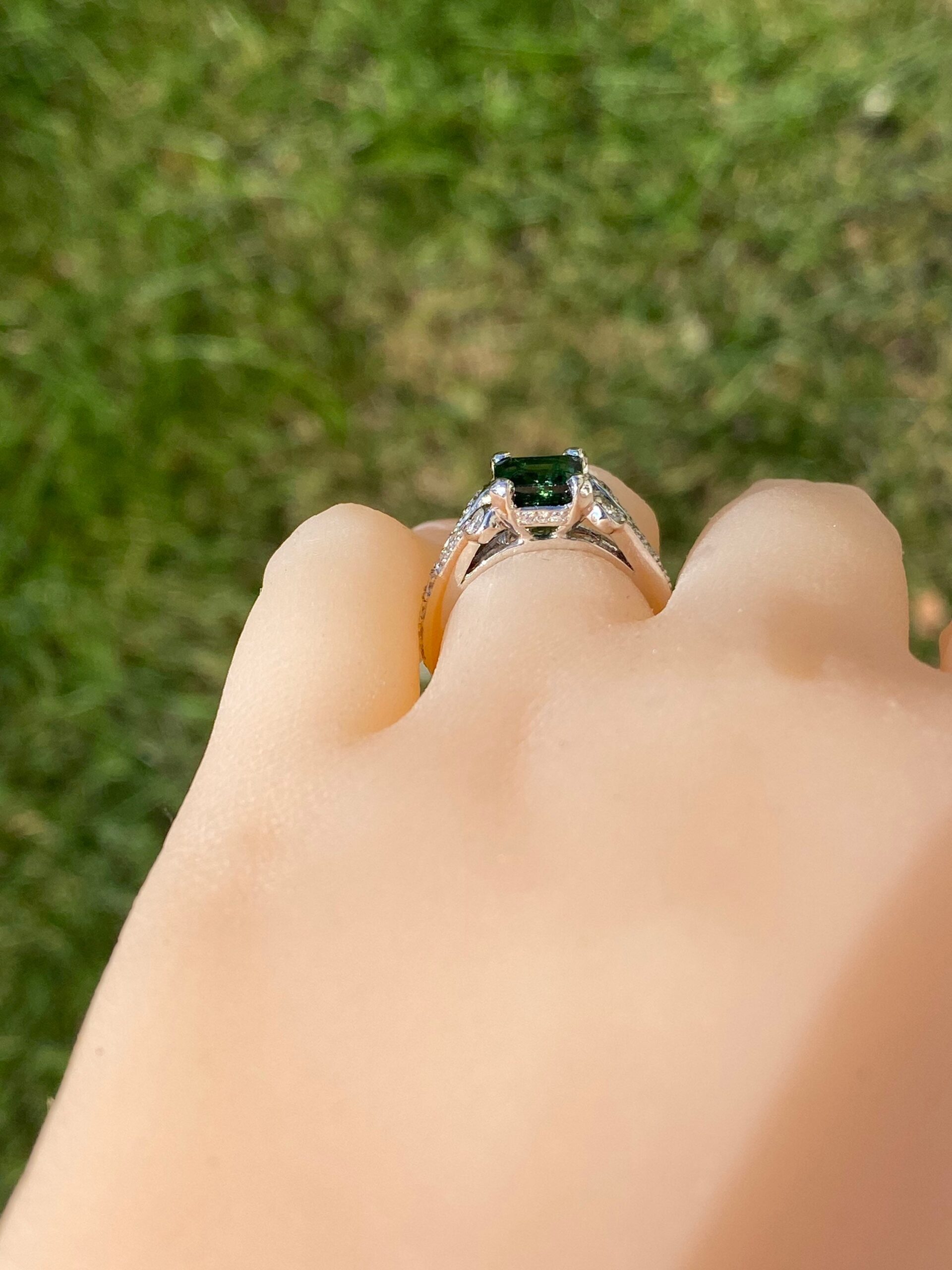 Vintage Tourmaline and Diamond Ring in Platinum. Beautifully crafted in durable platinum, this ladies engagement style ring centers on a 1.60 carat tourmaline. A total diamond weight of 0.50 carats can be found set throughout the mounting adding shimmer and shine. This ring is currently a finger size 4.25 and is able to be resized for an additional charge.